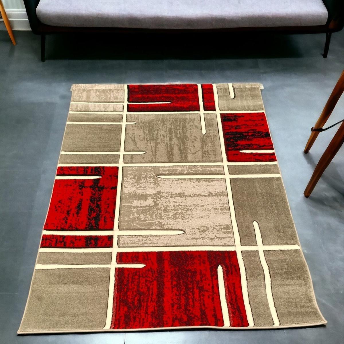Red and Grey Carved Patchwork Living Room Rug - Red / 120cm