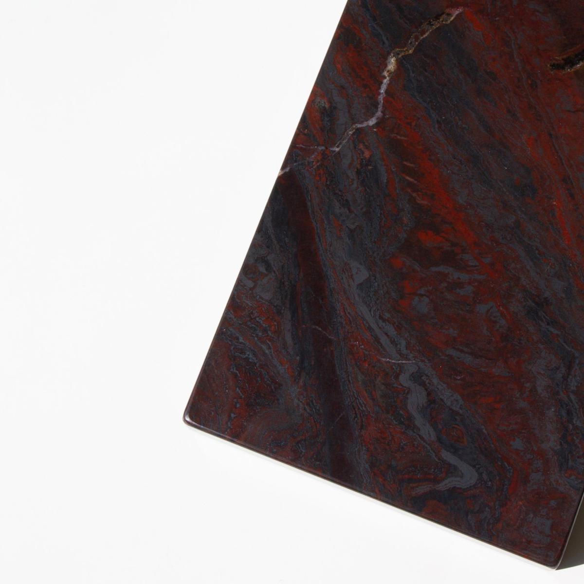 Red hot lava flowing through molten rock with veins of metallic silver make this stone nothing short of a statement. This stone contains actual iron in it, so it sparks when we fabricate it. Made from Brazilian marble.