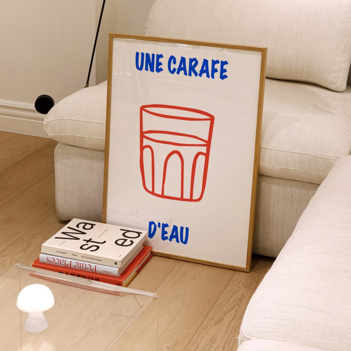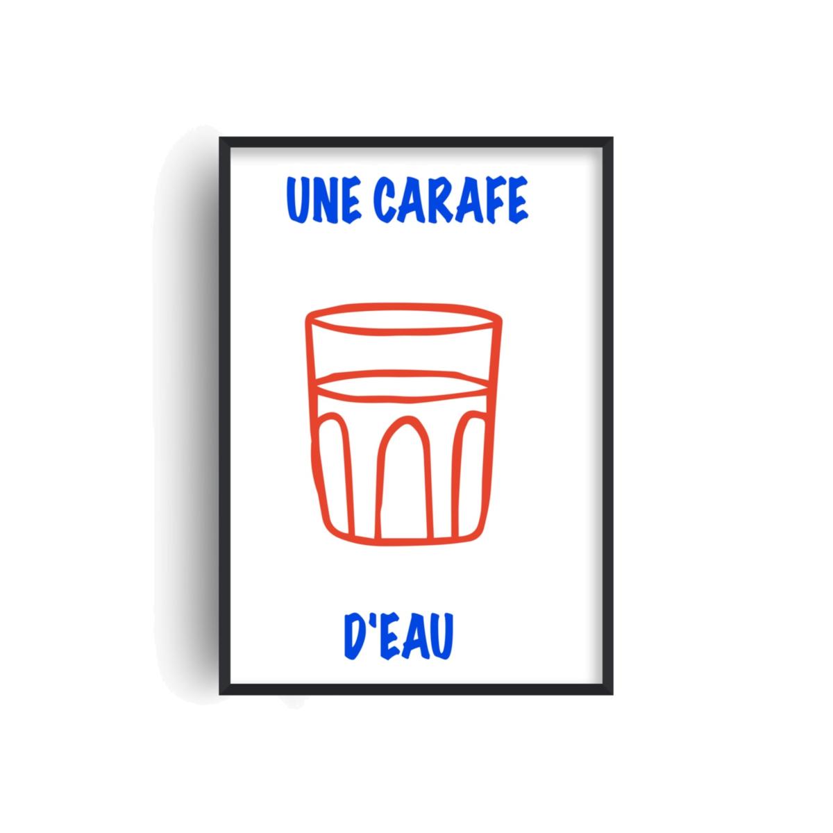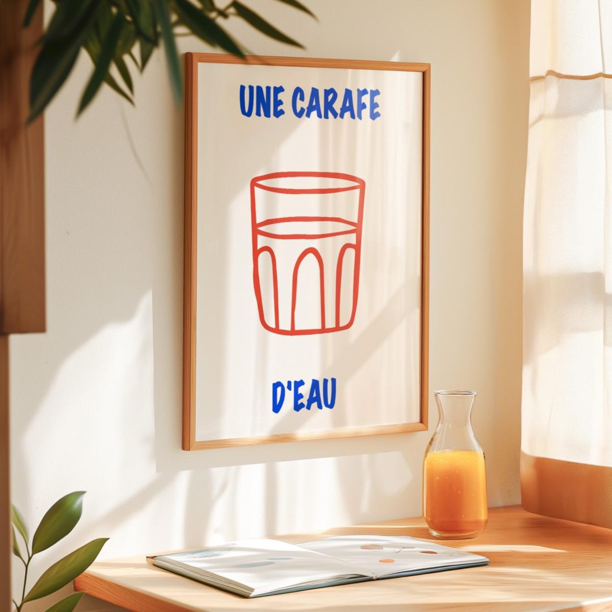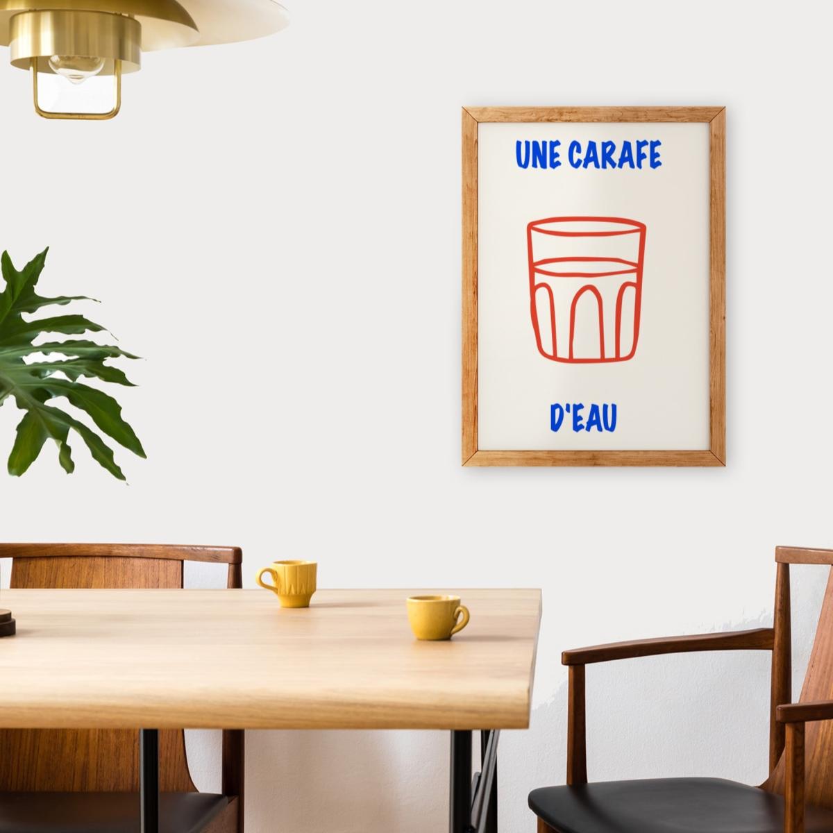 Une Carafe D'eau art print, just like wine, a common phrase in a French bistro, meaning some water please. A reminder to stay hydrated. This playful French art poster is the perfect print for any space. Taking inspiration from childlike drawings and retro bistro posters. Simple yet bold. Sold without frame Giclée printed on Munken pure smooth cream paper which is certified by the Rainforest Alliance Program for FSC® Standards.