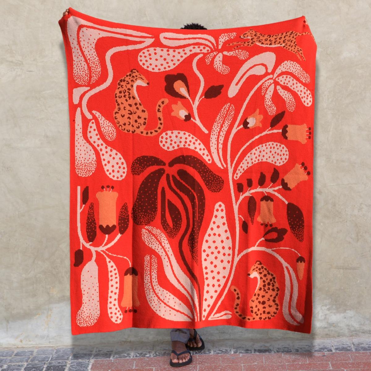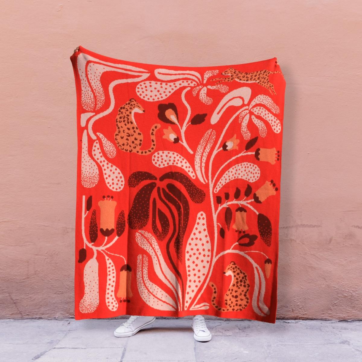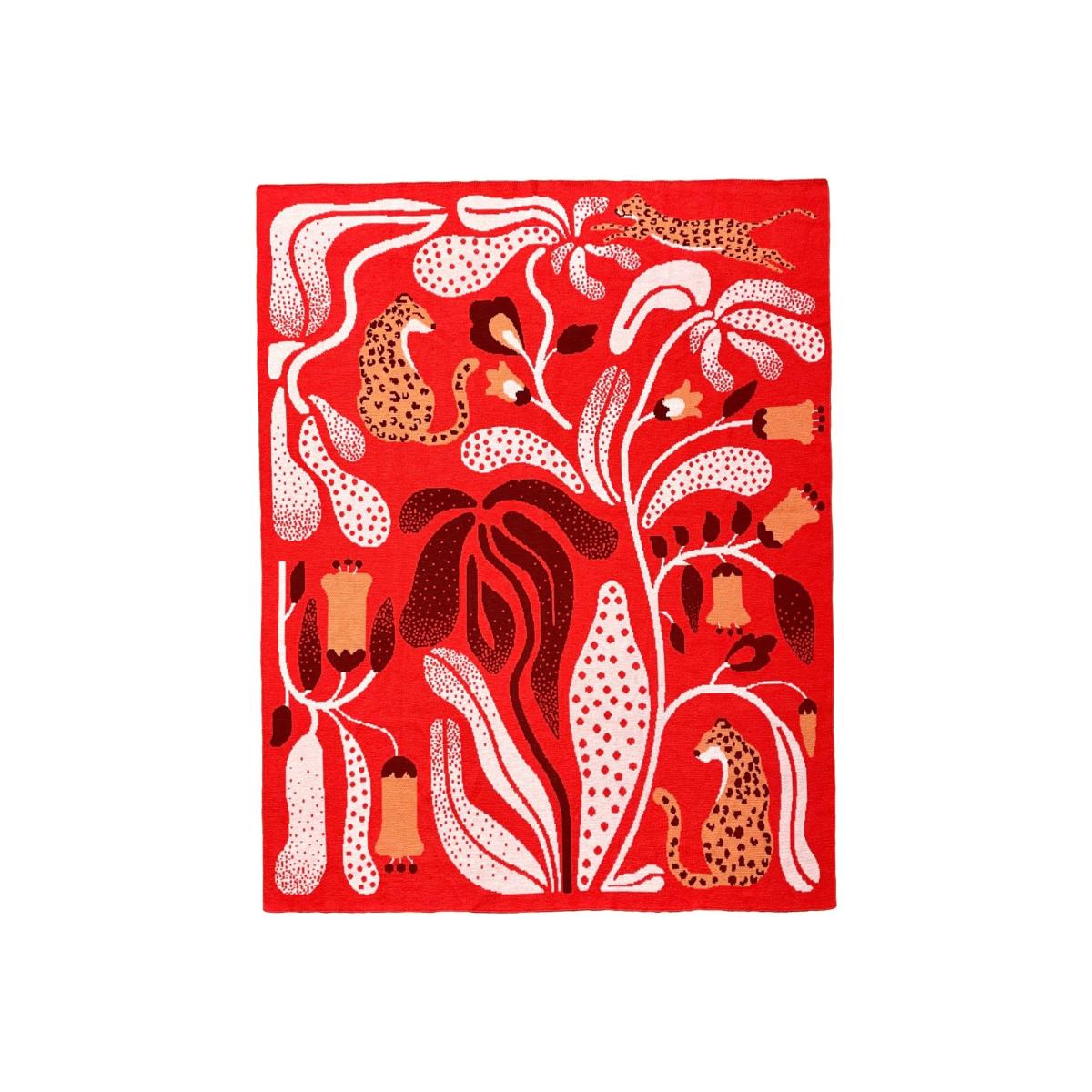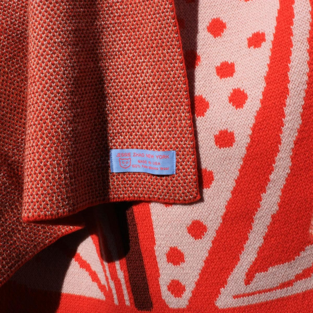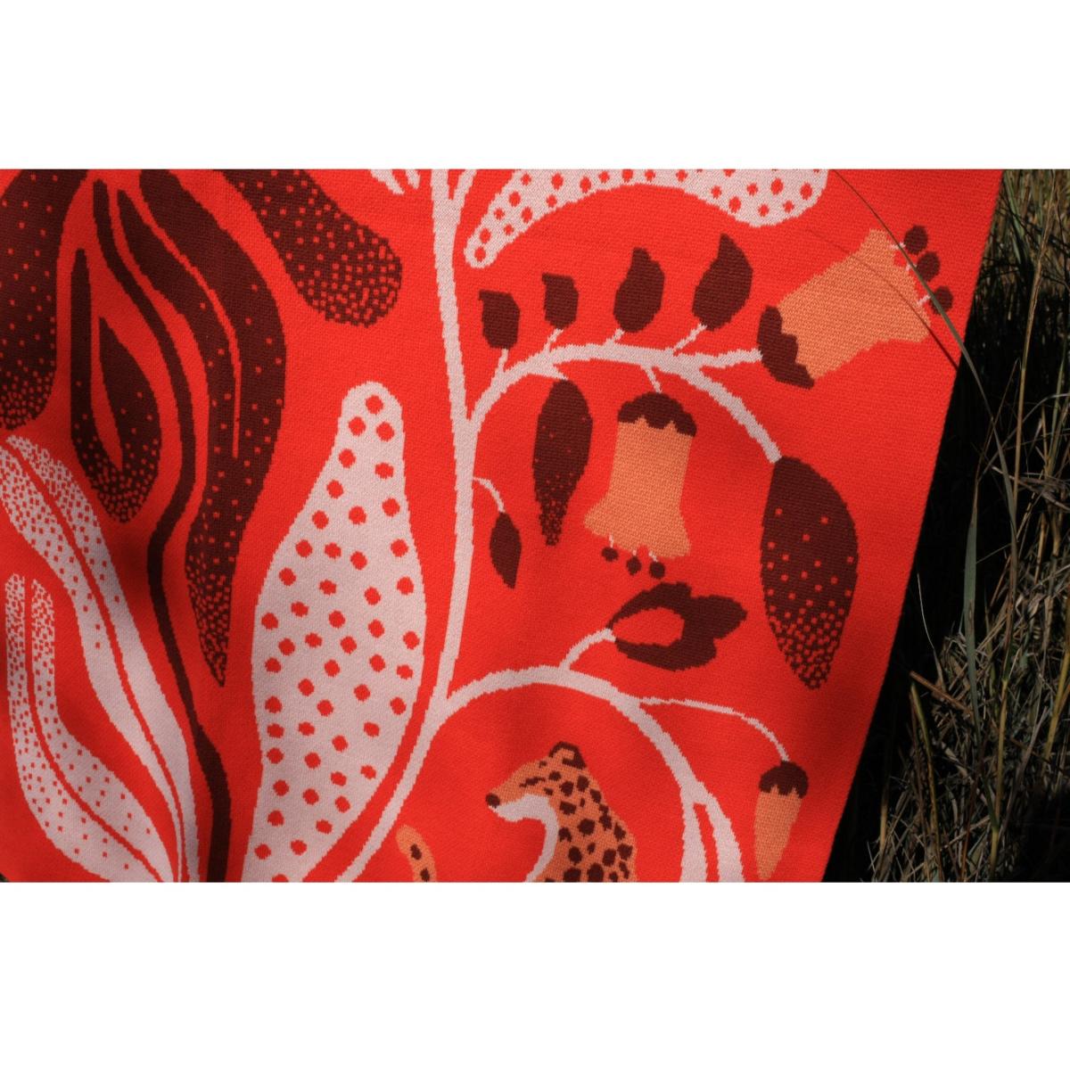 "Red Garden" draws inspiration from the flora and fauna of tropical rainforests. The dominant red hue accentuates a vibrant and passionate energy. It serves as a warm and distinctive gift for holidays. Jessie Zhao's knit blankets are crafted with pride in the New York using 100% Extra Fine Italian Merino Wool. The luxurious, machine-washable blankets are knitted with 100% Italian Merino Wool, ensuring both quality and comfort.