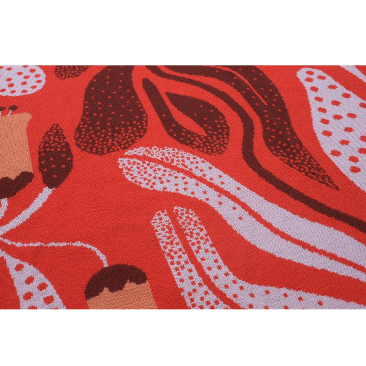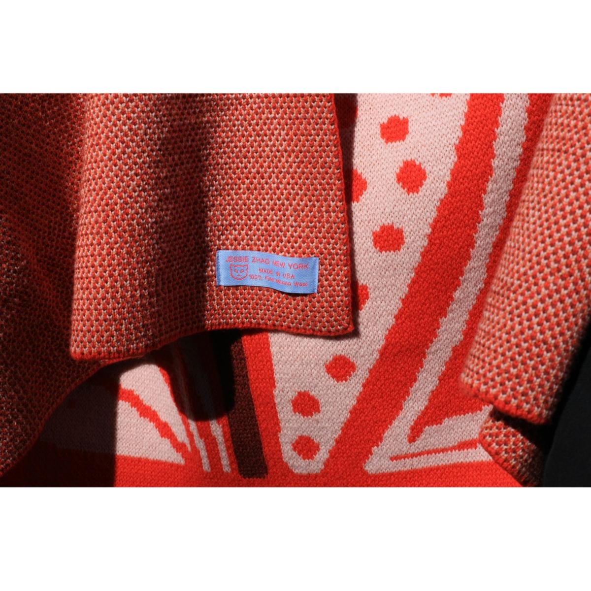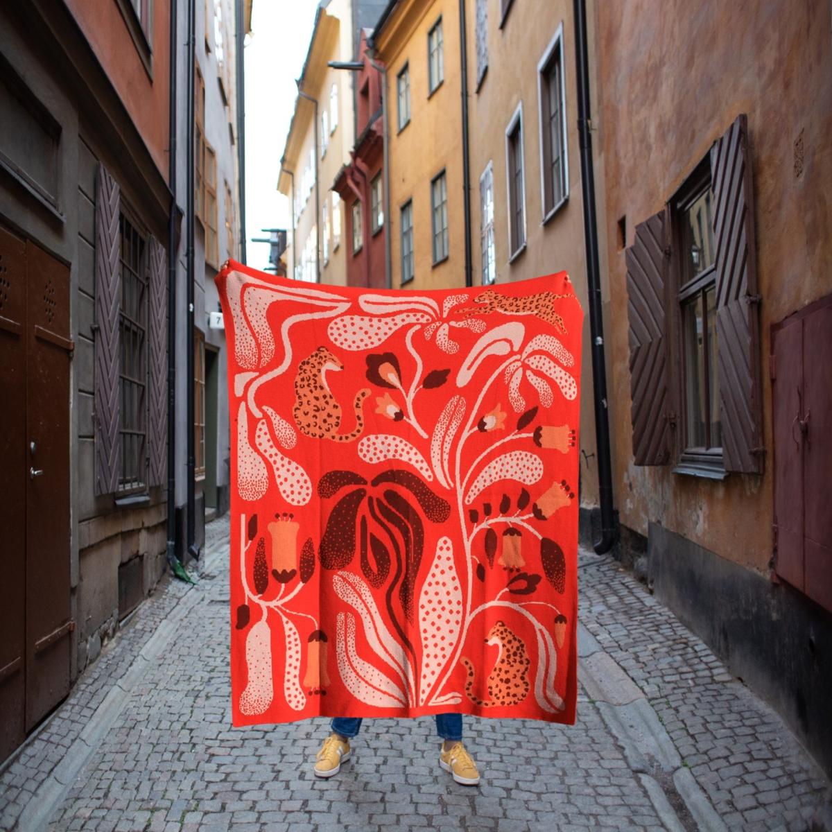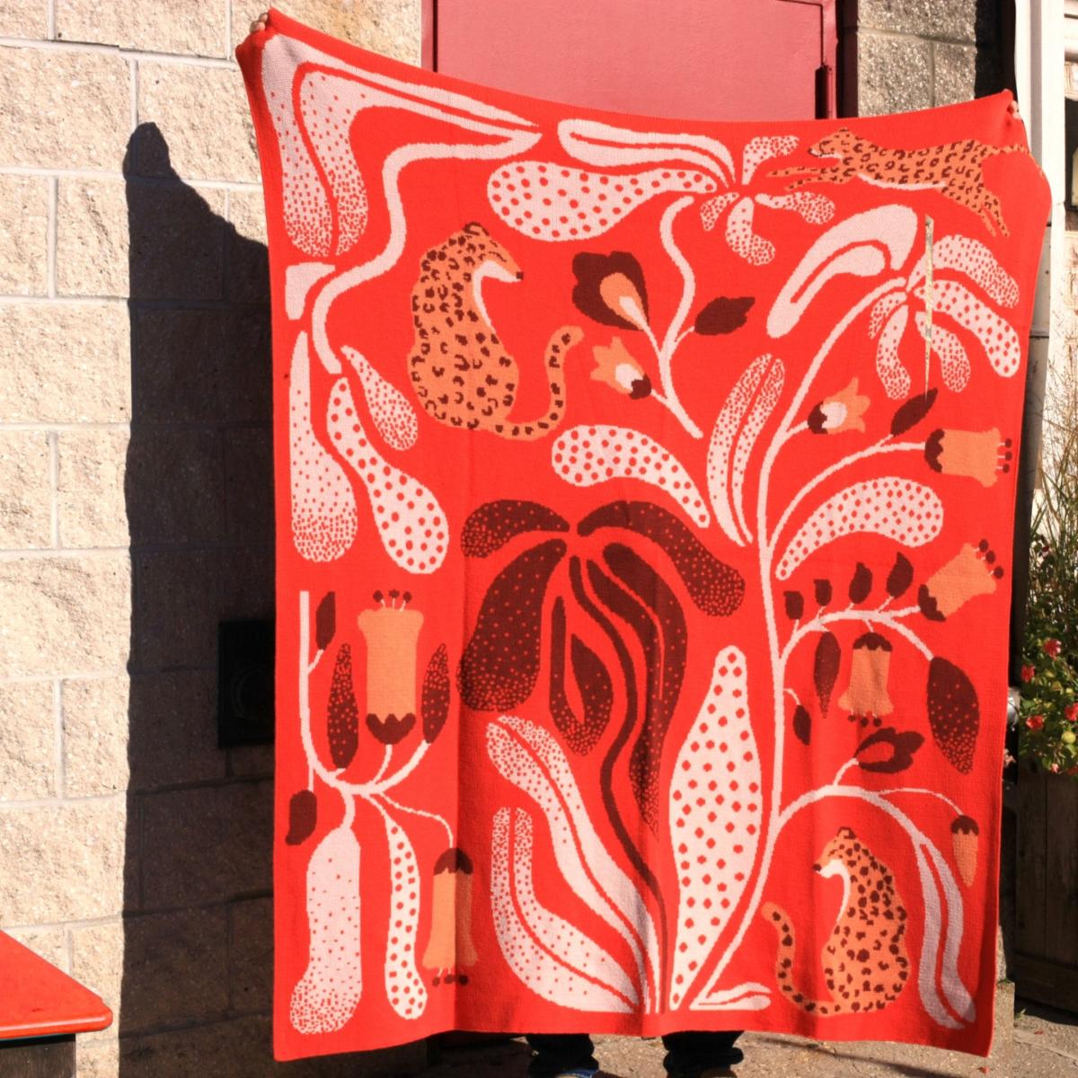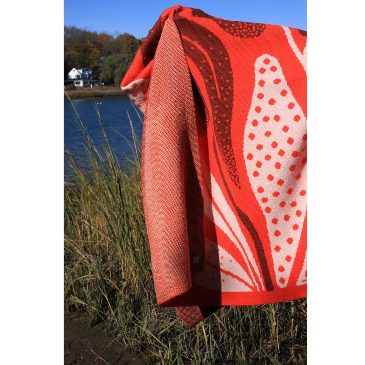 "Red Garden" draws inspiration from the flora and fauna of tropical rainforests. The dominant red hue accentuates a vibrant and passionate energy. It serves as a warm and distinctive gift for holidays. Jessie Zhao's knit blankets are crafted with pride in the New York using 100% Extra Fine Italian Merino Wool. The luxurious, machine-washable blankets are knitted with 100% Italian Merino Wool, ensuring both quality and comfort.