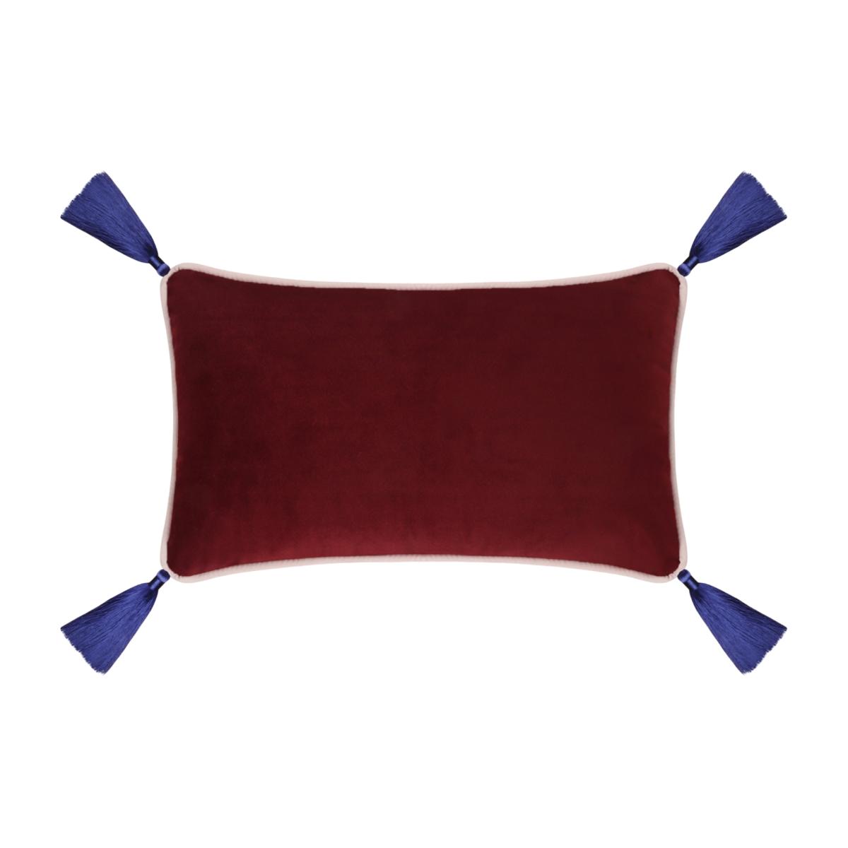 Burgundy velvet rectangular cushion with pale pink piping and blue tassels This rectangular velvet lumbar cushion adds a touch of luxe and cosiness to any room. Handcrafted in small batches, this scatter cushion is made in a wine red velvet with a luxurious feel and finished with pale pink piping and silky deep blue tassels. Composition: Velvet front and back, velvet piping, polyester tassels Includes feather pad Removable cover Discreet zip closure Dry clean only