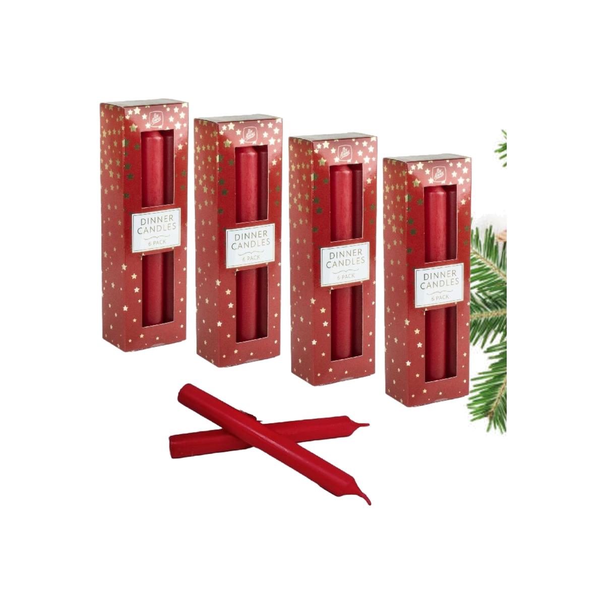 Pan Aroma pack of 6 red dinner candles. This Pack of 6 Red Wax Dinner Candles is a practical and stylish addition to your dining table, creating an inviting and warm ambiance for meals and special occasions. The dinner candles are slender and tapered, designed to fit most candle holders and candlesticks. The elegant tapering design adds a touch of sophistication to your dining table. These candles come in a vibrant and rich red colour, which is a classic choice for adding a bold and romantic or festive atmosphere to your dining experience. The candles are designed to be of standard dinner candle size 19cm approx. a height that fits most candle holders and a burn time of 8 hours, long lasting for the duration of a meal or event. While these candles are ideal for enhancing your dining experience, they are versatile and can be used for other occasions and settings, such as weddings, parties, Christmas or as decorative elements in your home. The warm and inviting glow of red dinner candles creates a cosy and intimate atmosphere, making them perfect for many celebrations, and everyday meals. Red dinner candles can serve as a stunning and classic centrepiece for your dining table, adding elegance and charm to your meals.