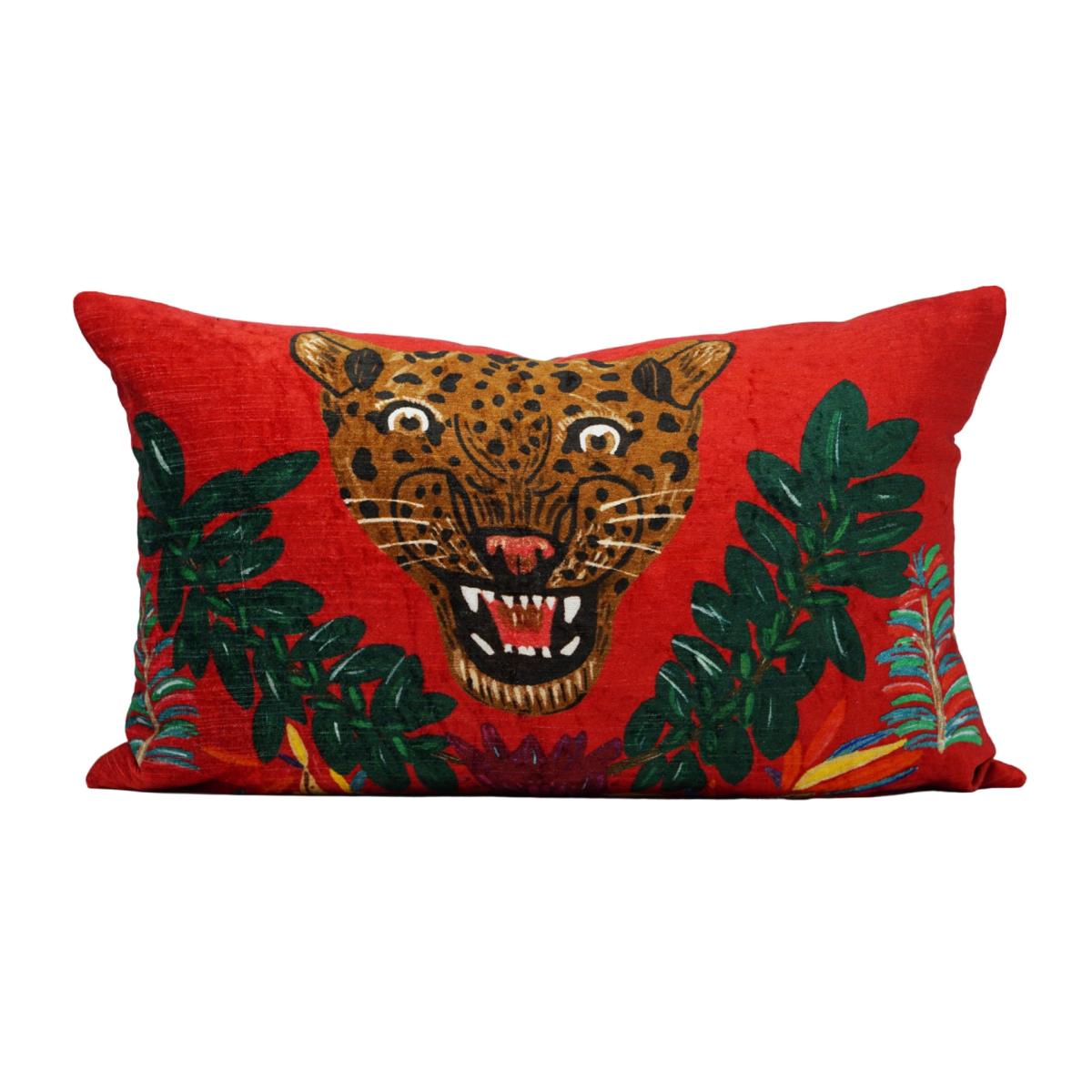 With a ferociously, luxe motif, our Fierce Leopard series offers shimmery looks in four different jewel tones. The design of each lumbar pillow is a kaleidoscope of eclectic patterns, from the large head of the leopard to the tropical botanicals surrounding it. This pattern has been hand-painted and digitally printed on a luxe velvet fabric. - 14x22" Pillow Cover - 100% Polyester Velvet Front and 100% Polyester Velvet Back - Cover Only - Knife Edge Spot Clean Only
