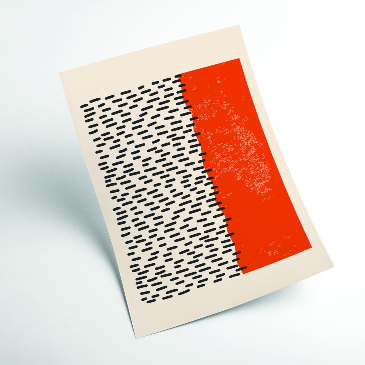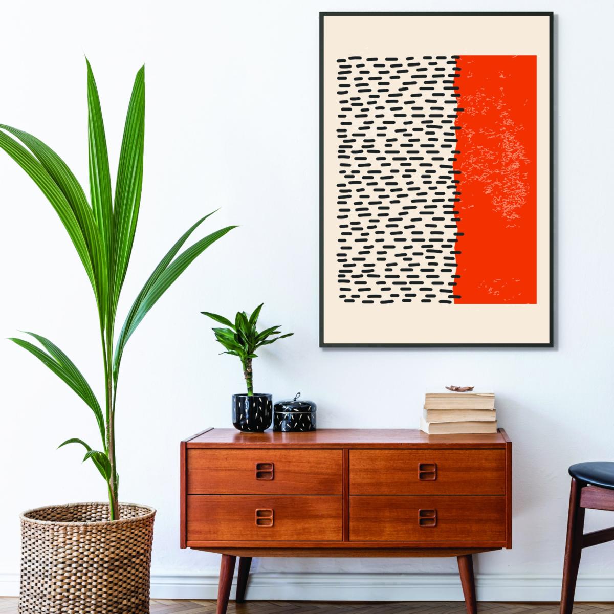 I love this small print for its bold, graphic style and vibrant pop of colour. It works particularly well in contemporary or minimalist interiors, where its geometric pattern can add visual interest without overwhelming the space. It’s versatile and can sit nicely on a feature wall or serve as a complementary piece among more neutral artworks. For styling tips, try pairing it with simple framing, like a sleek white or black border, to keep the focus on the design. It also pairs well with furniture that has clean lines or accents in similar reds or blacks, creating a cohesive look. Perfect for injecting colour and modern visual punch into a compact space such as a home office or living corner.