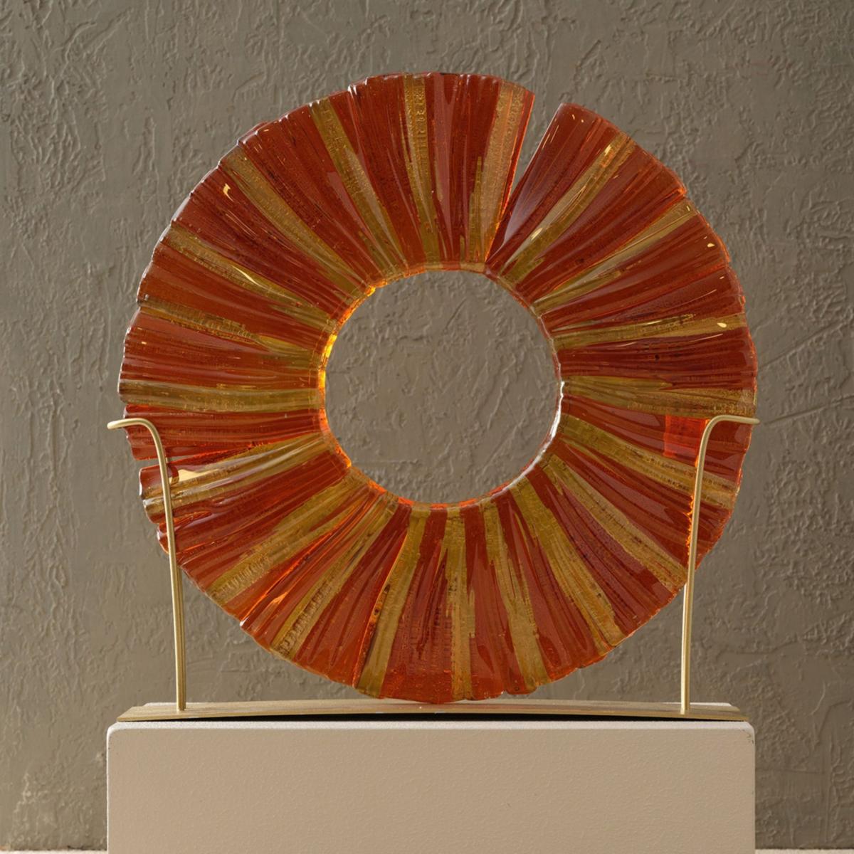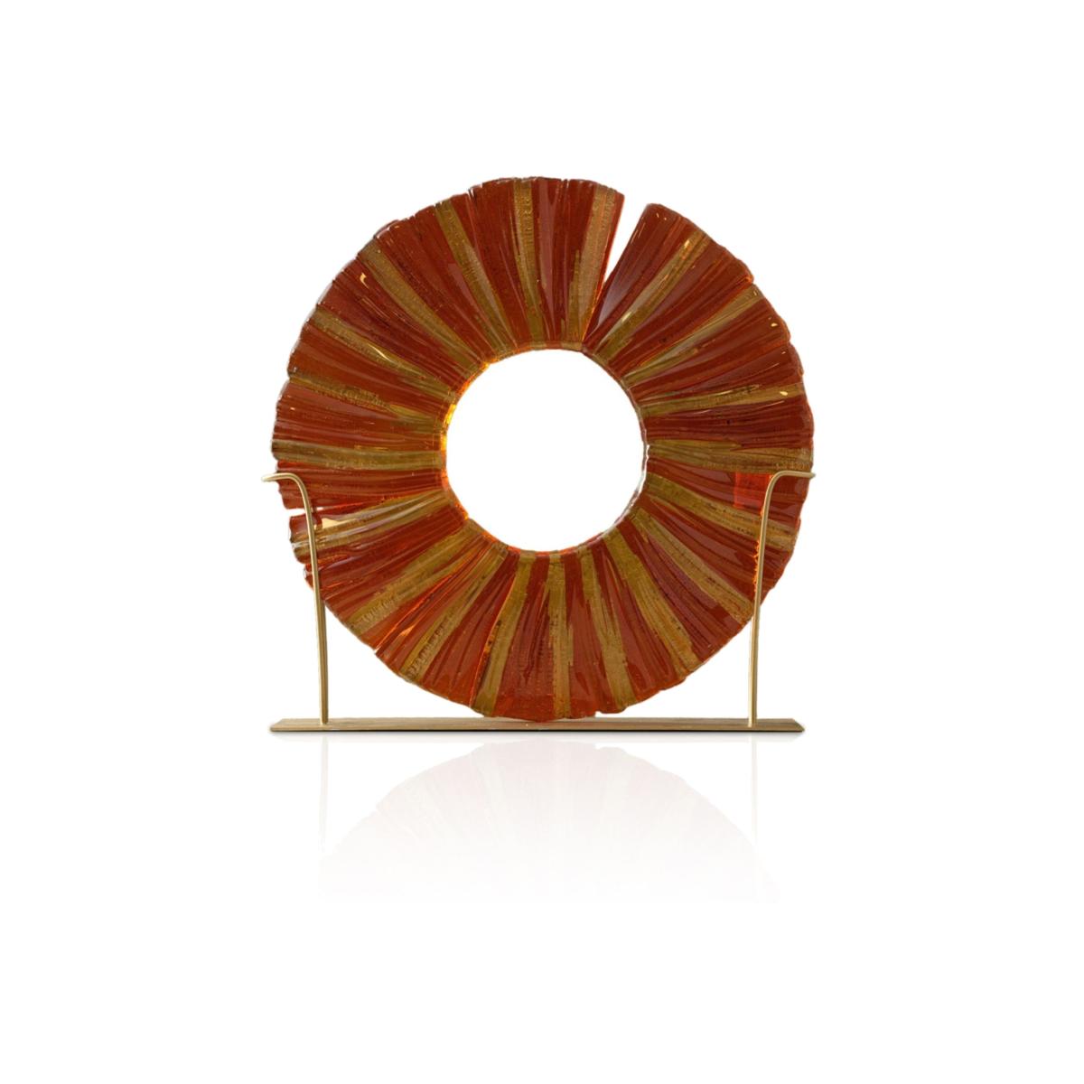 Ignite your space with the bold elegance of the Hand-Blown Glass Disc Decor in Fiery Red & Gold. This striking piece features dynamic streaks of deep red fused with shimmering gold, creating a dramatic contrast that radiates warmth and sophistication. Crafted from high-quality hand-blown glass, the textured surface reflects light beautifully, while the minimalist metal stand adds a contemporary touch. Perfect for modern, eclectic, or bohemian interiors, this decor piece serves as an eye-catching centerpiece for shelves, mantels, or side tables.