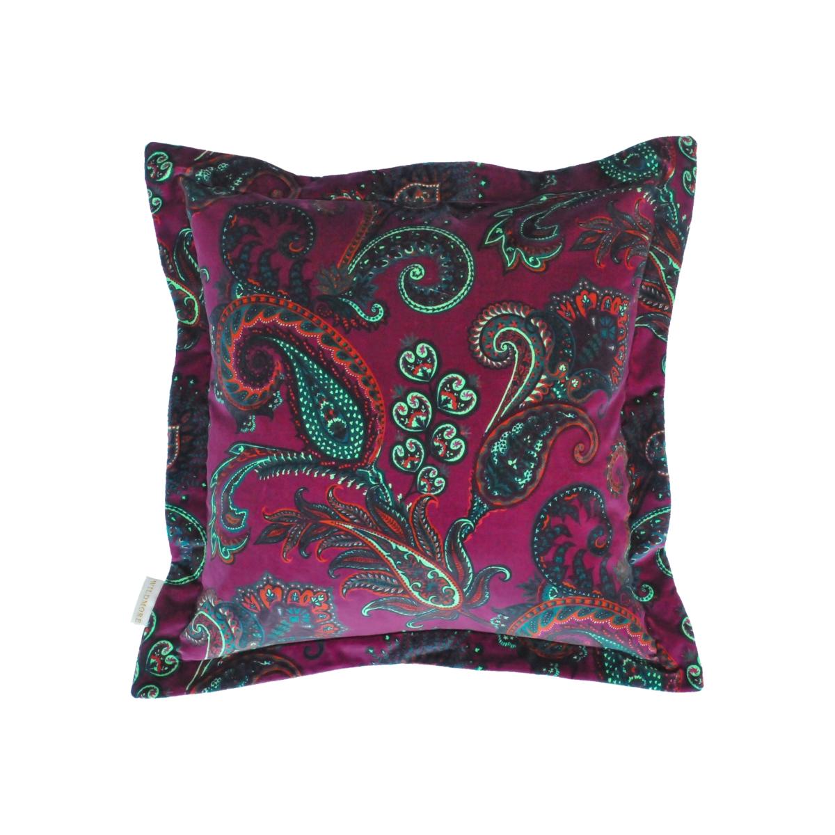 The opulent design of the Sassani print is enriched by its luxury cotton velvet base, giving it depth and grandeur. The Gaea colourway combines deep tones of burgundy and russet with vivid green and teal, allowing it to harmonise with any space. This large and luxurious cotton velvet cushion is hand sewn in the UK and has a grand oxford border design.