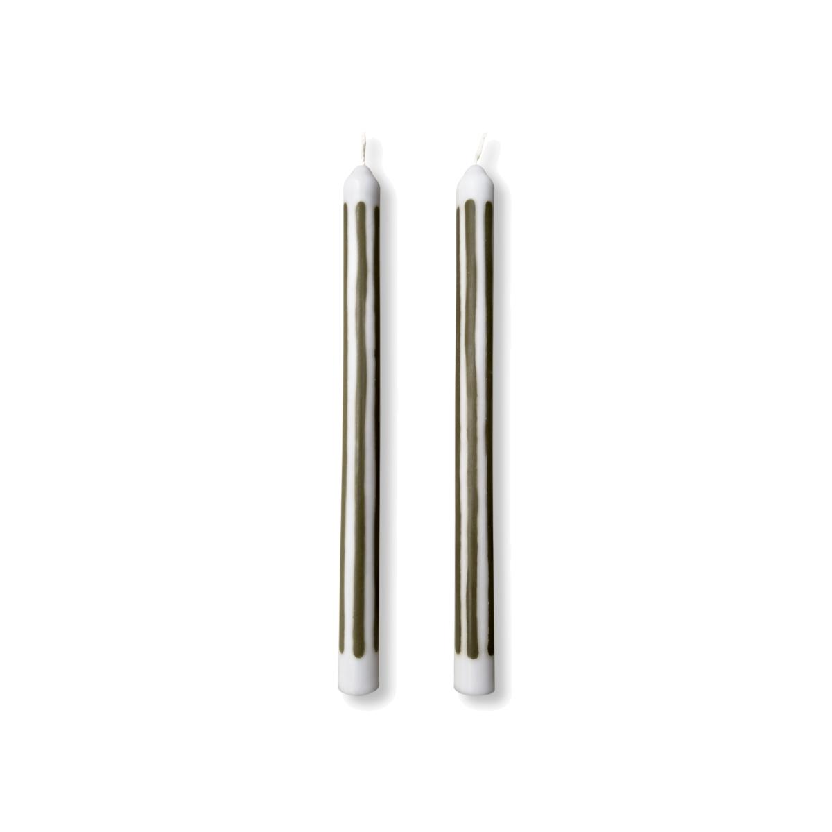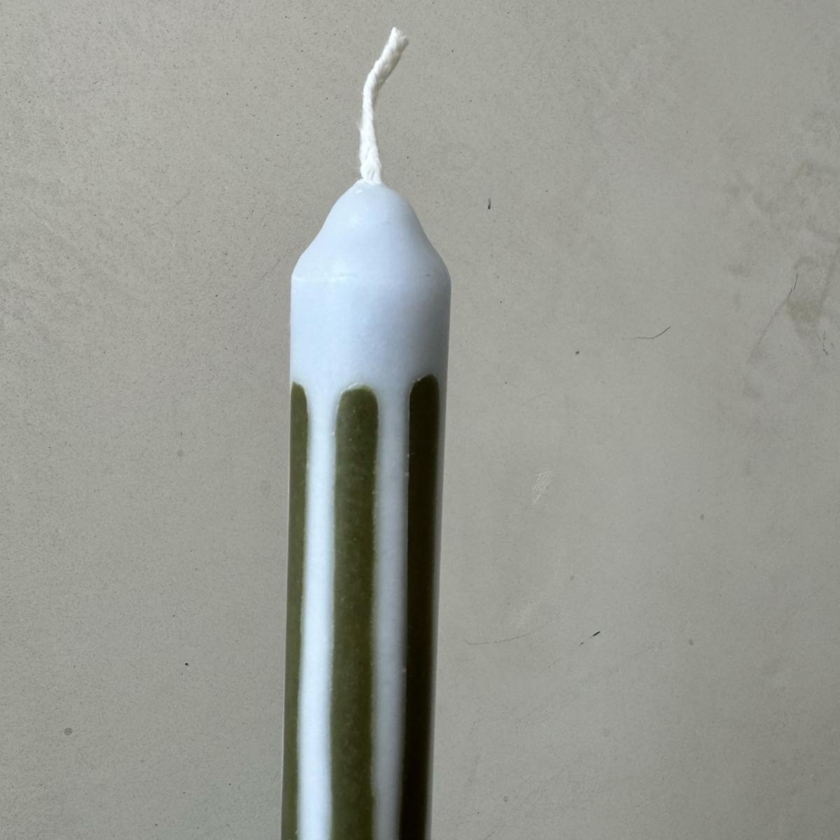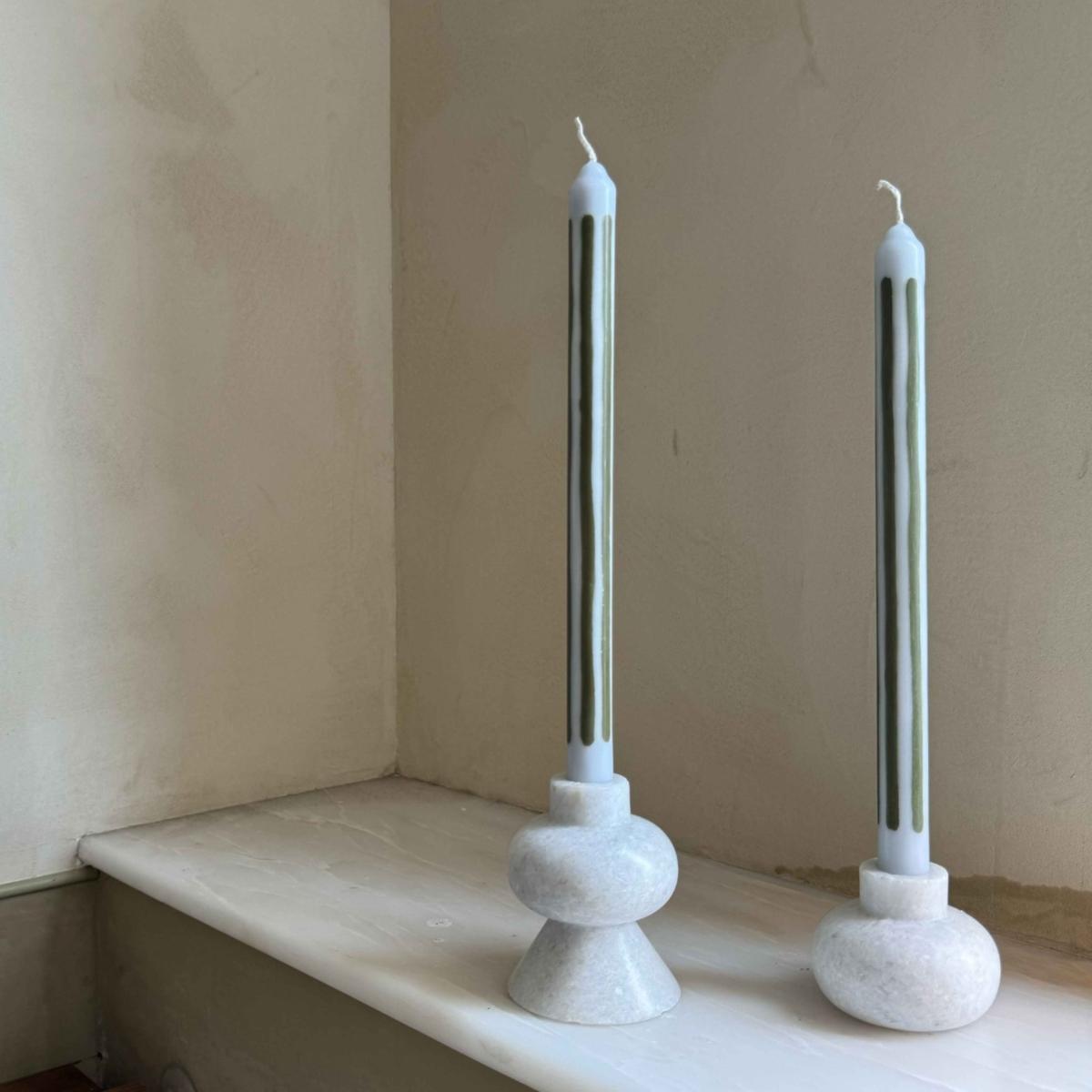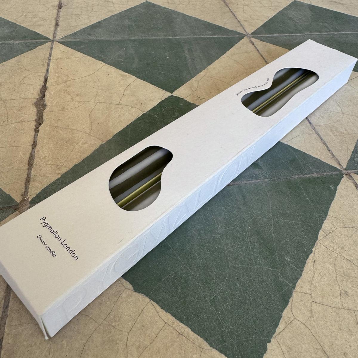 Pair of two dinner candles, hand-poured into loose stripes of duck-egg blue and olive green vegetable wax. Dinner candles like you've never seen before - hand-poured using 100% natural wax, natural dyes and pure cotton wicks. Pygmalion candles are designed for the joy of hosting: good food, great company and memorable ambience. The packaging was dreamed up using this same ethos - bringing luxury, design, sustainability and fun together to create the perfect gift. The candles are 29cm allowing for a leisurely 10+ hour burn time.