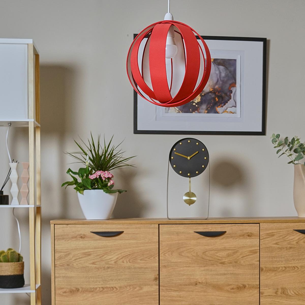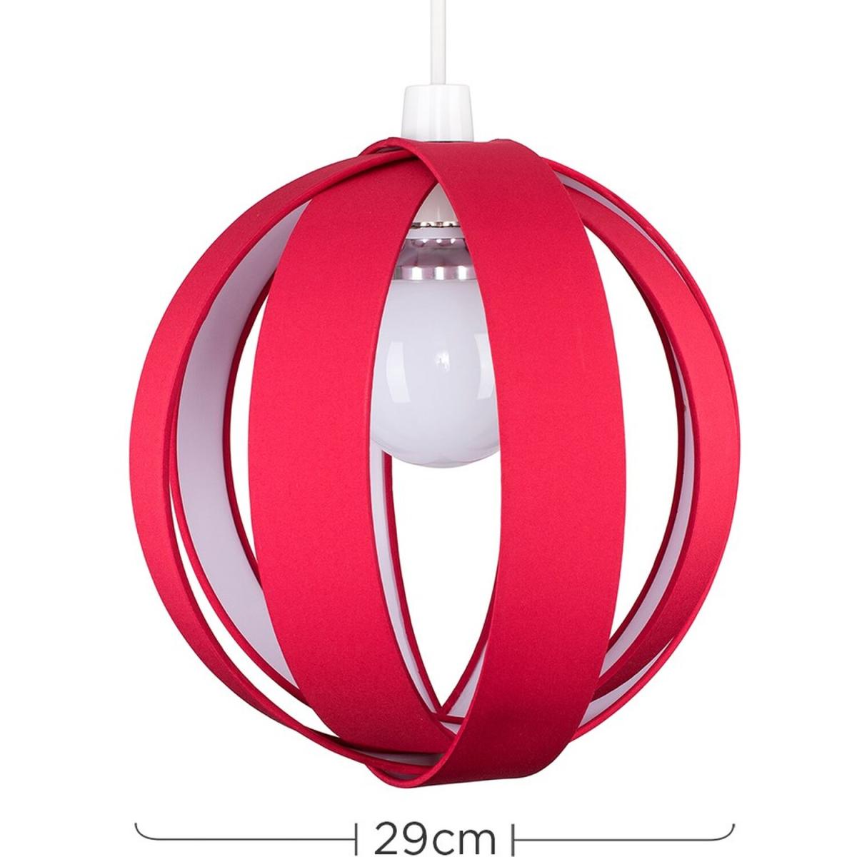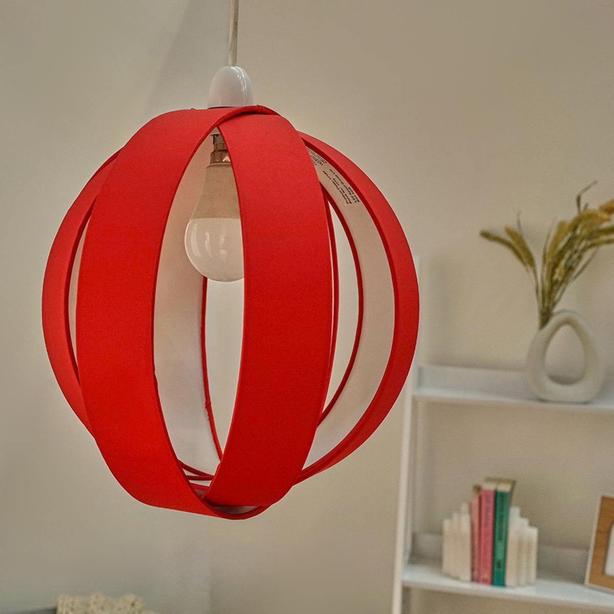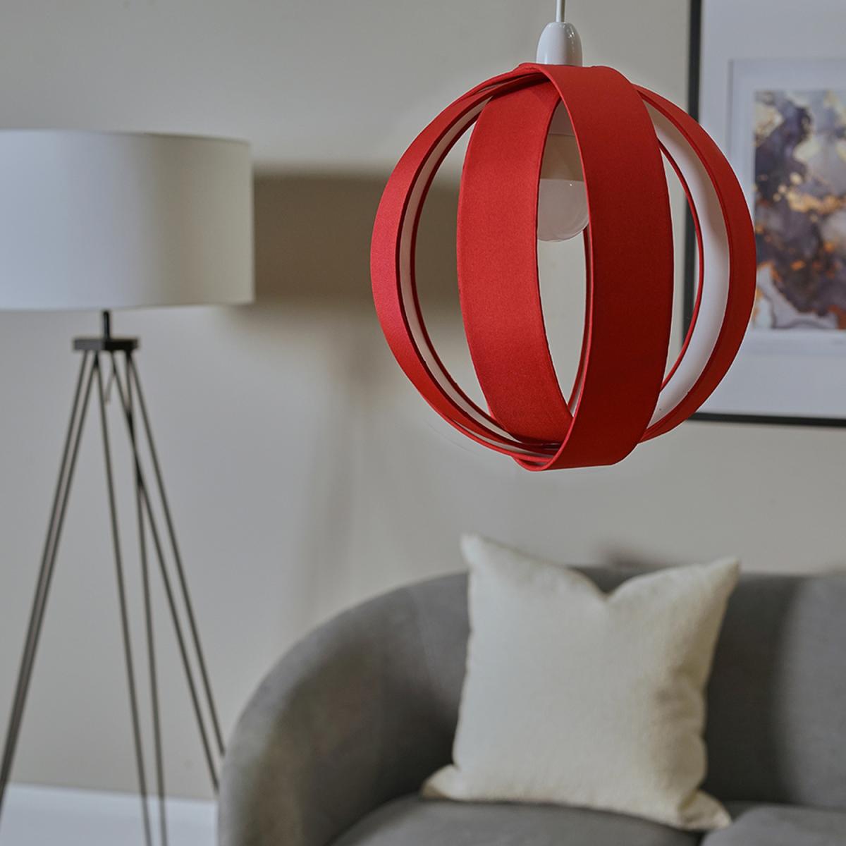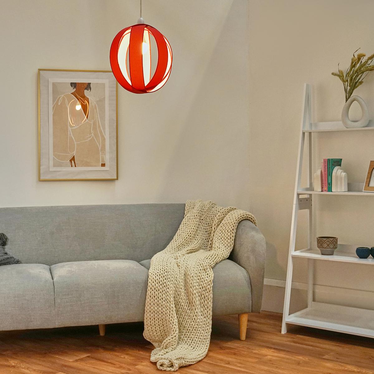 Modern ceiling pendant light shade in red with light reflecting white inner surfaces. Features a series of four circular layers which form an unusual cocoon design. Easily fits to your standard ceiling light socket - no wiring required. Please NOTE Some self-assembly is required. Four circular sections of the shade need to be spread out in to a globe shape once fitted on to the lampholder. A non electric ceiling pendant shade is a quick and economical way to update your room in seconds! Easy to fit to your existing lamp holder - no electrician required. Suitable for use with a general domestic or energy saving bulb.