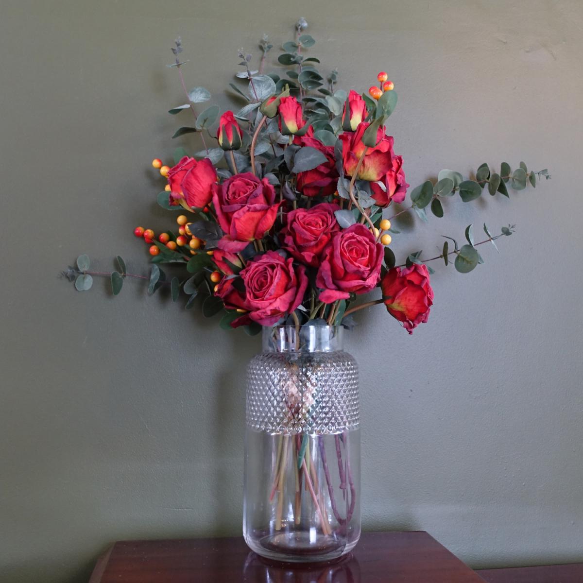 These artificial flower arrangements come with the vases a complete pack of everything you need to create the display shown in our photos. Sizes given in item specifics are the overall measurements when arranged as shown in our pictures. Sizes of individual stems vary and are given in the following description. Stems are wired and this can be shaped to your requirements. This pack contains the following 1 x LEAF-40585 29cm clear glass diamond vase 29cm tall x 15cm x 15cm at widest points and the slightly narrower top rim measures 10.5cm diameter. 3 x LEAF-40618 60cm red rose artificial flowers spray each with four flowers and three buds. 2 x LEAF-40650 70cm artificial orange berry spray. 3 x LEAF-40659 100cm artificial eucalyptus foliage. Flowers and foliage are supplied loose at full length ready for you arrange. You can cut these shorter if wanted for arrangement (very easy- just use wire cutters) or you can just fold the stems at the ends before putting them in the vase