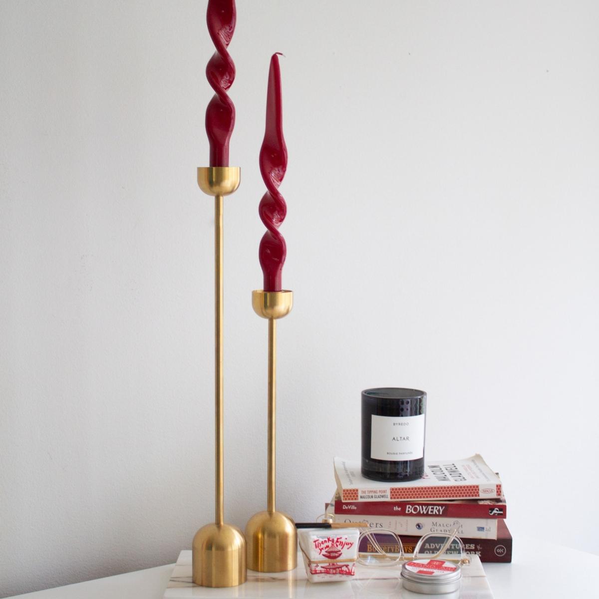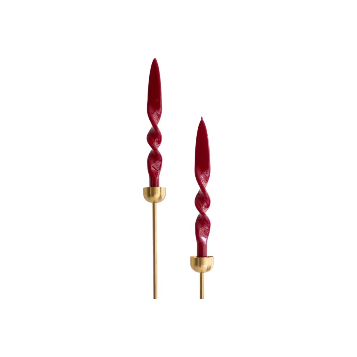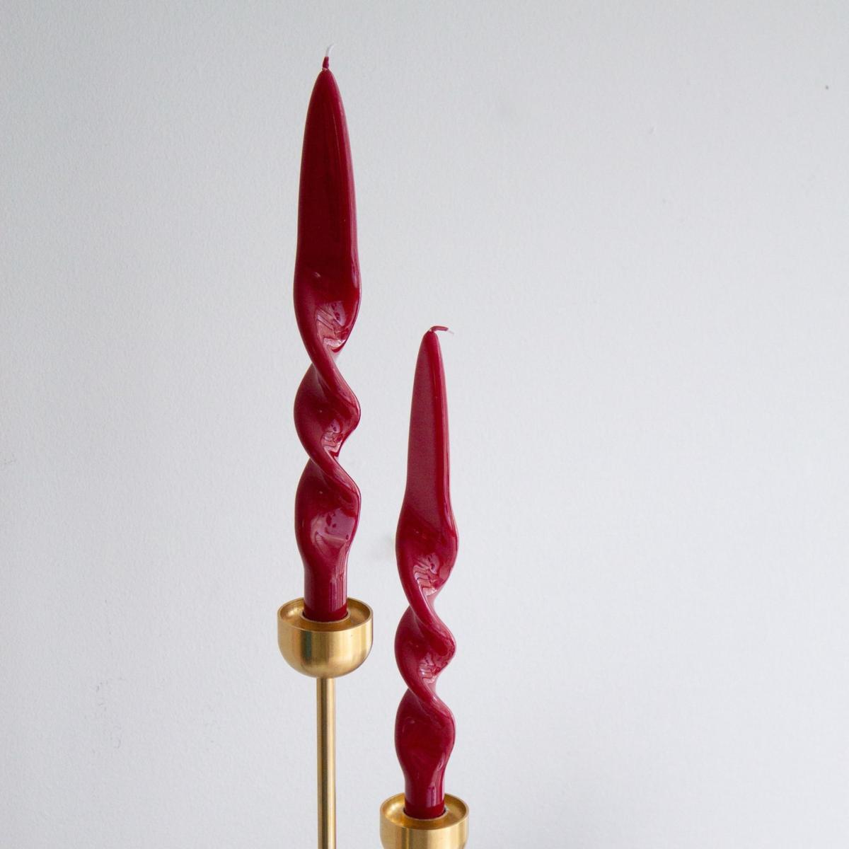 High-gloss taper candles in ruby that are nothing but chic. style them sky high on minimalist candle sticks or grab your heirloom / vintage ones and adorn your holiday table. quite the accent for all forms of decor (boho, vintage, retro, minimalist, etc.) finished by hand from an italian family that has been making candles since the 1800s.