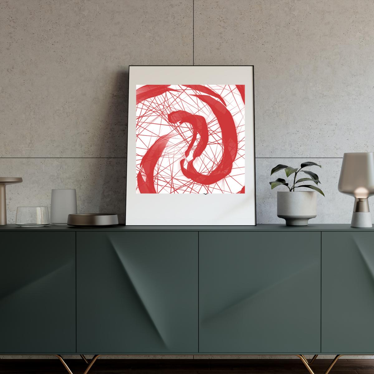 I really like this print because of its bold, dynamic design and vibrant red tones, which can serve as a focal point in a gallery wall or act as an eye-catching standalone piece. It works well in modern or contemporary interiors, especially those with minimalist or monochrome palettes, where it can add a splash of colour and visual interest. Practical styling tips include pairing it with simple wooden or metal frames and placing it above a neutral sofa or console table to really let the artwork stand out. It’s also versatile enough to complement industrial or edgy interiors thanks to its graphic and energetic vibe.