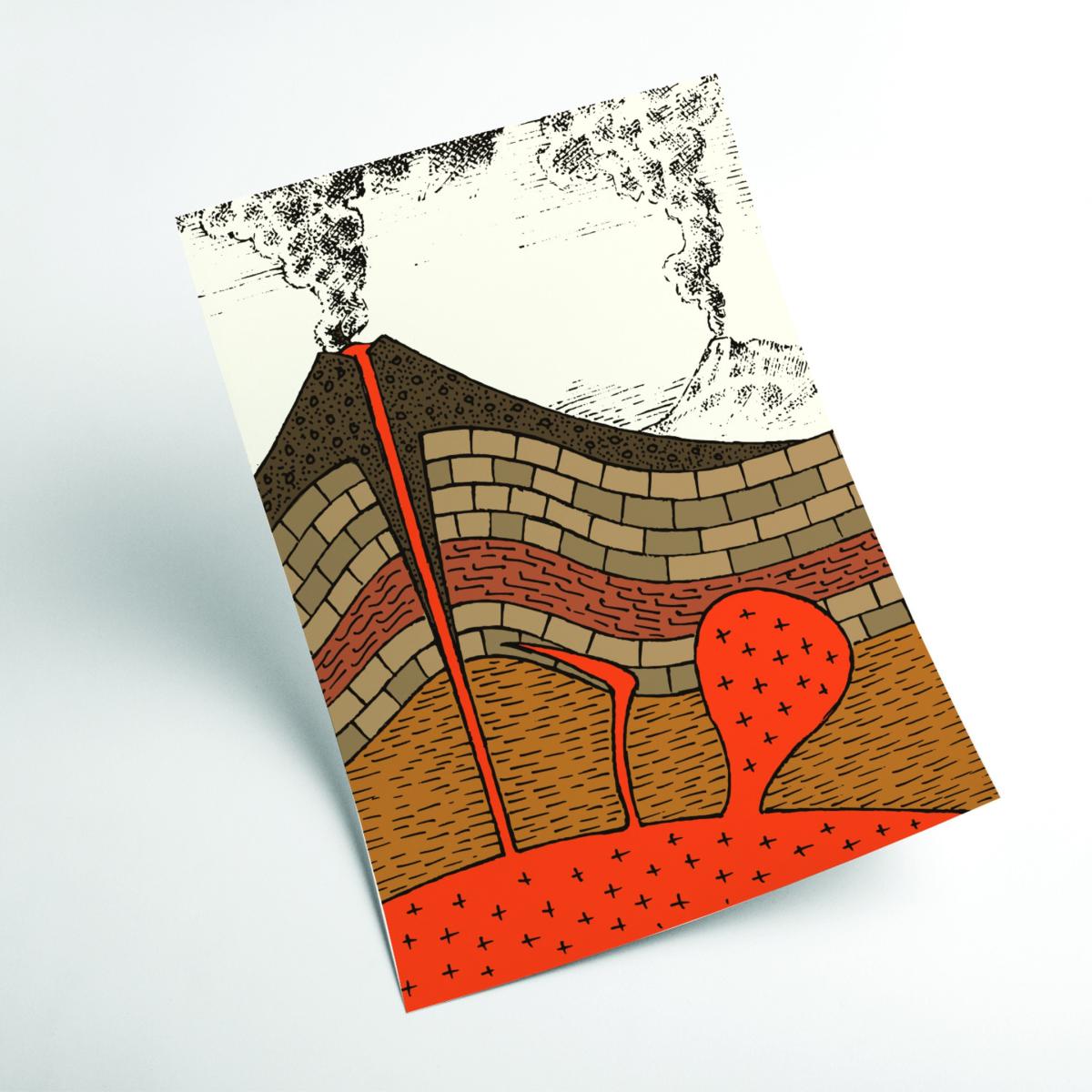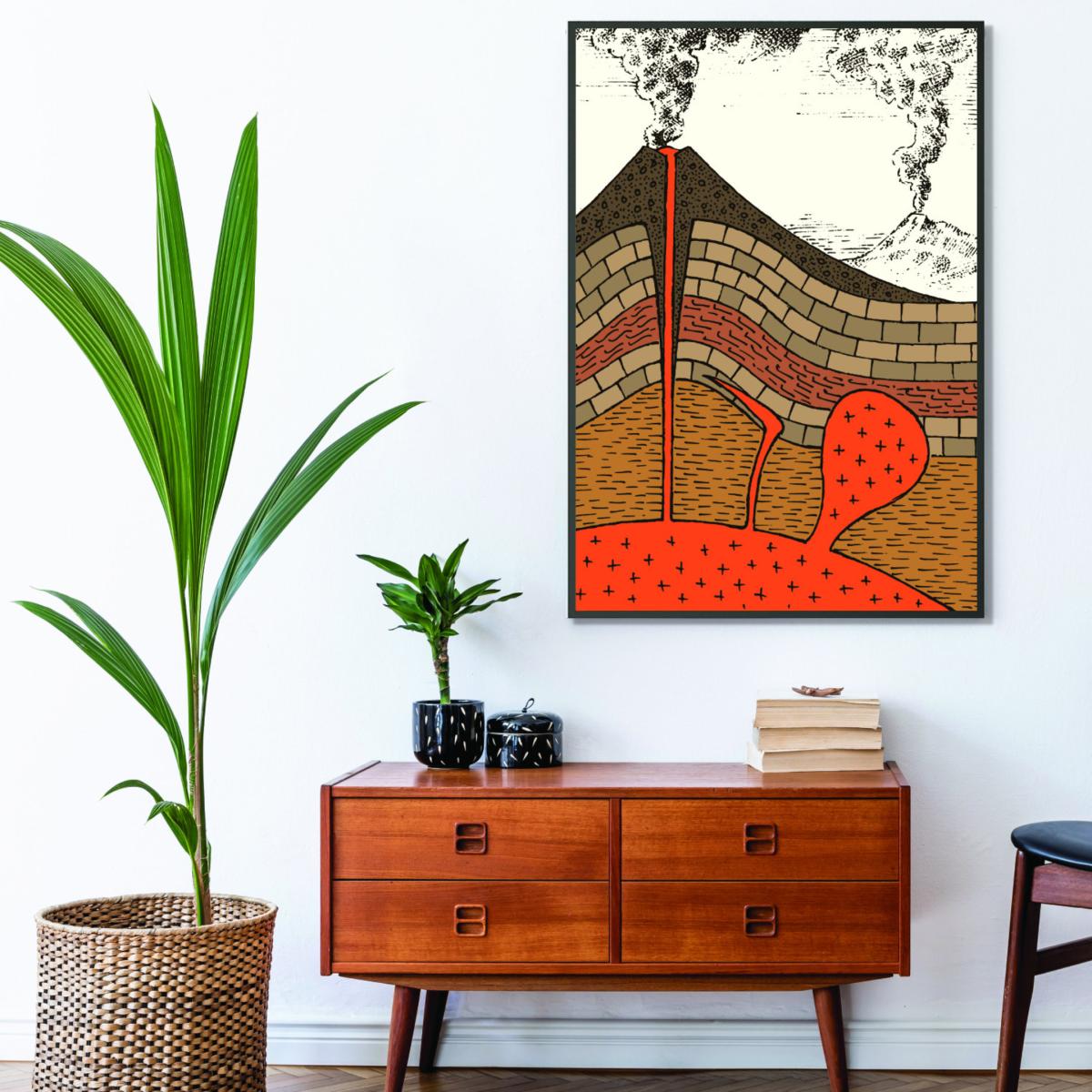 I love this volcano print for adding a bold, graphic focal point to contemporary or eclectic interiors. Its vibrant reds and strong lines work well in modern spaces with neutral palettes, where it can really make an impact. It also suits industrial settings, adding a touch of raw energy. For styling tips, consider pairing it with simple, understated frames or layering it with other artwork for a gallery wall. It works particularly well above a sofa or sideboard to create a striking visual statement. Keep the surrounding decor minimal to let the print shine, or introduce volcanic-inspired textures and colours for a cohesive, themed look.