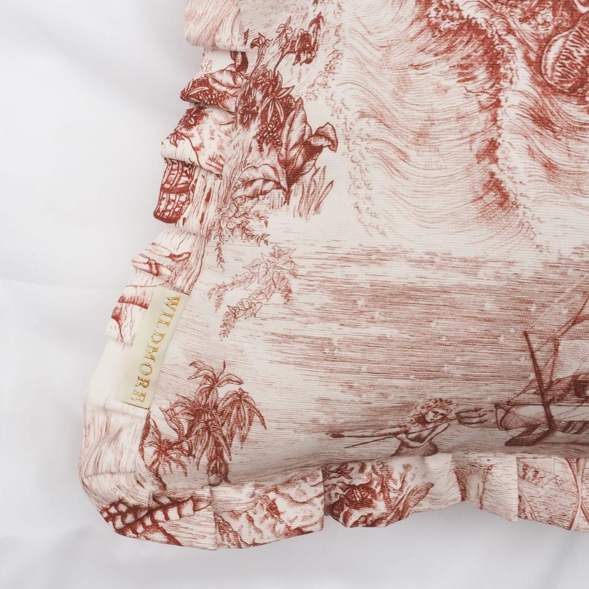 Our iconic Navigo design has been transformed into a delightful cushion. Handmade in our studio in the Lincolnshire countryside, this cushion has a stunning ruffle border and is the perfect size for any room. The delicate off white and red sketches means this classic design will work anywhere. Navigo is a quirky take on the timeless Toil de Jouy designs that have been so popular for centuries. Lauren has hand drawn each scene, injecting character and her love for mythology into each sketch. Her take on this design sees scenes of mythical creatures of the sea, whimsical land animals and buccaneering pirates exploring the waves. Printed onto a Eco Cotton base with a rich luxurious weight, this fabric has been chosen for its sustainability and quality. Also available as a wallpaper.