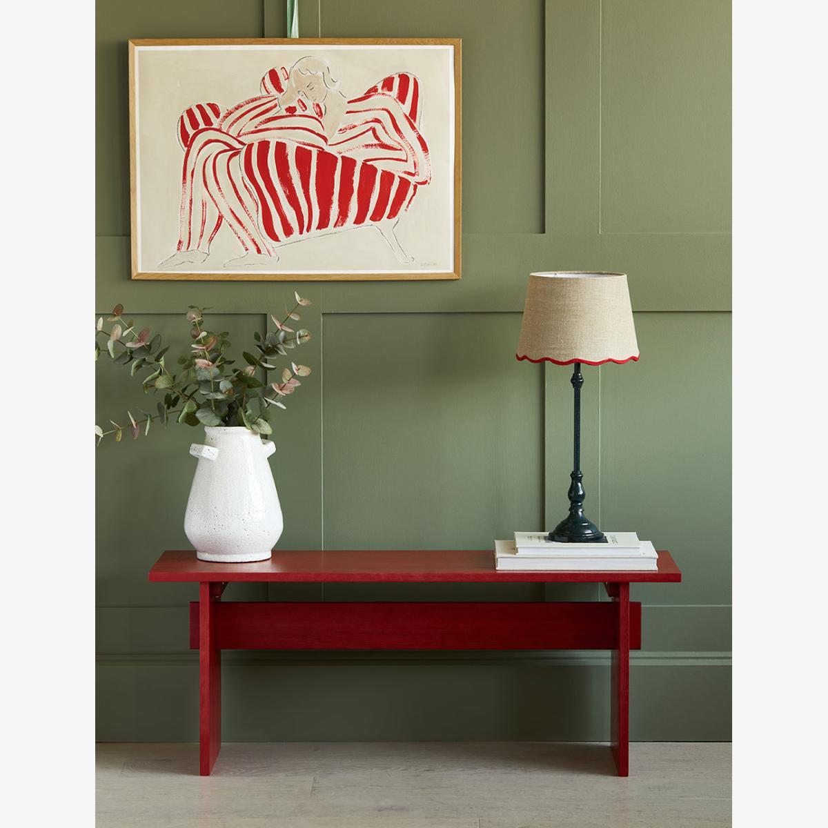 The red wooden bench is a versatile piece that adds both colour and functionality to various interiors. I love it because its bold hue makes it a statement, perfect for bringing warmth and vibrancy to a neutral space or complementing other red accents. It's ideal in entryways, as additional seating in living rooms, or even as a stylish coffee table when paired with a tray. To style it effectively, consider layering with cushions or throws for comfort, and pair it with greenery or artwork for added visual interest. Its classic wooden structure lends itself well to both traditional and contemporary interiors, making it a practical yet eye-catching addition.