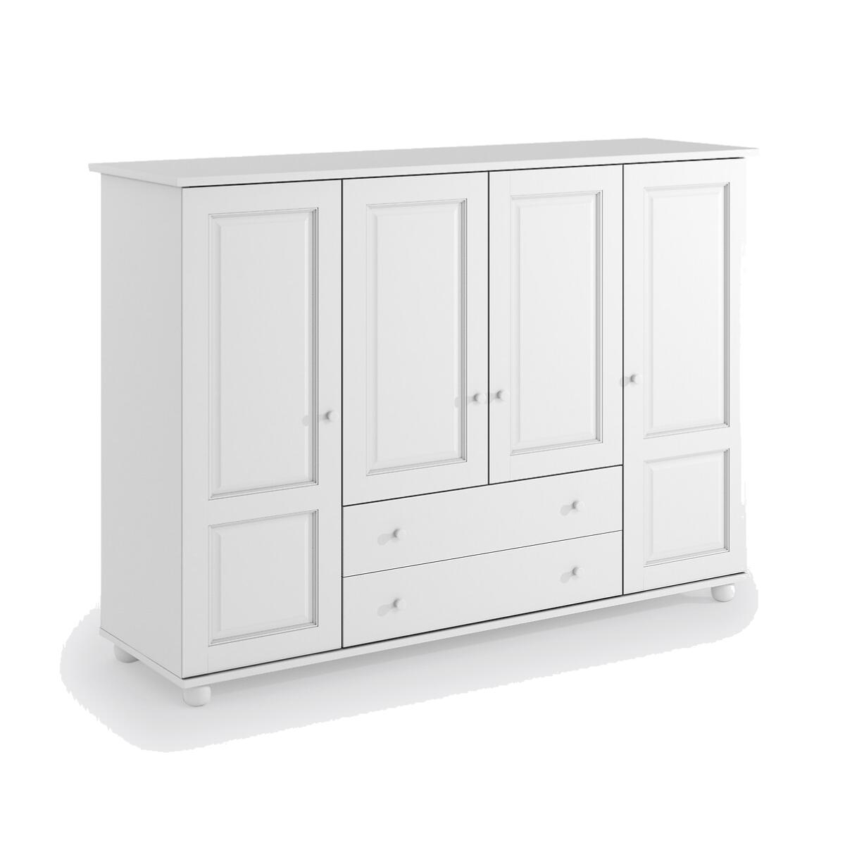 Redmond solid pine cupboard with 4 doors and 2 drawers. Very practical, this cupboard offers 1/2 hanging space and 1/12 shelving for optimum compact storage. Standing at a height of 120cm, this is the perfect size for rooms with sloping ceilings ! Product Details • Structure and front in solid pine, varnished cellulosic finish • Fibreboard back with decorative pine effect • 4 doors • 1/2 hanging space • 1/2 shelving space with 1 height-adjustable and removablre shelf • 2 drawers • Ball feet on front • Central supporting feetDimensions. Total • Width: 170cm • Height: 120cm • Depth: 49cm. Usable dimensions • Drawer: L73 x H12 x D39cm. Home Delivery Assembly required. Available for home delivery. Note! Please check that all access points are large enough to accommodate your delivery (doors, stairs, lifts). Dimensions and weight of parcel3 parcels • L144.2 x H12.6 x D61.8cm. 27kg • L176 x H7.7 x D60.1cm. 27kg • L155.3 x H10.5 x D66.1cm. 23kg