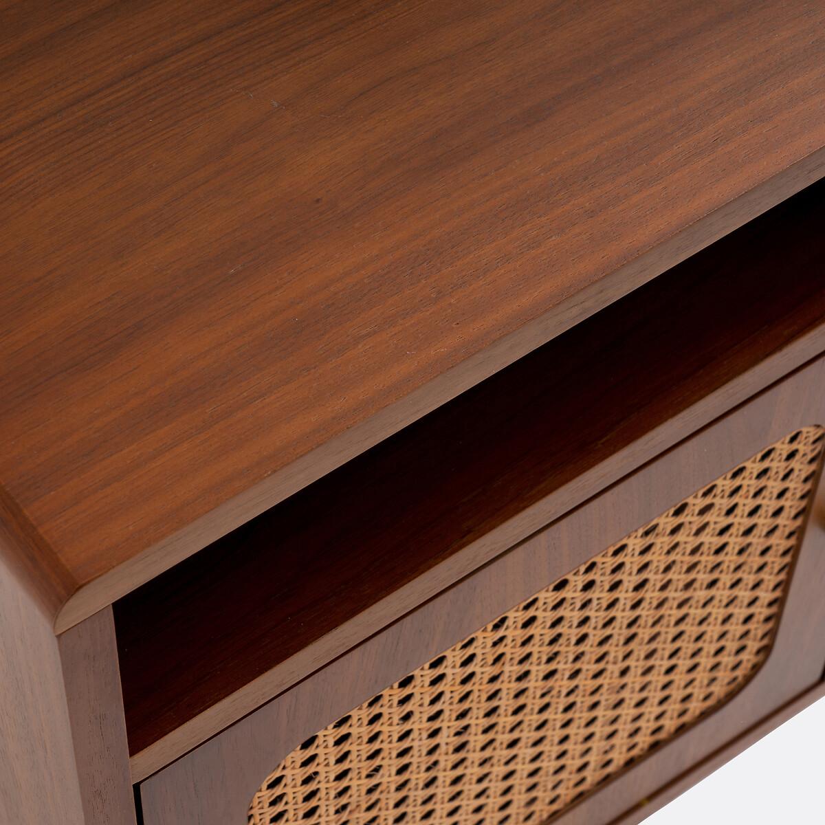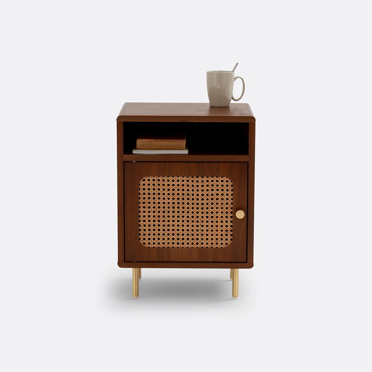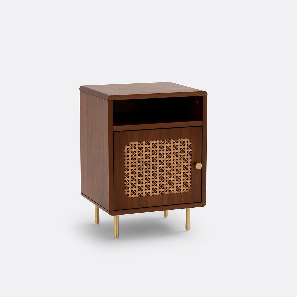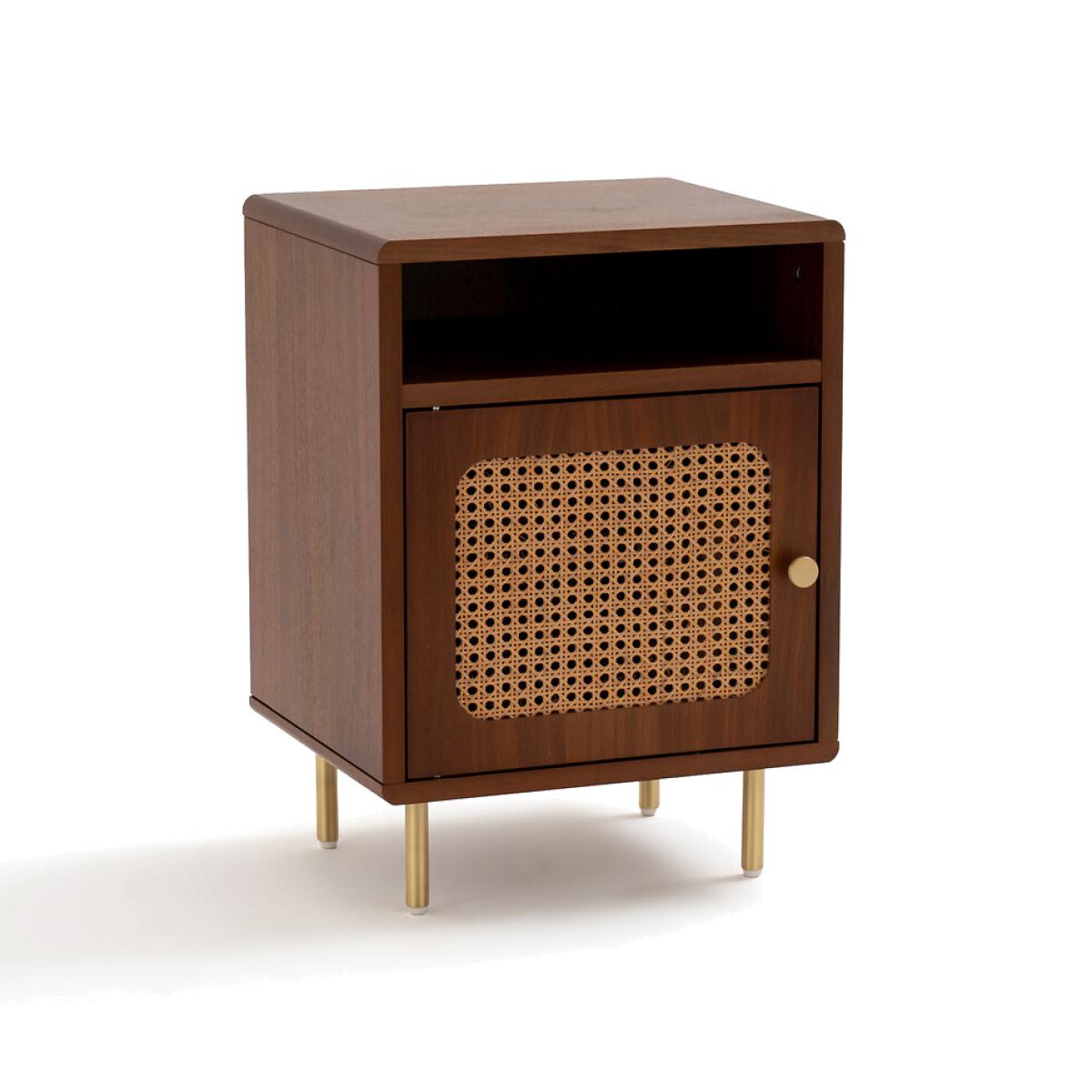 Fall in love with this retro '50s design brought up to date with a modern finish. With its cane door and bold colour hue the Redpop bedside table plays on contrasts and will enhance your interior. Designed by La Redoute Interiors. Product Details • 1 reversible door + 1 compartment • Walnut veneered MDF cabinet, nitrocellulose finish • Rattan cane door • Metal handle and feet, brass epoxy finish • Plastic feet padsDimensions. Overall • Width: 40cm • Height: 55cm • Depth: 34cm • Height of legs: 10cm • Weight: 10kg. Usable space • Small compartment: L36.1 x H9.6 x D33.4cm • Large compartment behind the door:L36.1 x H30 x D33.4cmDelivery:. Assembly required. Available for home delivery. Dimensions and weight of parcel1 parcel • L53 x H16 x D50.5cm. 12.5kg.
