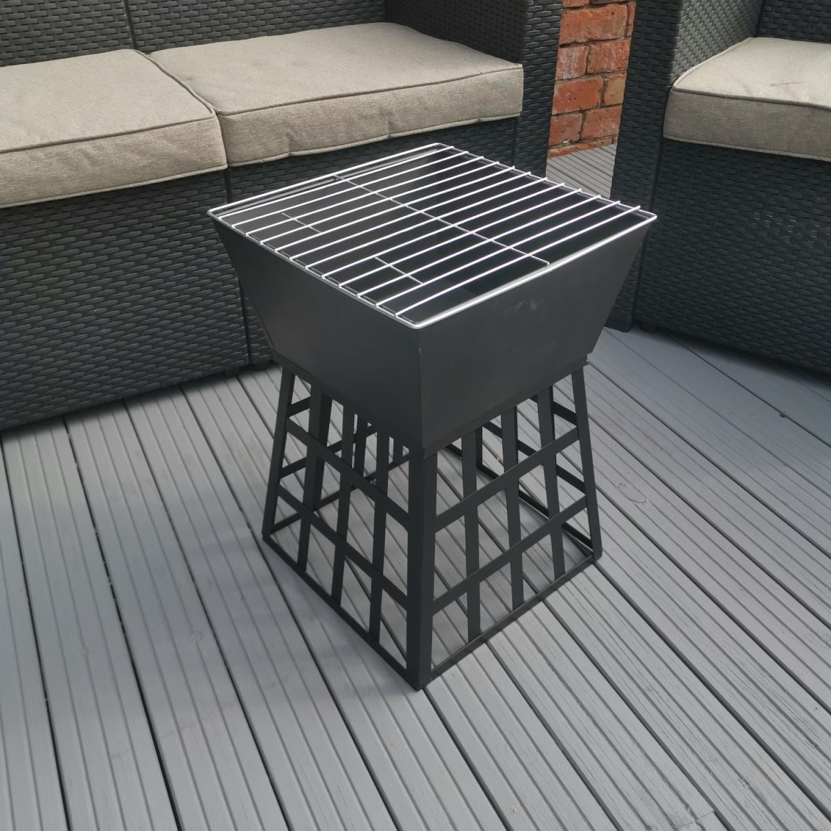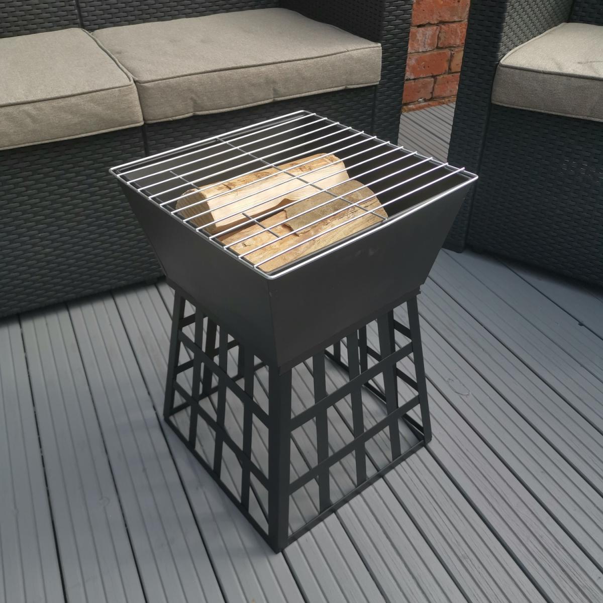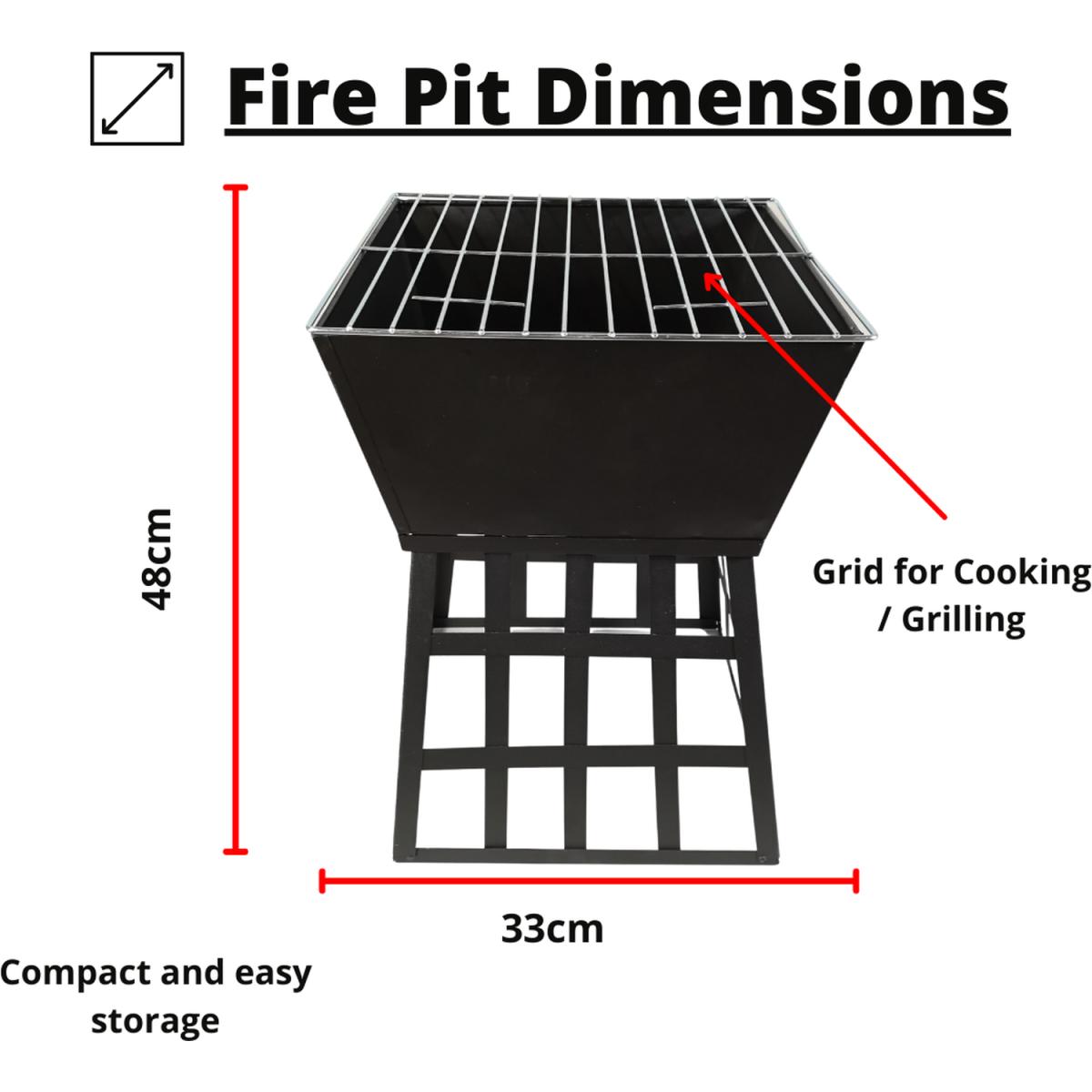 Garden Black Fire Pit BBQ. Includes a metal grill so it can be used as a BBQ. Heat resistant black powder-coated cold-rolled iron plate Body. Includes grill handles. This multi-purpose fire pit is ideal for keeping you warm in the cool evenings, should you wish for a fire or a bbq.