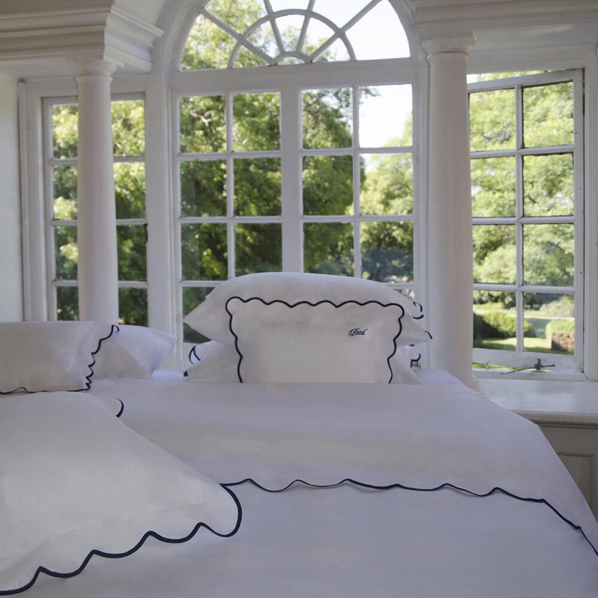 Bring some royal style to your bedroom with this Scallop bed set from Reed Family Linen. Crafted from long-staple cotton sateen with an enviable 400 thread count, this set includes a duvet cover, fitted sheet and two pillowcases. Featuring a delicate scalloped edging in white and grey tones, it was designed in tribute of Her Majesty Queen Elizabeth II in honour of the second Diamond Jubilee in the history of the British Monarchy. Wrapped in tissue paper, this set includes everything you need to know about laundry care, brand history, and design details alongside extra buttons and a lovely thank you card.