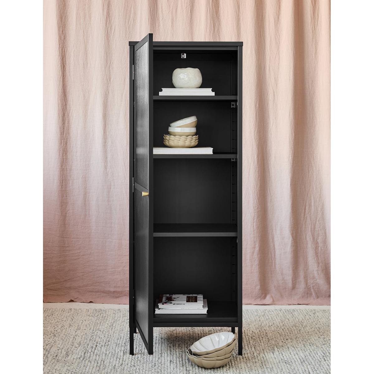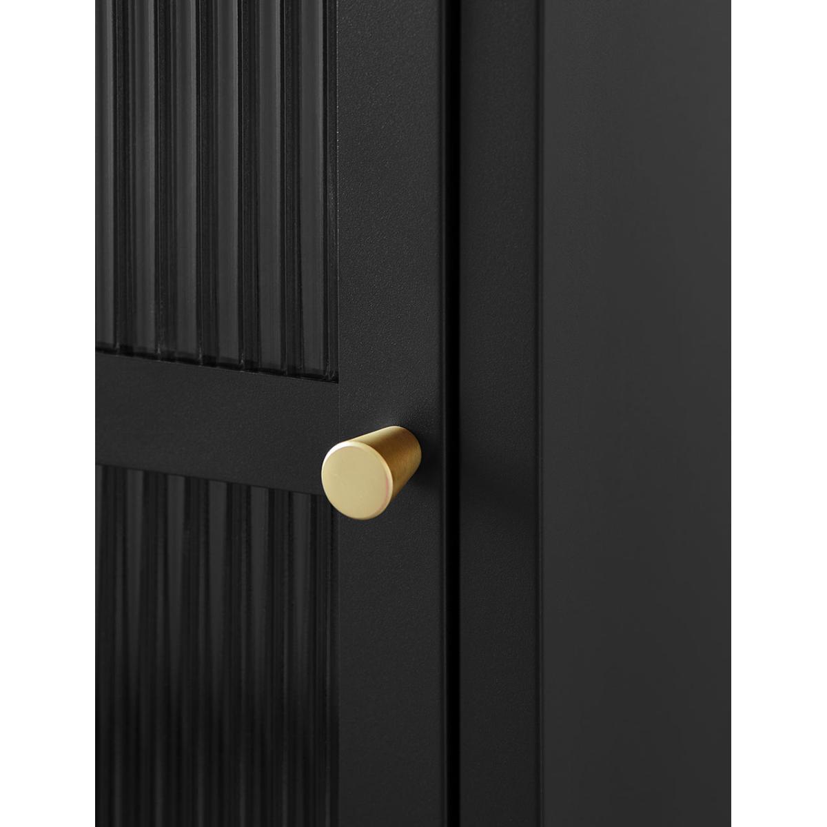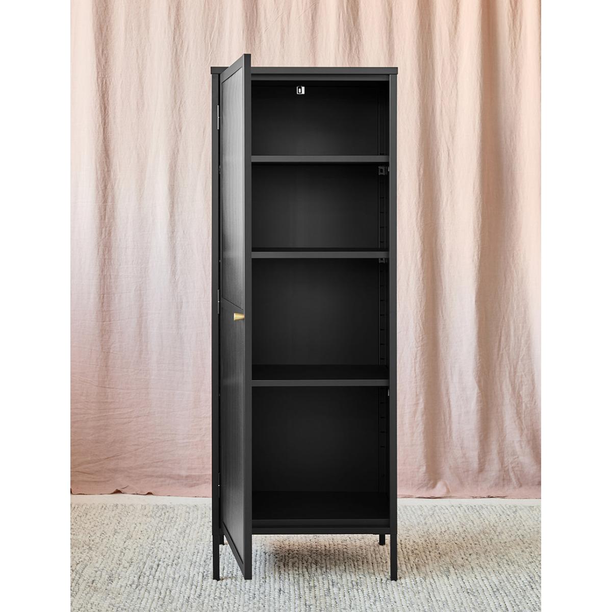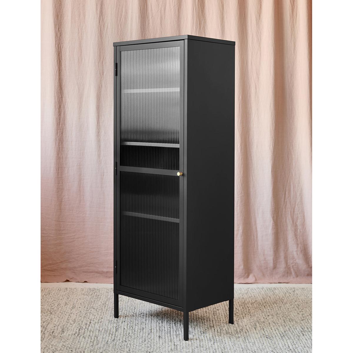 With reeded glass doors, a slim metal profile and minimalist brass handles, this slender one door cabinet will look as gorgeous in a lounge showing off books as it would it a bathroom holding perfectly rolled towels. A really versatile piece. This is a self build piece - all the easier to get into the house. Also available in Spruce and Maroon. Also comes as a Maxi or Midi cabinet and a sideboard. A modern metal slender cabinet with 1 reeded door and 3 adjustable shelves in Ash