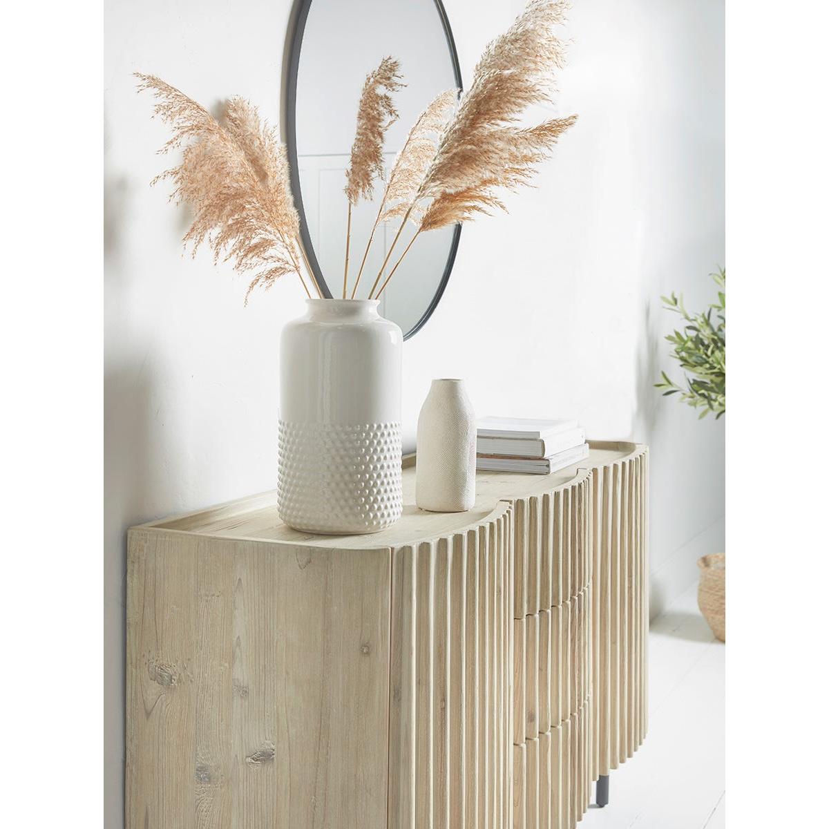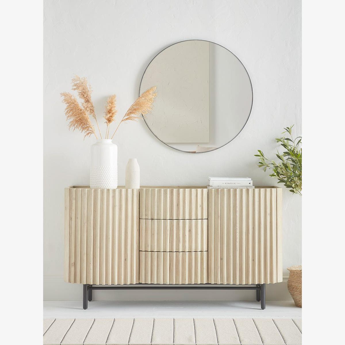 I’m a fan of this reeded sideboard for its clean lines and tactile fluting, which add texture without dominating the space. The light oak tone sits beautifully in Scandi-inspired, contemporary or minimalist schemes and its slender metal base gives it a sense of lift that suits smaller rooms or hallways. For styling, pair it with a round mirror to echo the curved doors, then arrange two or three vases in varying heights or a slim table lamp to one side. Keep your palette neutral - think whites, greys and muted greens - and tuck away cables or clutter in the drawers so the top remains a calm, curated display.