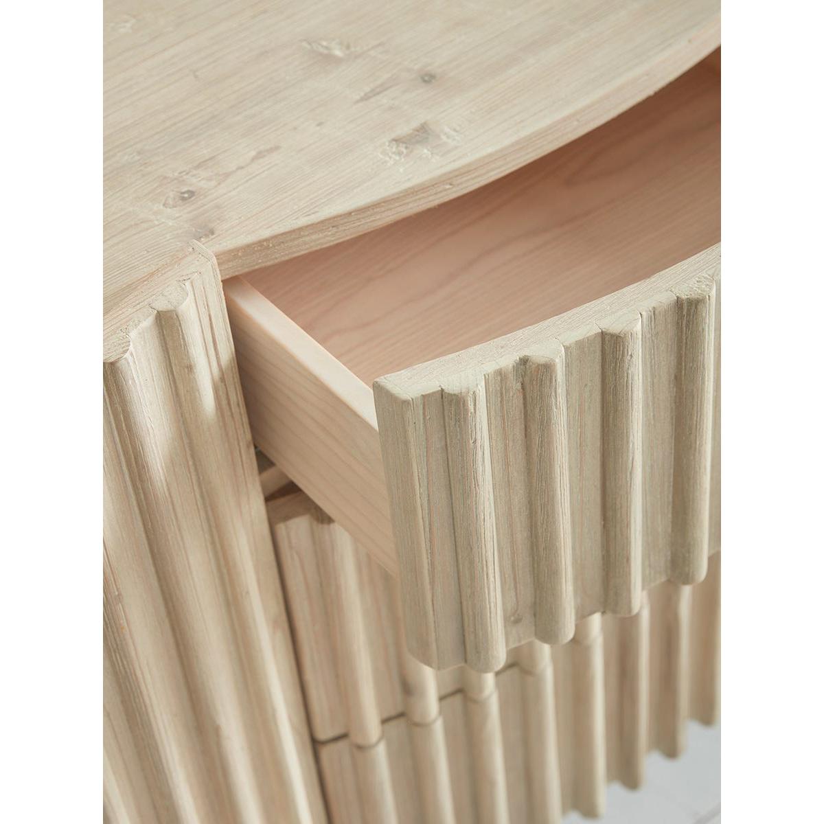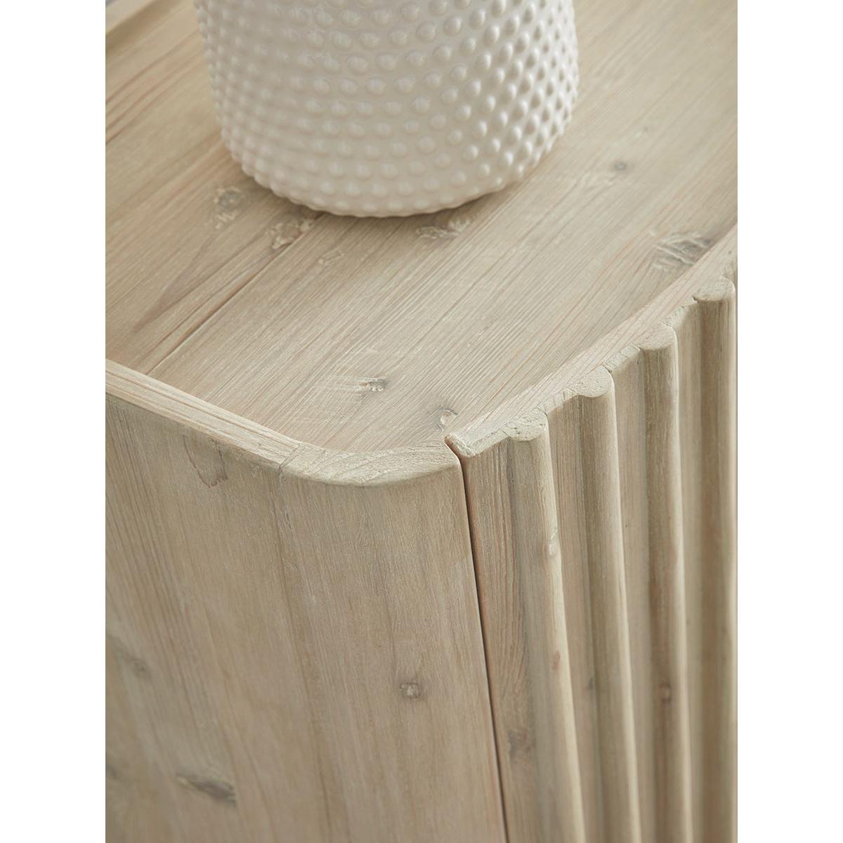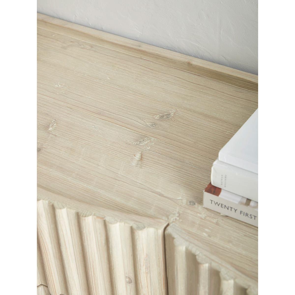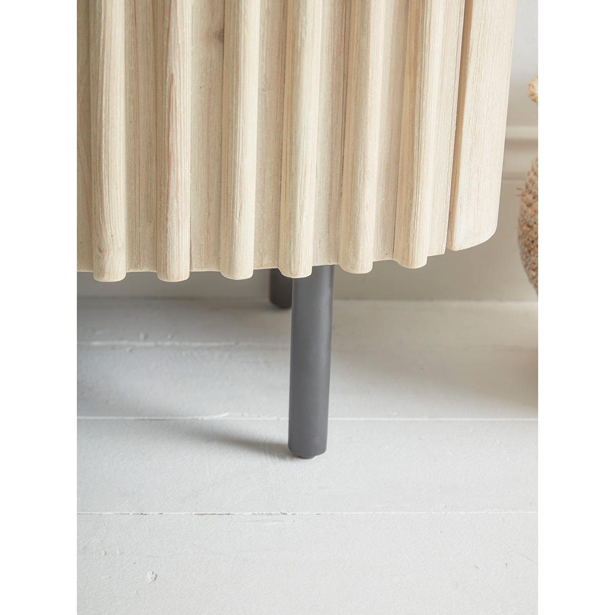 The reeded front adds an extra dimension to this statement sideboard. With a contemporary take on a serpentine-style curved front, the sideboard offers generous storage in three central drawers and cupboards to either side.  The natural reclaimed pine has a bleached paleness which will create a relaxed look in your home. The wooden sideboard is set on grey steel legs for contrast.