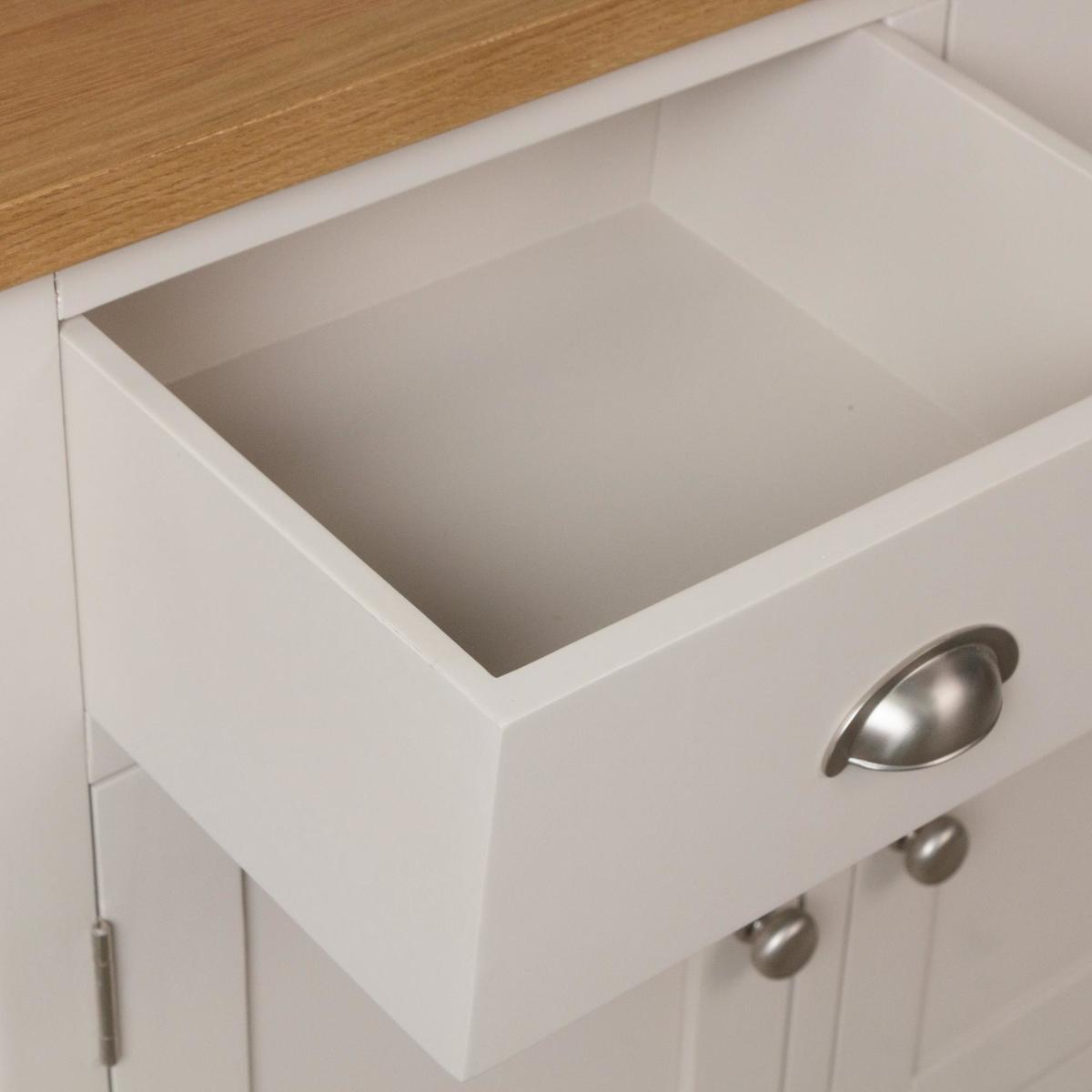 Available in a unique two-tone colourway, this solid wood sideboard is the ideal storage solution. Complete with brushed chrome effect knobs and double and single cabinets, both with internal shelving for additional storage space.