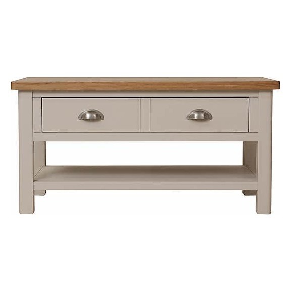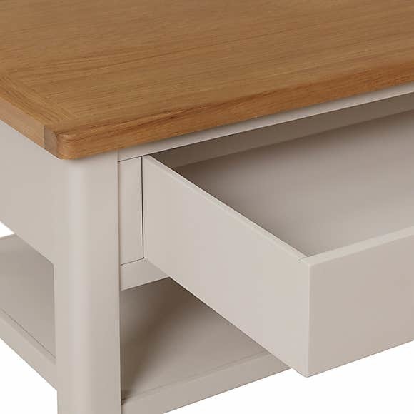 I love this coffee table’s versatility-its dove grey finish makes it a great neutral piece that can adapt to various interior styles, from coastal and scandinavian to more rustic or contemporary schemes. The wooden top adds warmth and texture, making it practical for everyday use, while the drawers and lower shelf provide functional storage for magazines, remote controls, or accessories. It's especially suitable for laid-back, relaxed living spaces or family areas, but can also work in a more formal setting when styled with carefully chosen accessories. For styling tips, try adding a tray with books and candles on top, or layer with textured textiles for added visual interest. Its size and shape make it a practical centrepiece that balances style and function effortlessly.