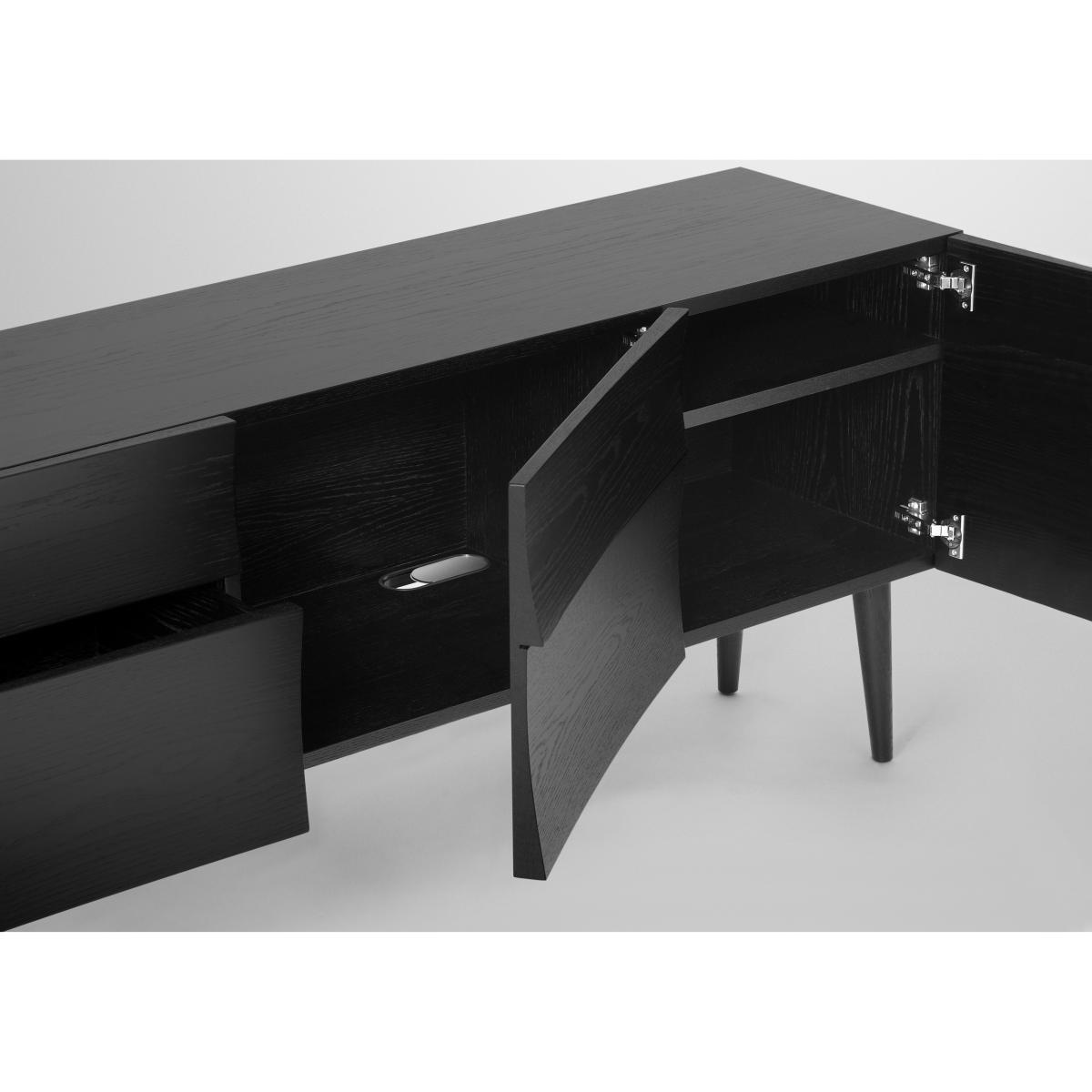 I love this sideboard for its sleek, minimalist design combined with the practical storage it offers. The black finish makes it versatile, fitting well into modern, Scandi, or industrial interiors, while also providing a striking statement piece in more understated spaces. It works equally well in a living room, dining area, or even a bedroom for extra organisation. For styling, consider layering it with a selection of contemporary table lamps, decorative trays, or a few curated books to add visual interest. Keep accessories simple to maintain its clean lines, and use it as a surface for showcasing carefully chosen art objects or plants - a simple way to enhance its understated elegance without overpowering the space.