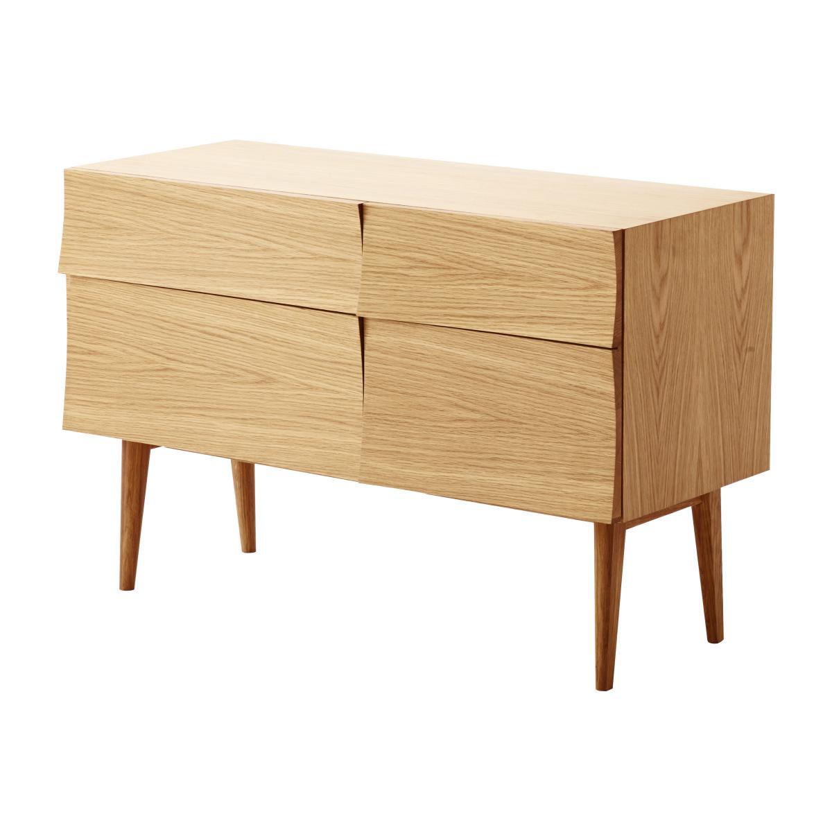 I love this small dresser for its clean lines and understated elegance, making it a versatile piece for various interiors. Its natural wood finish lends warmth and texture, ideal for Scandinavian, mid-century, or contemporary schemes. It works well in bedrooms as a practical storage solution or in living rooms and hallways as a compact sideway. Practical styling tips include pairing it with simple, minimalist accessories or layering with textiles like bas before placing decorative objects on top to keep the look cohesive. Its tapered legs give it a light, airy feel, making it suitable even in smaller spaces without overwhelming the room.