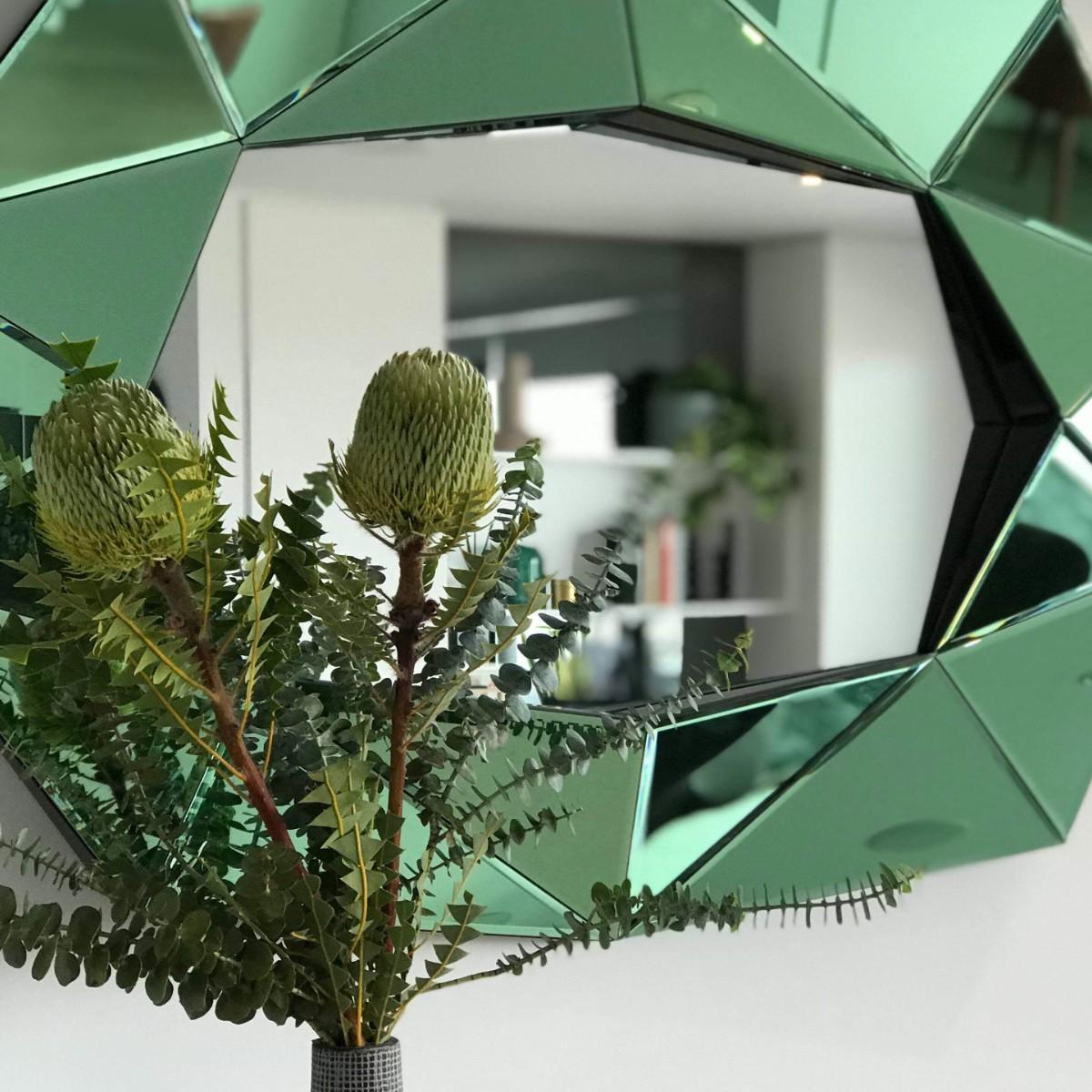 I love this mirror for its bold, contemporary look thanks to the distinctive emerald geometric frame, which adds colour and texture to any room. It works particularly well in modern or eclectic interiors, acting as a statement piece above a console or in a hallway. For practical styling, consider pairing it with sleek, minimalist furniture to let the mirror stand out, or hang it in a space with other green accents for a cohesive feel. Its sizeable shape makes it perfect for creating a sense of space and light, and it can be easily integrated into both residential and hotel-style settings.