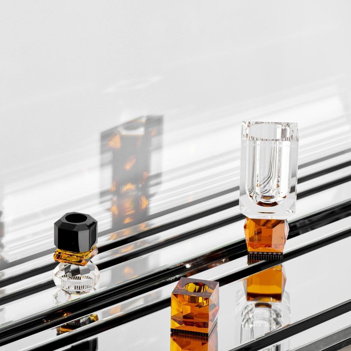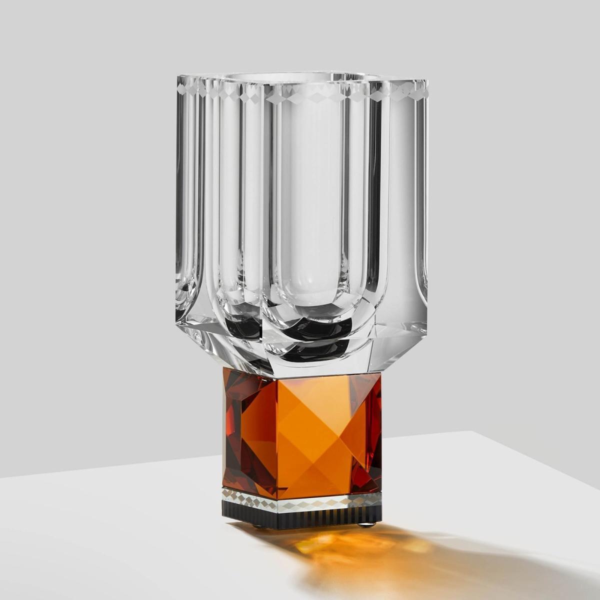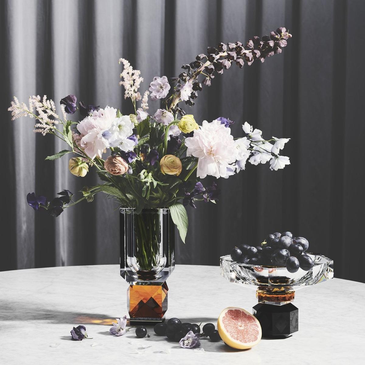 Sculptural and masculine in equal parts, the Reflections Copenhagen Ohio vase is brought together by a vision that unites art, functionality and beauty. Handcrafted from clear, black and amber-hued crystal, the striking vase is additionally mesmerizing for the refractions of light that filter through its geometrically patterned surface. The result is a stunningly sophisticated piece that presents a refined vessel in which to display floral arrangements.