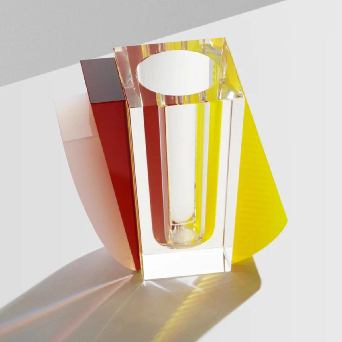 I love this Raleigh vase for its striking, modern design - it’s a real statement piece that works well in contemporary or minimalist interiors. Its geometric form and bold colour accents make it versatile enough to sit on a sideboard, console table, or even as a standalone decor piece on a shelf. Practical styling tips include pairing it with simple, understated blooms to highlight its clean lines, or using it as an eye-catching container for colourful or textured foliage. Its transparency also allows it to blend seamlessly into various colour schemes, adding a touch of architectural flair without overwhelming the space.
