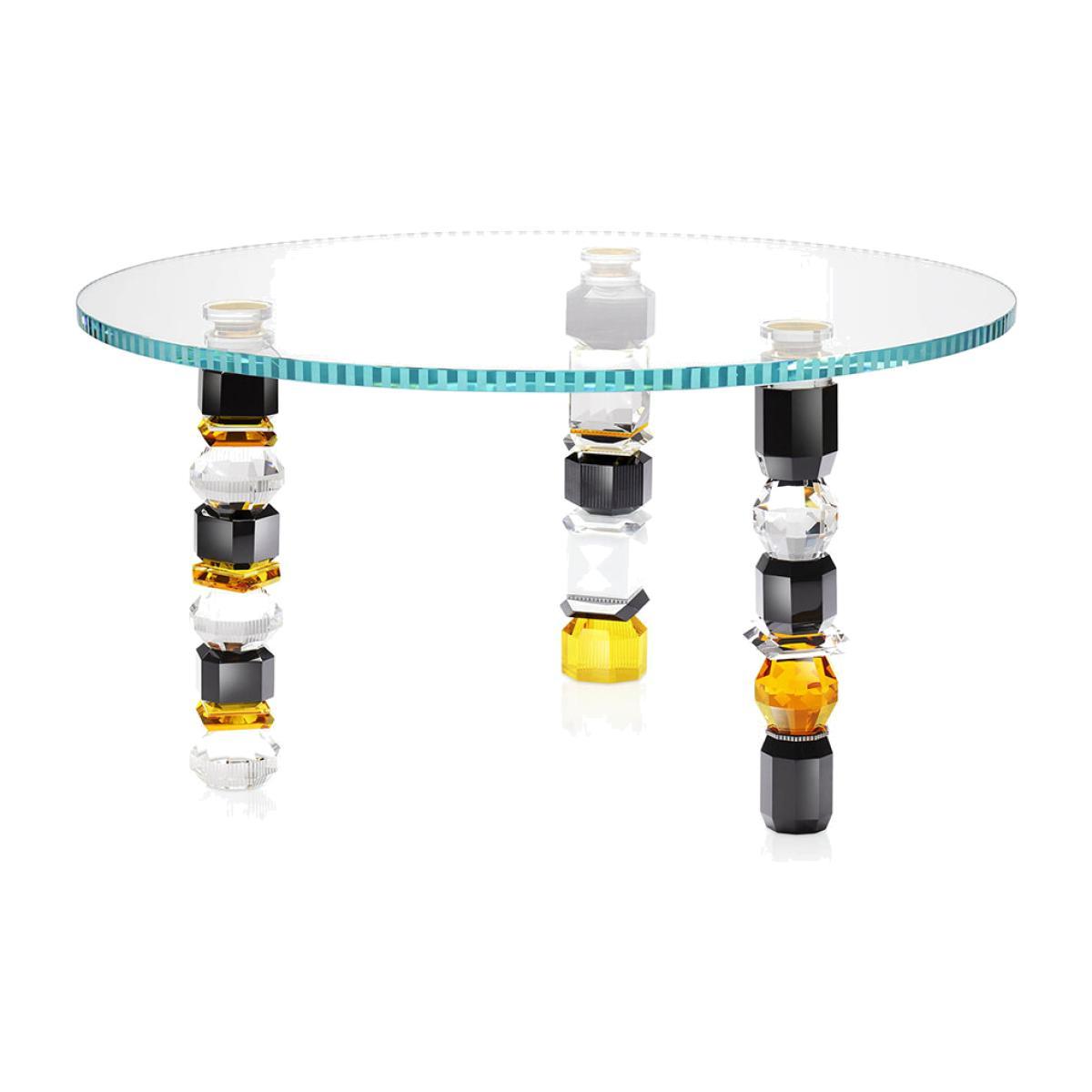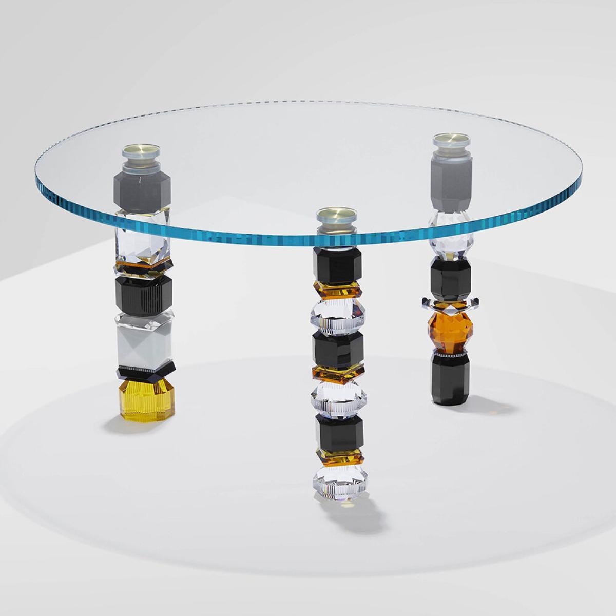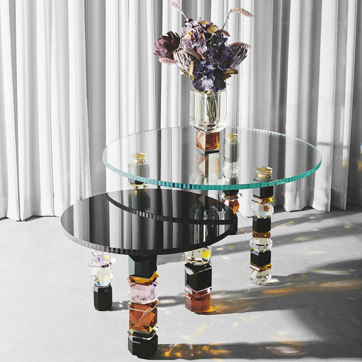Bring a touch of eccentric glam to your home with this Louisiana table from Reflections Copenhagen. Hand-cut from crystal and glass, it features three legs made up of different gem-inspired shapes.