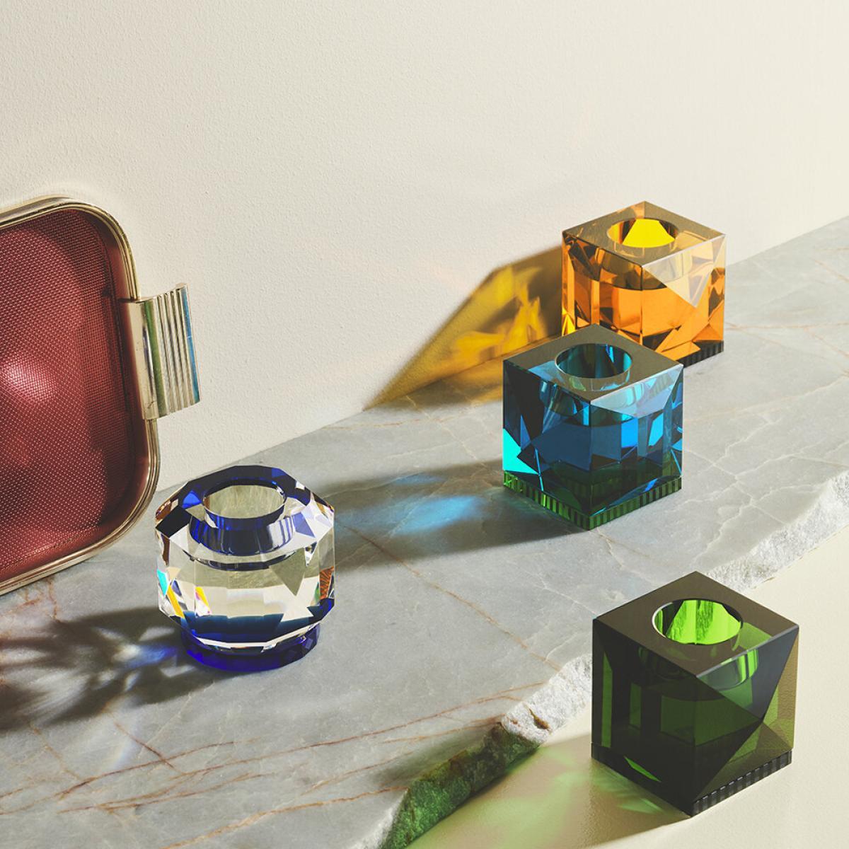 I love the Ophelia tealight holder for its vibrant azure and green hues, which give it a striking yet versatile appeal. This piece works well in contemporary and minimalist interiors, adding a splash of colour and visual interest without overwhelming the space. Practical styling tips include pairing it with neutral tones to let its colours pop or using it as a focal point on a side table or shelf. It also pairs beautifully with natural textures like wood or botanical elements for a fresh, modern look. Because of its bold design, it’s best used in spaces where it can be appreciated as a statement piece, and the candlelight will enhance its faceted crystal effect, creating a warm glow that lends an inviting atmosphere.