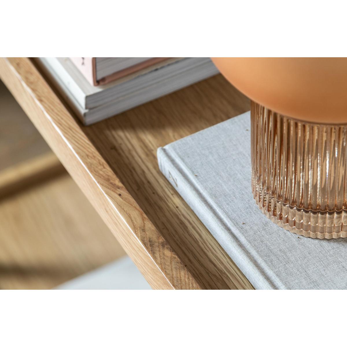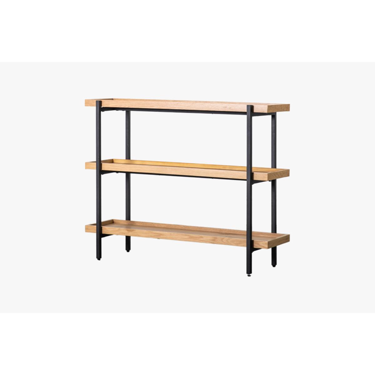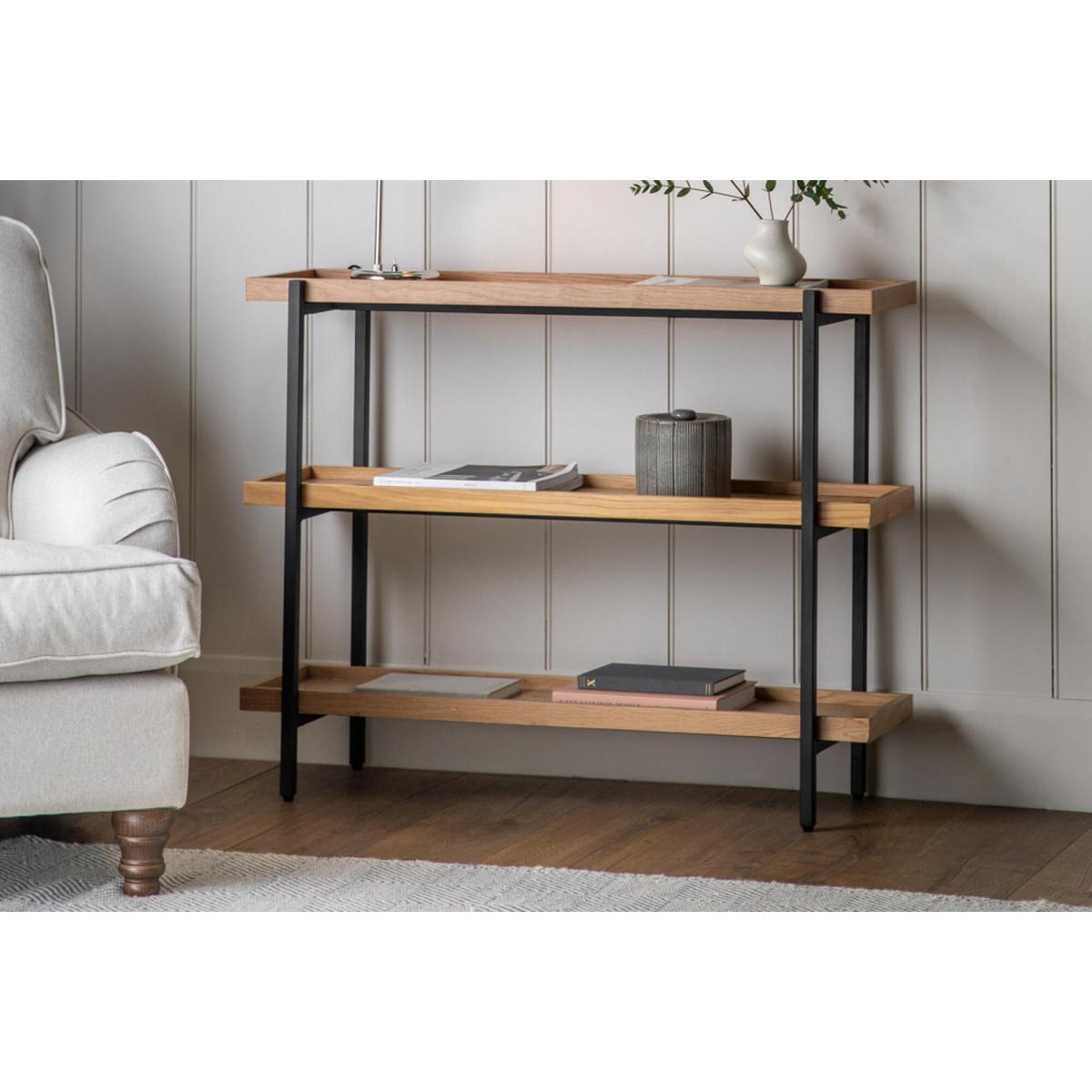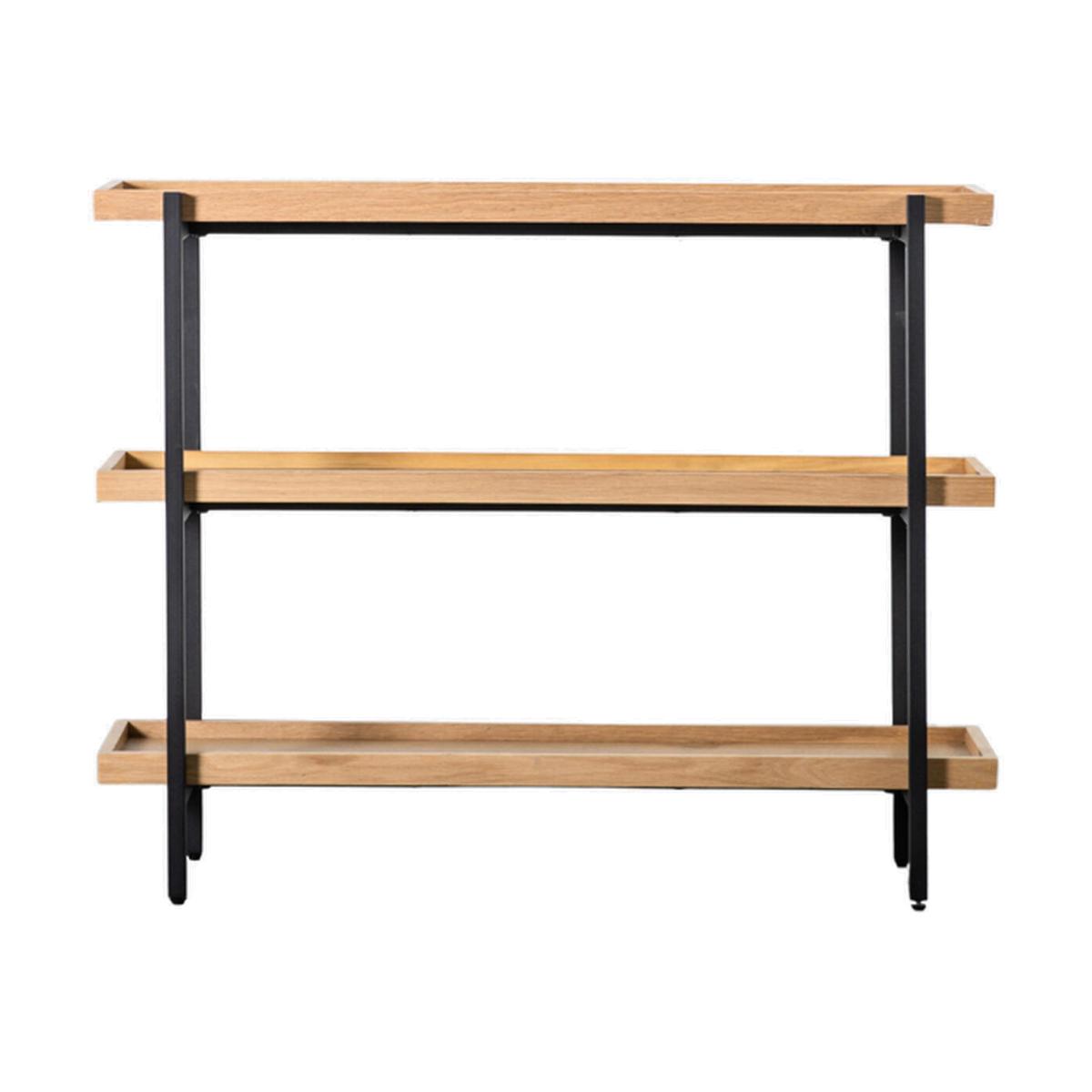 I love how this large open shelf combines solid oak with a slim black frame - it feels sturdy without looking bulky. It works particularly well in Scandi-style living rooms, contemporary home offices or urban loft spaces where you want to introduce both warmth and structure. For styling, group books and objects in odd numbers and vary the heights to keep the display lively. Use woven baskets or lidded boxes on the lower shelf for hidden storage, and leave a little breathing space around each item so the overall look doesn’t feel cluttered. A trailing plant or a simple ceramic vase on the top shelf will soften the lines and add a touch of greenery.