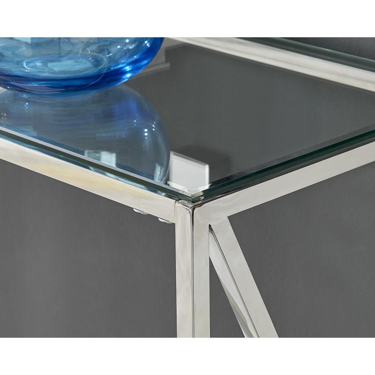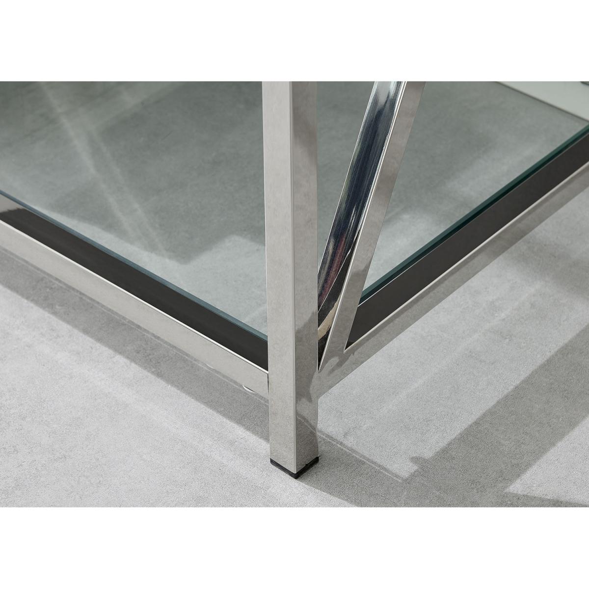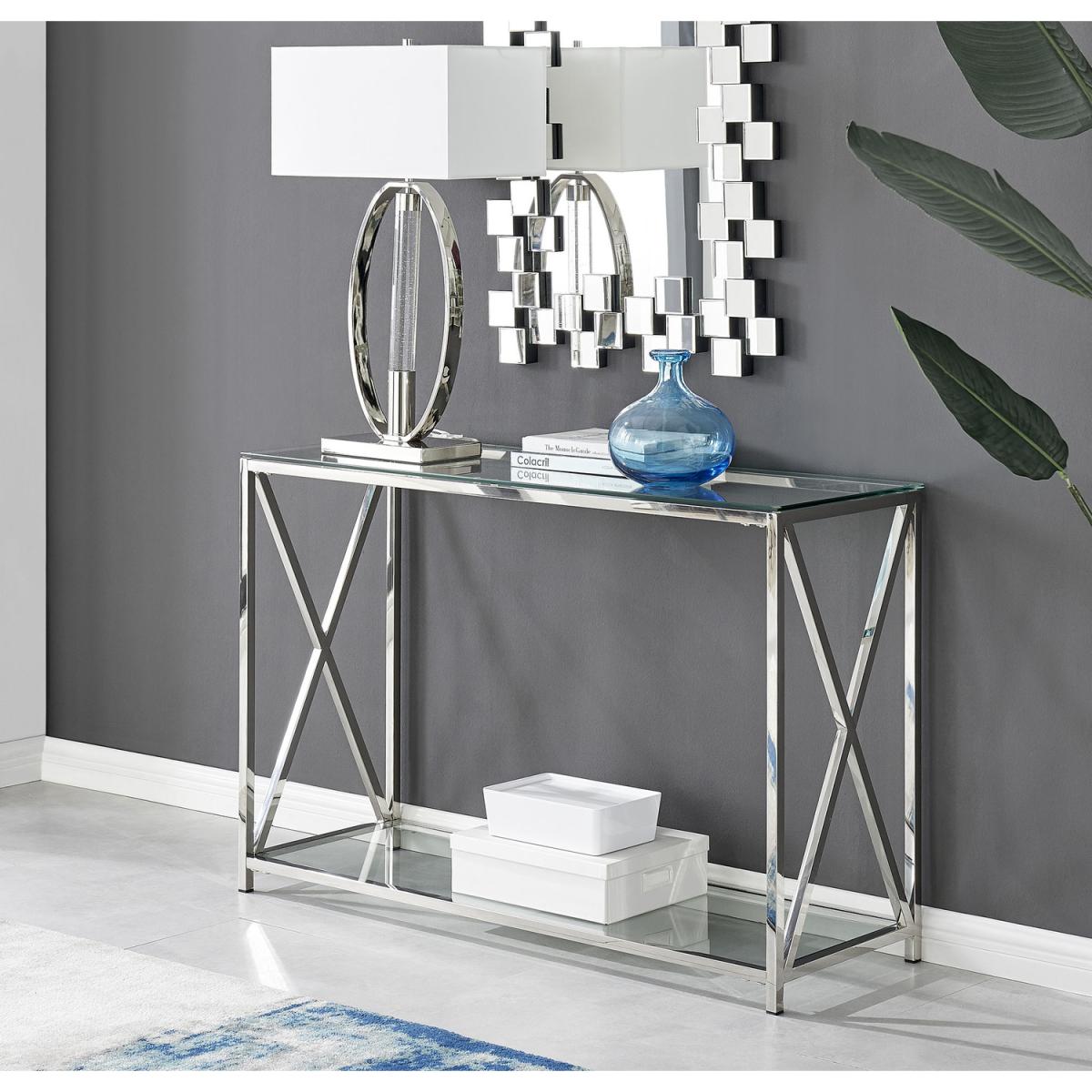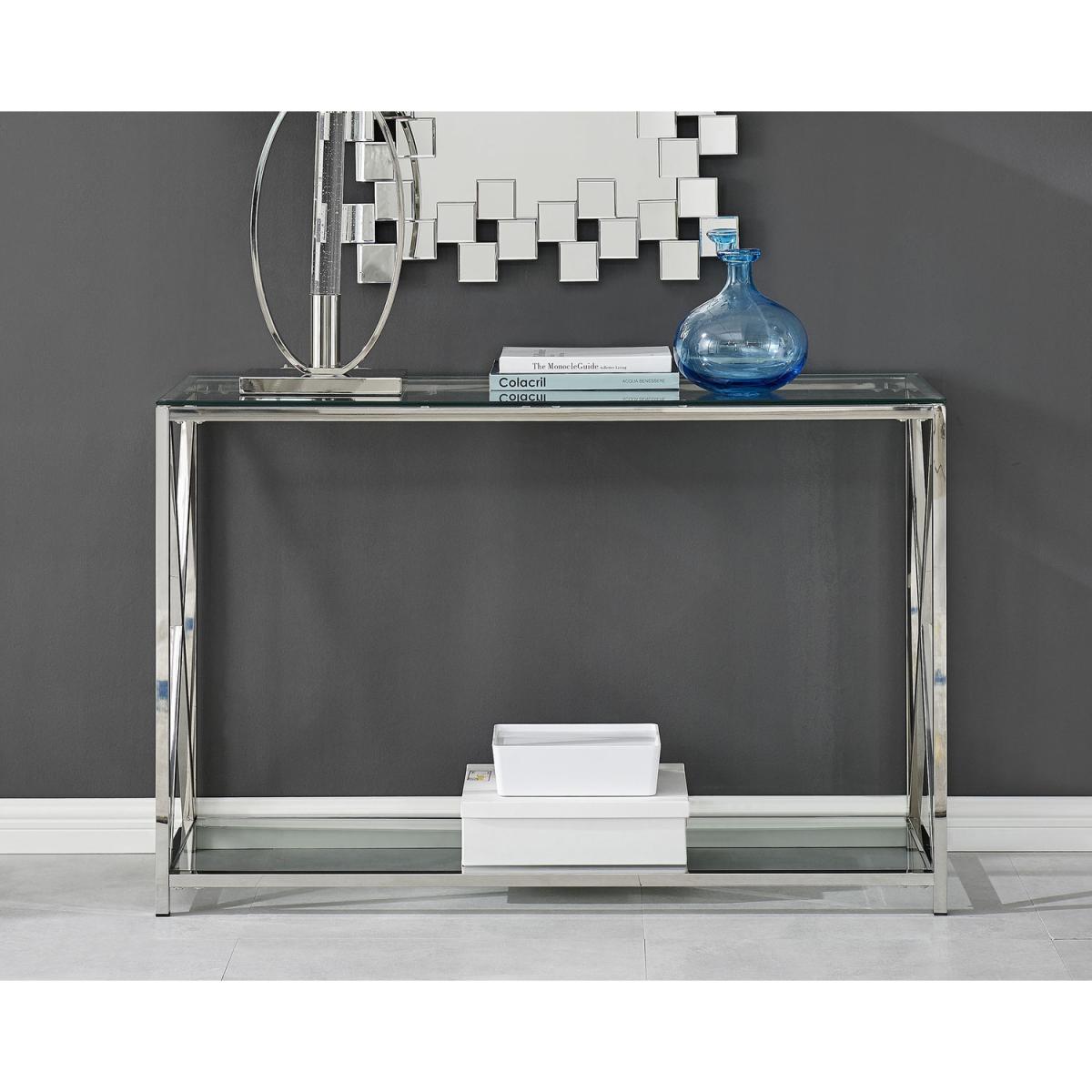 This beautiful, modern stainless steel and glass console table will wow your guests when they walk through the door. Perfect for narrow hallways that need some contemporary storage for organising your house keys, post and shelves. This modern cross end console unit features two tempered glass shelves for added storage space. The unique cross end design adds some extra structural support to this console unit whilst also making this a standout contemporary piece of furniture for your hallway or living space. The stainless steel chrome frame is easy to keep clean, as are the two glass shelves so this console table is easy to maintain even in the busiest homes.