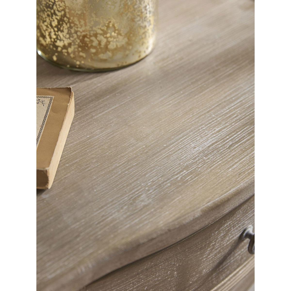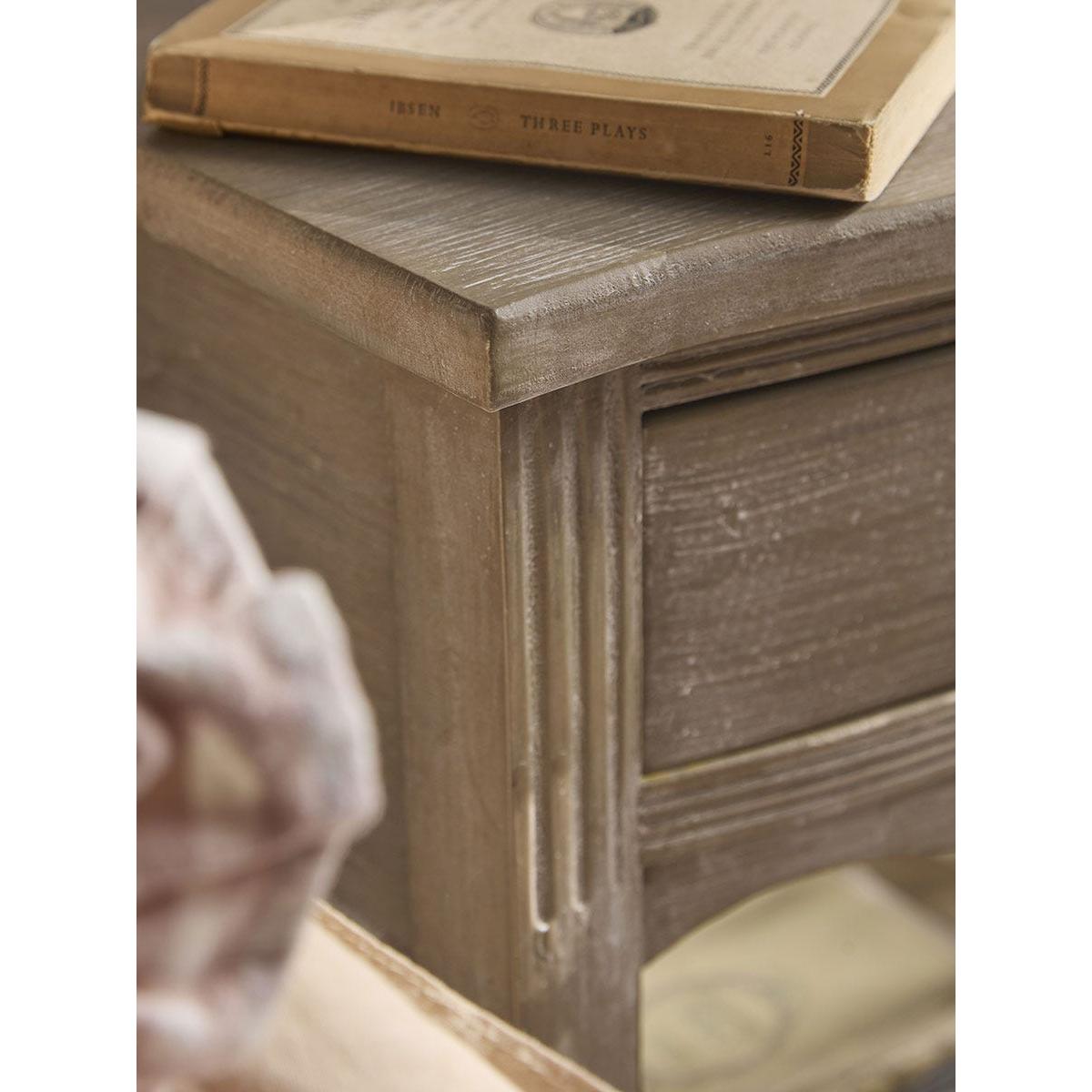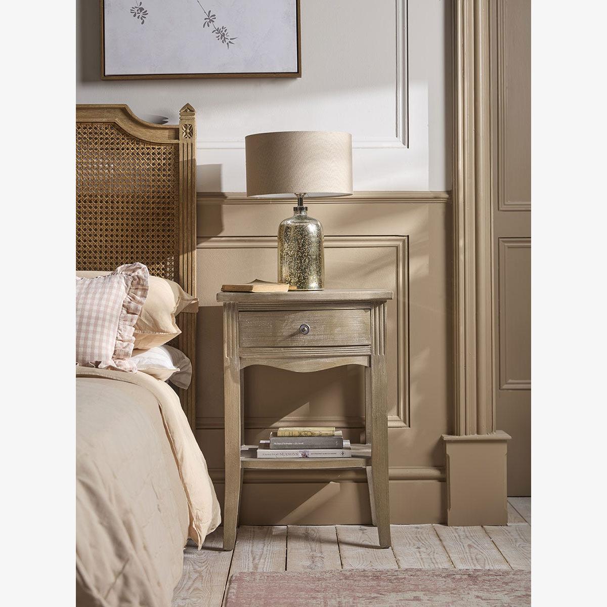 Crafted from pine and MDF, our Regina bedside table has a gently aged finish for a look inspired by vintage style. Delicate beading frames the drawer, which is finished with a petite bronze handle. Soft and curvaceous edges with slightly tapered legs finish this piece off with elegance, making it perfectly suited to an interior style that embraces a more traditional look.