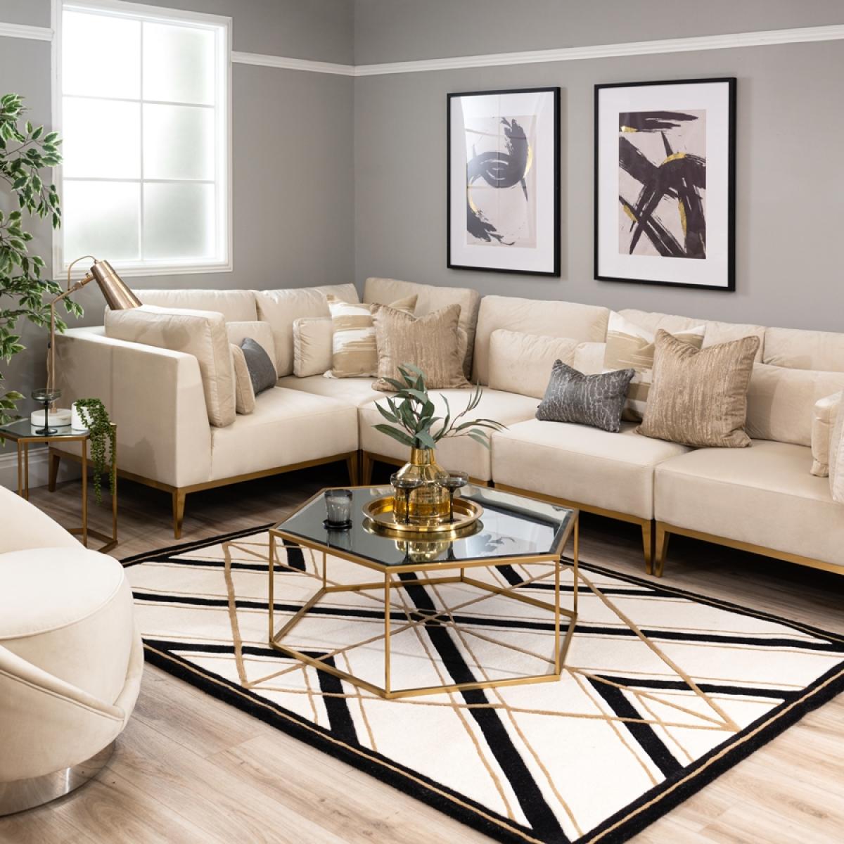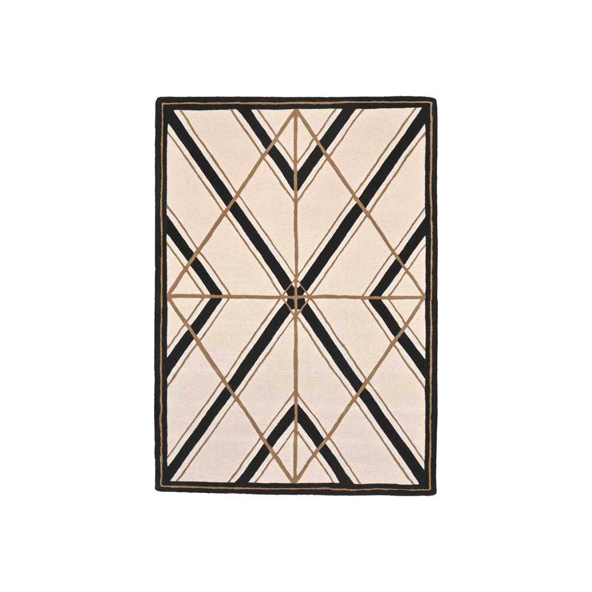 An elegant rug featuring a neutral base with black and gold detailing. Hand Tufted 100% Wool. Wool rugs shed fibres during vacuum cleaning and everyday use; this is not a fault but a natural characteristic. Please use only suction type vacuum cleaner as rotating brush vacuum may damage the rug. Spills should be cleaned immediately to help avoid staining- use a clean white absorbent cloth to dab the spillage, avoid scrubbing and chemical cleaners. For deep cleaning use a professional carpet cleaning company- do not dry clean or tumble dry. If loose threads appear carefully trim them with scissors.