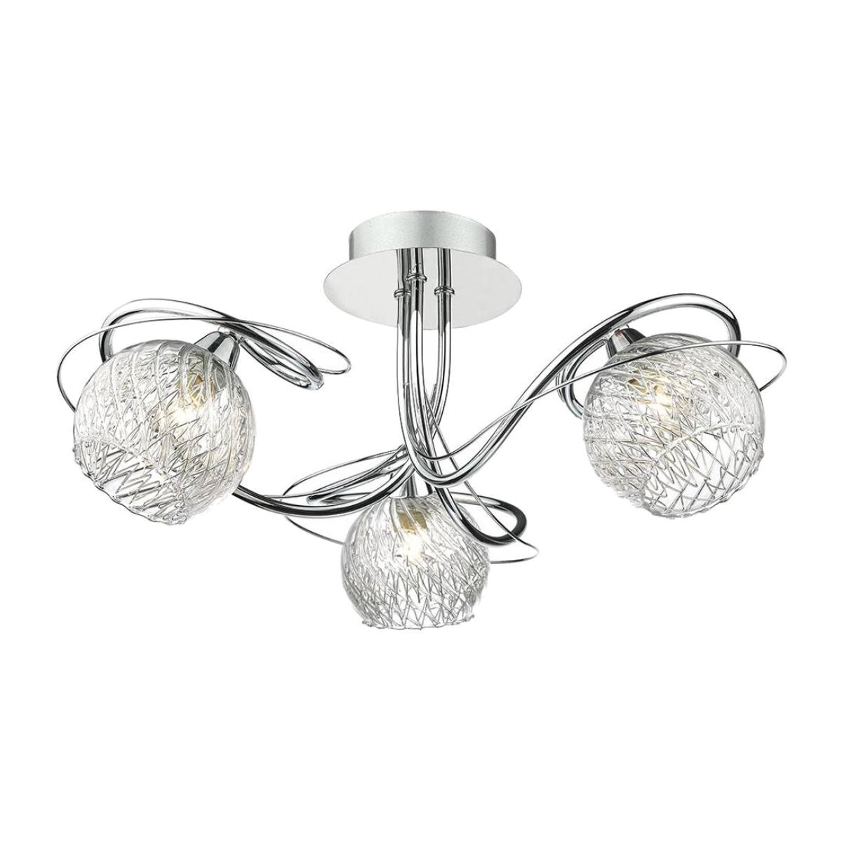 Modern ceiling light boasting a polished chrome finish. The Rehan 3 Light Ceiling Light is a gorgeous modern fitting. This semi-flush piece features a round ceiling plate, of which 3 curvaceous arms, with shadow wire detailing, are elegantly attached. Finished in polished chrome throughout, this decorative fitting boasts clear ripple glass shades with wire inserts in each, creating a beautiful sparkly effect when lit. Modern ceiling light boasting a polished chrome finish. The Rehan 3 Light Ceiling Light is a gorgeous modern fitting. This semi-flush piece features a round ceiling plate, of which 3 curvaceous arms, with shadow wire detailing, are elegantly attached. Finished in polished chrome throughout, this decorative fitting boasts clear ripple glass shades with wire inserts in each, creating a beautiful sparkly effect when lit.
