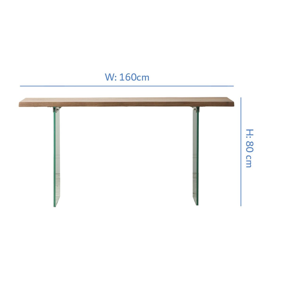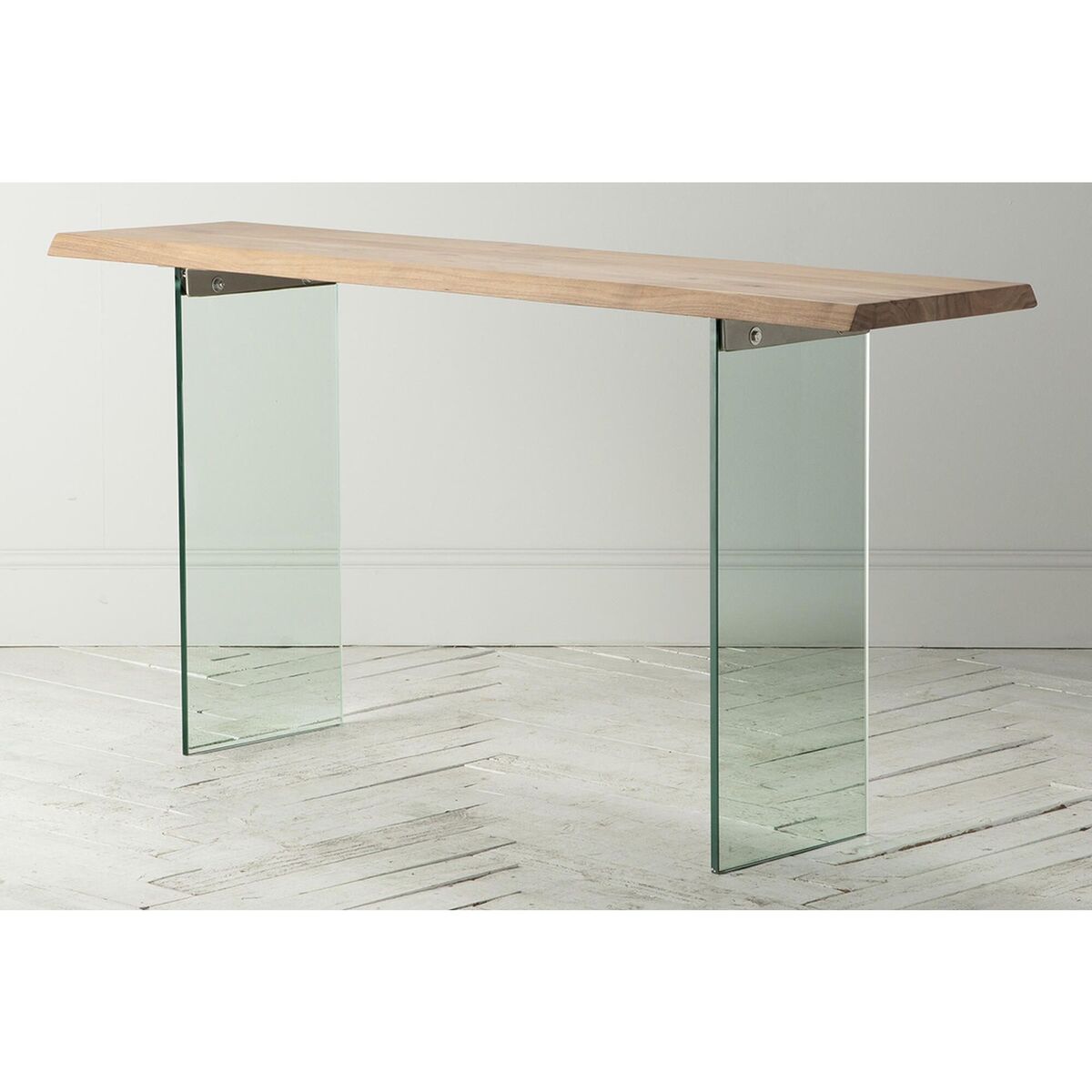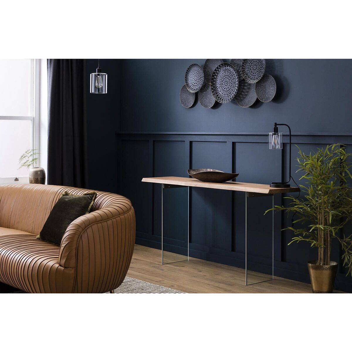 I really like this console because of its sleek, modern look with the glass legs and natural wood top, making it a versatile piece for various interiors. It works particularly well in contemporary or minimalist spaces, and can be styled as a statement piece in an entryway, behind a sofa, or even along a hallway. Practical styling tips include adding a few decorative accents like a vase, a stack of coffee table books, or a table lamp to create visual interest. Its clean lines and neutral materials also mean it can be effortlessly combined with both colours and textures, making it a flexible addition to many interiors.