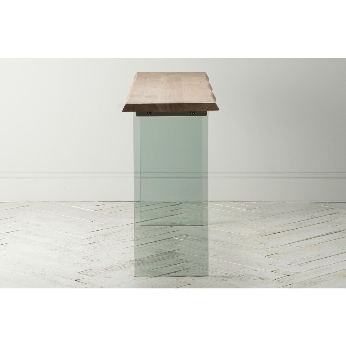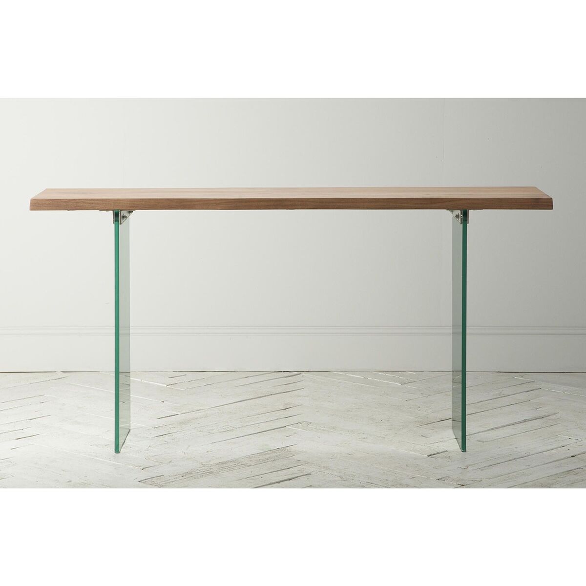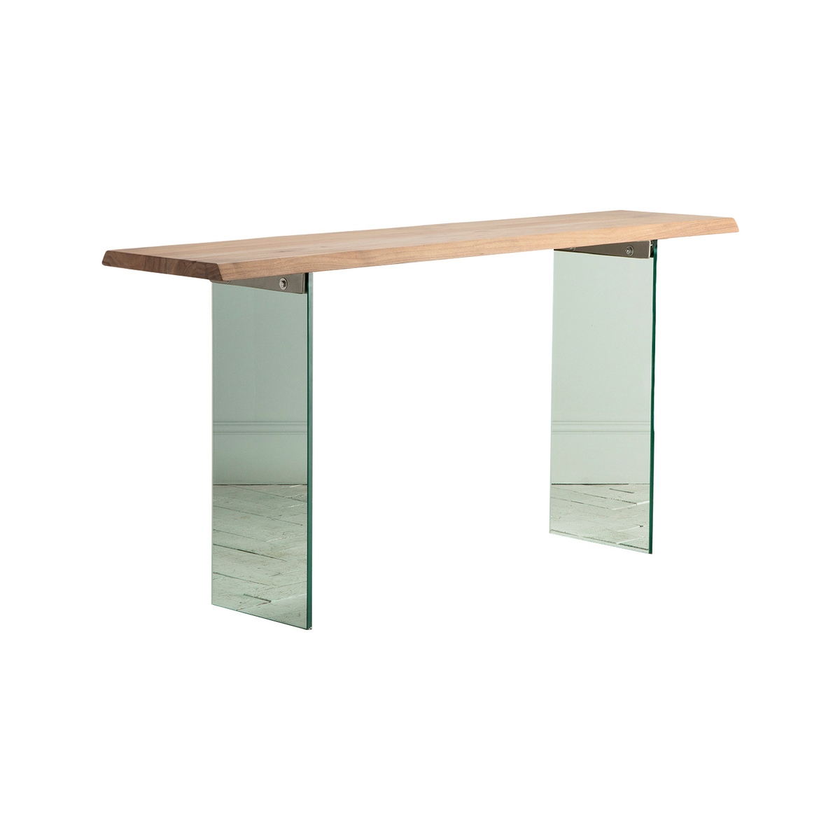 I really like this console because of its sleek, modern look with the glass legs and natural wood top, making it a versatile piece for various interiors. It works particularly well in contemporary or minimalist spaces, and can be styled as a statement piece in an entryway, behind a sofa, or even along a hallway. Practical styling tips include adding a few decorative accents like a vase, a stack of coffee table books, or a table lamp to create visual interest. Its clean lines and neutral materials also mean it can be effortlessly combined with both colours and textures, making it a flexible addition to many interiors.