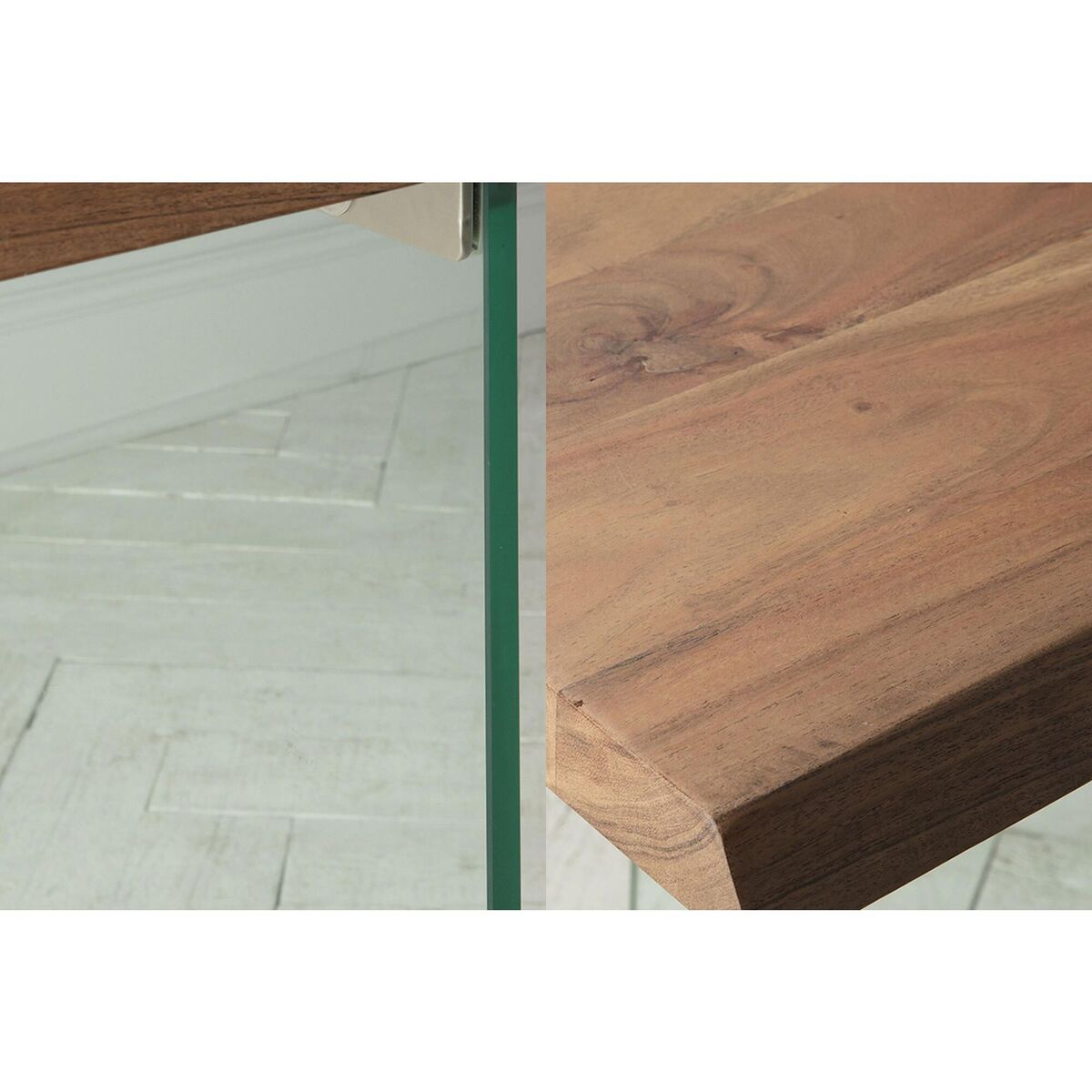 A sophisticated touch of rusticity. Create the entertainment room of your dreams, the Reign range will stand out and command attention, from the most elegant of dining rooms to the most simple of kitchens. Pared-back design with long, slab wooden waney edge table top with a subtle smooth weathered finish. Mixed beautifully with thick glass legs to balance the industrial design with a touch of modern country.
