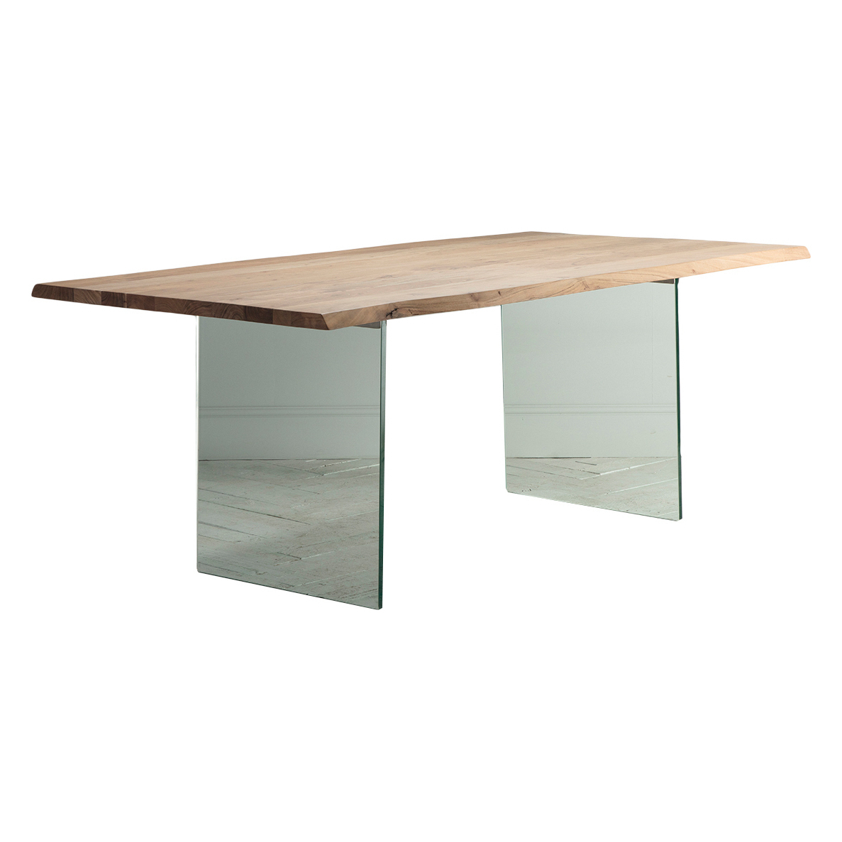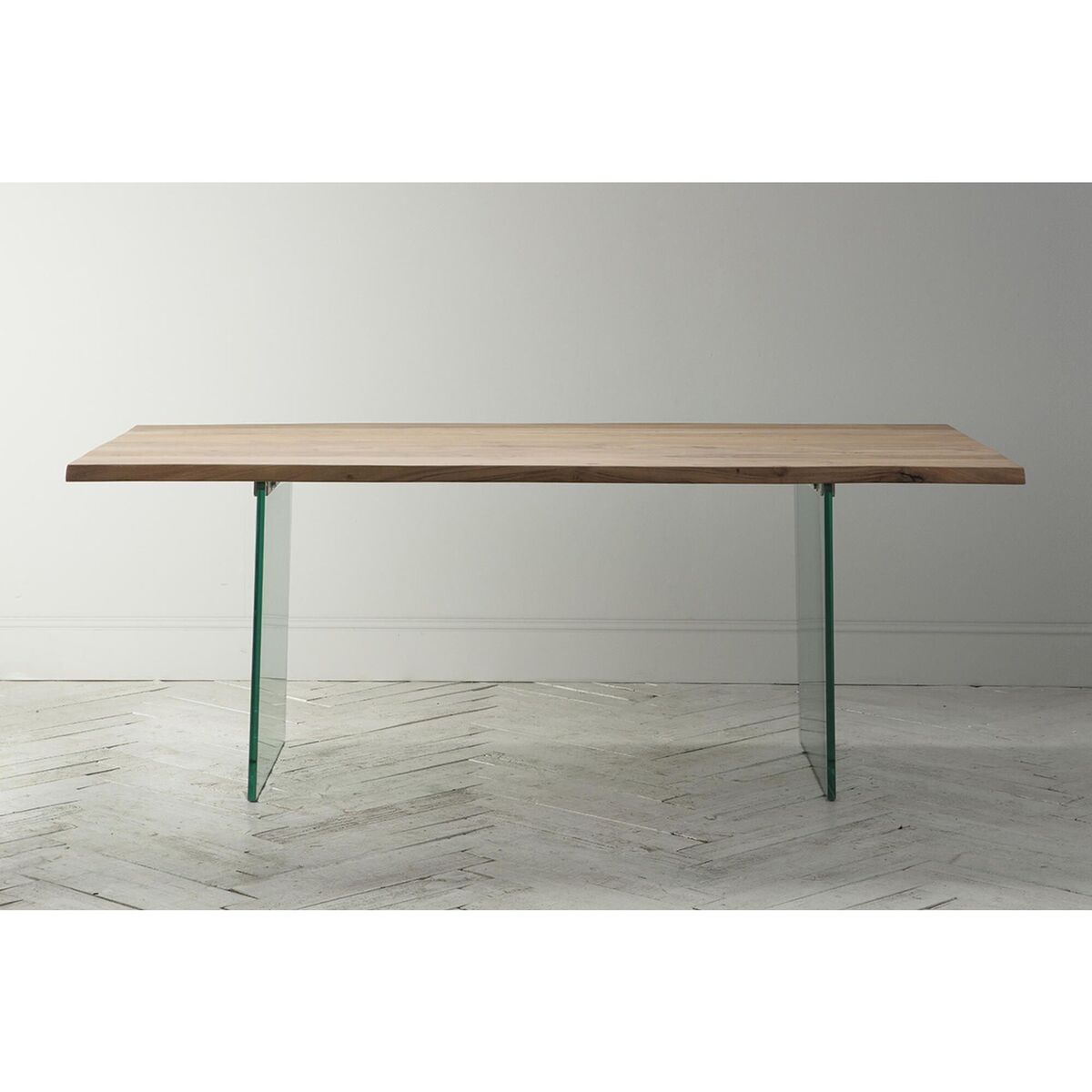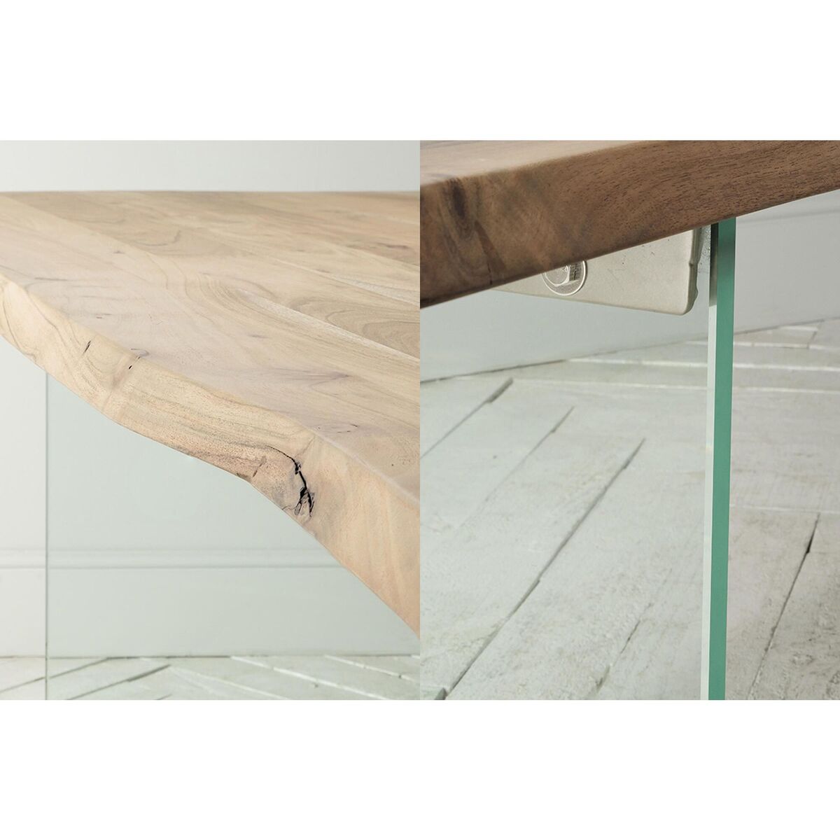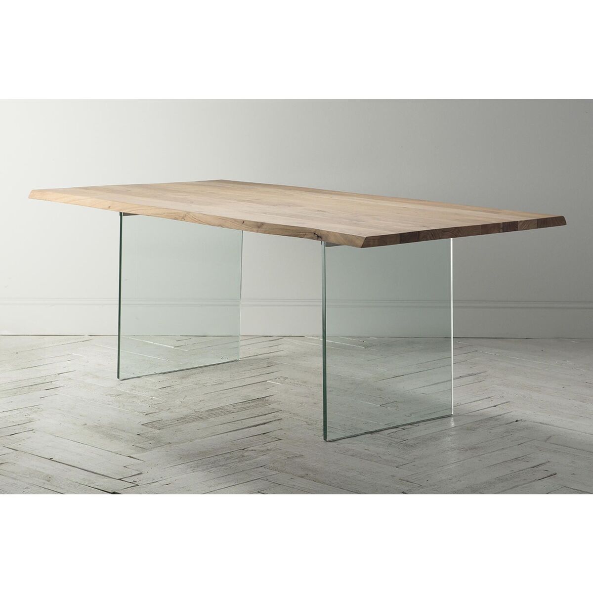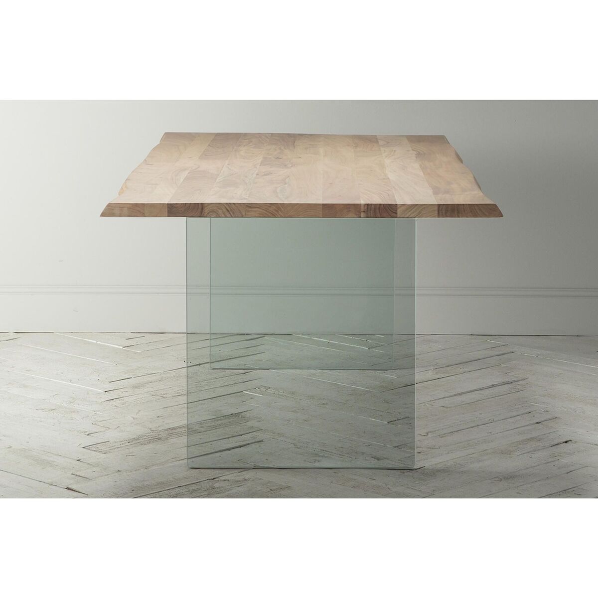 A sophisticated touch of rusticity. Create the entertainment room of your dreams, the Reign range will stand out and command attention, from the most elegant of dining rooms to the most simple of kitchens. Pared-back design with long, slab wooden waney edge table top with a subtle smooth weathered finish. Mixed beautifully with thick glass legs to balance the industrial design with a touch of modern country.
