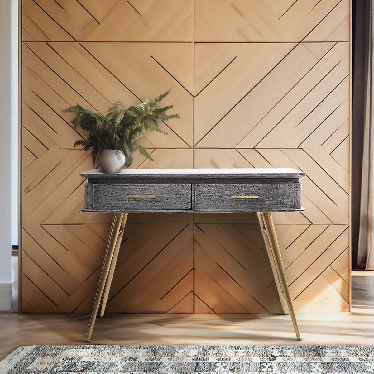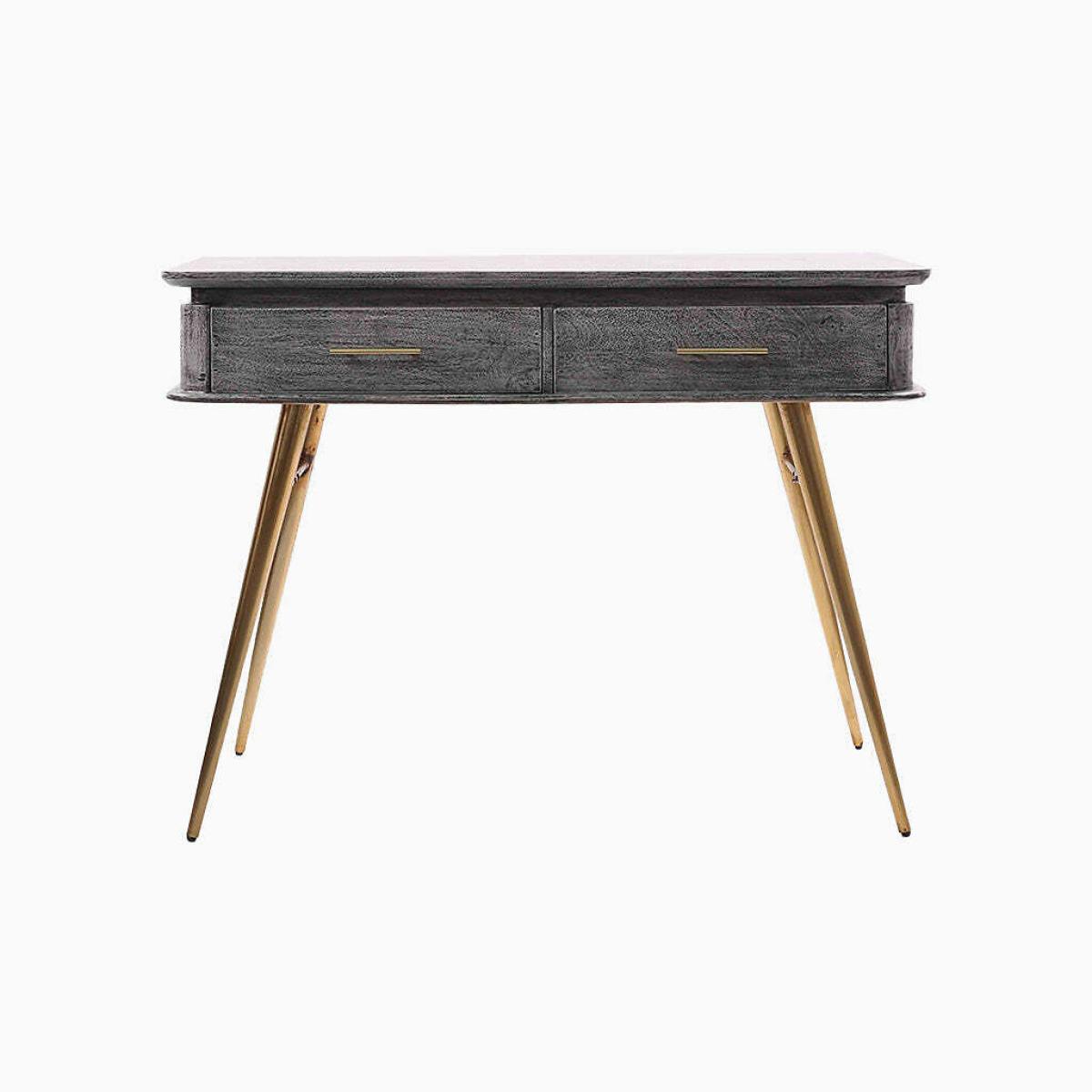 True to its name, the Reign console exudes grandeur with a refined blend of materials—a grey-finished mango wood tabletop rests elegantly atop striking gold-toned angular iron legs. Featuring two spacious drawers, it offers both style and practical storage. Perfectly suited for a hallway, living room, or dining area, this console is a distinguished addition to any sophisticated home. Product details• Mango wood tabletop• Gold iron legs• Number of drawers:2• Full assembly required. Product Composition - Mango Wood,Metal. Product Dimensions - 110 cm x35 cm x77 cm , Weight - 24 KG• Internal drawer: 11 x 42 x 30 cm• Clearance to floor: 57 cm Package Dimensions - 118 cm x 45 cm x 34 cm, Weight 28 kg. This product will be dispatched by one of our trusted suppliers. You’ll be contacted by their selected courier about your delivery.