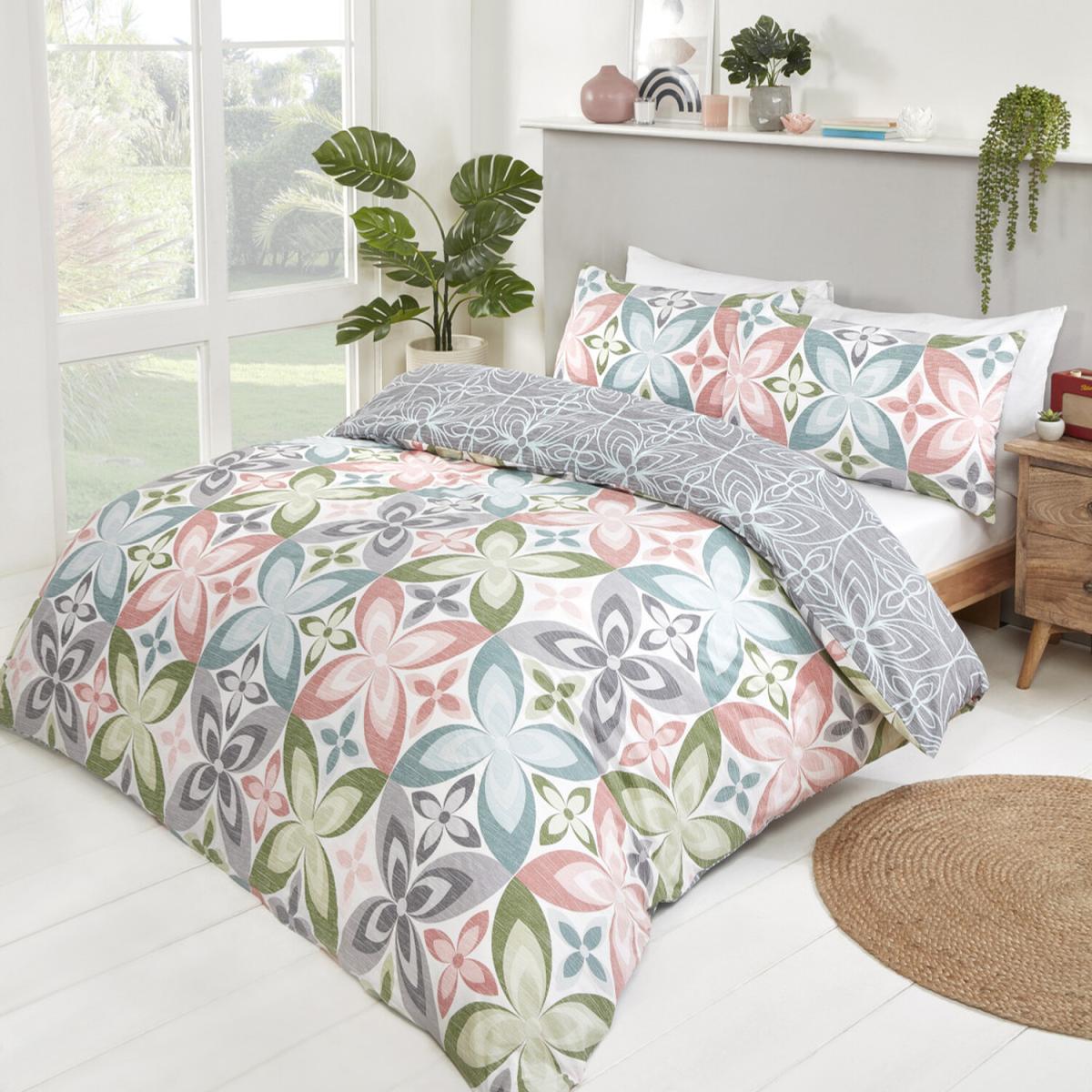 Our beautiful Reileigh design has a 70s retro feel, using muted colours ,grey, olive green, duckegg and blush. This geometric is printed with a linen effect texture and a simple tonal grey reverse. Reiliegh will bring a sense of harmony to any bedroom.