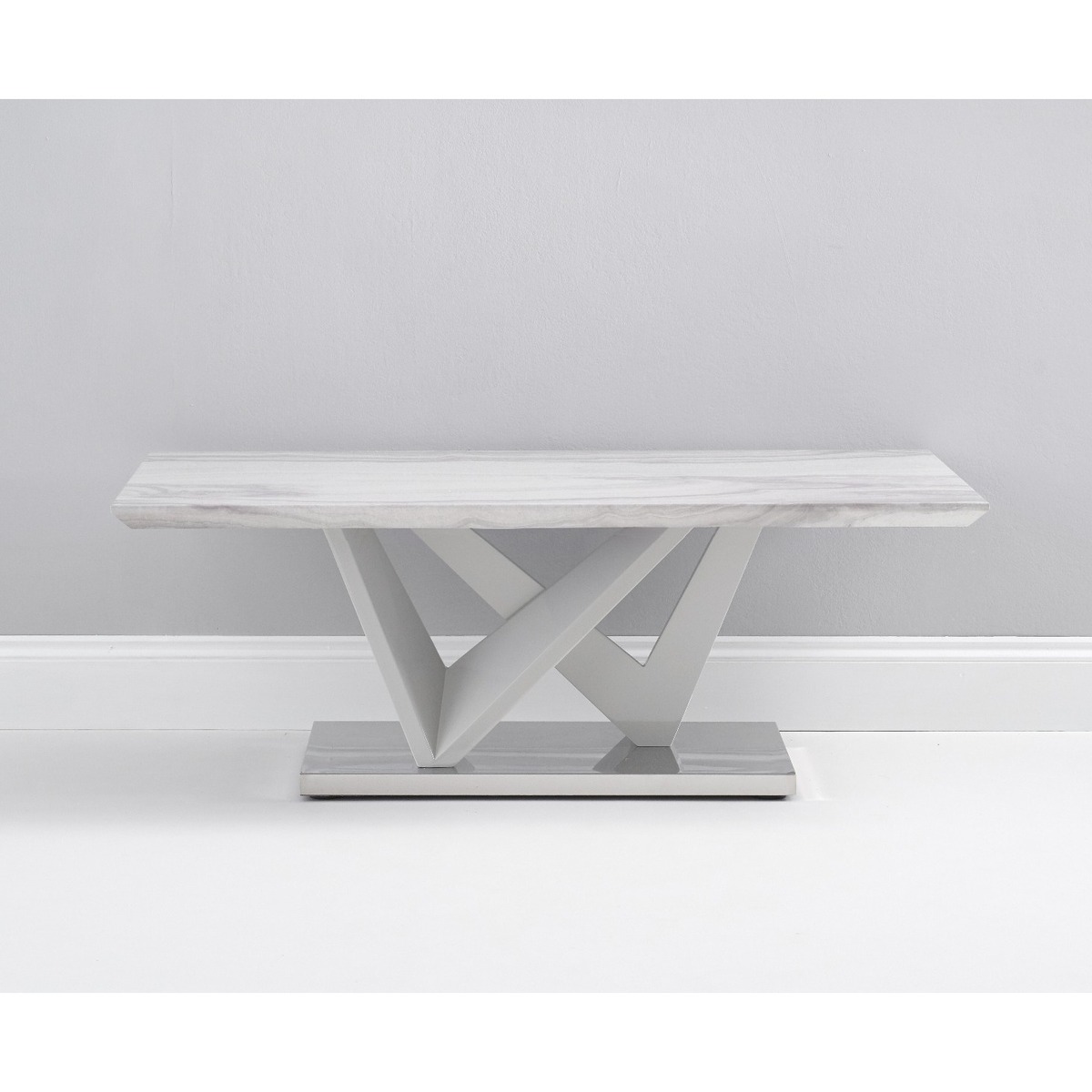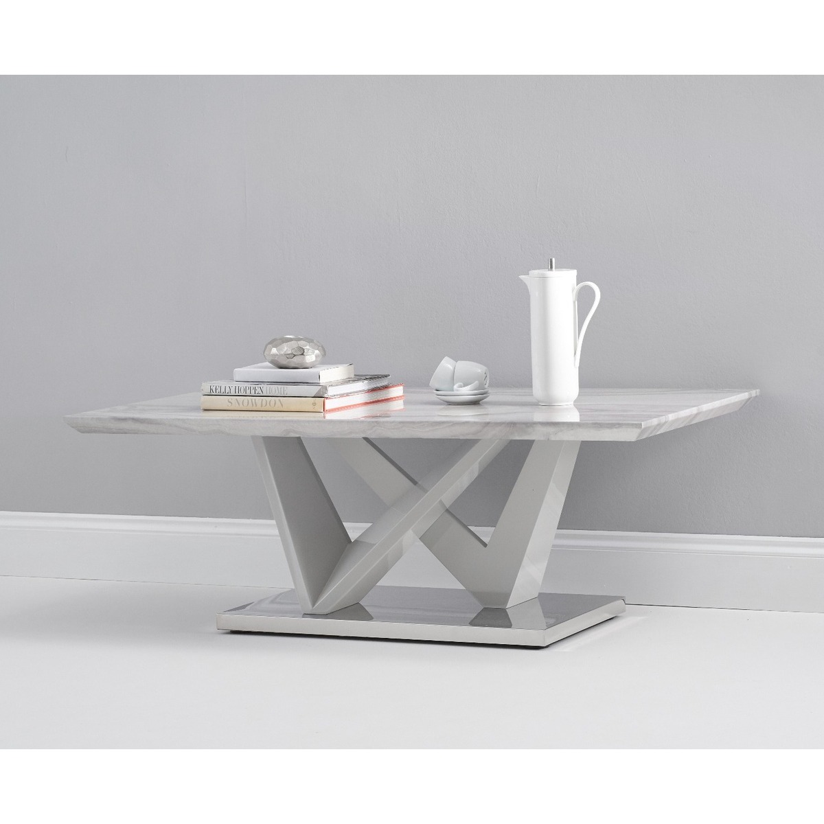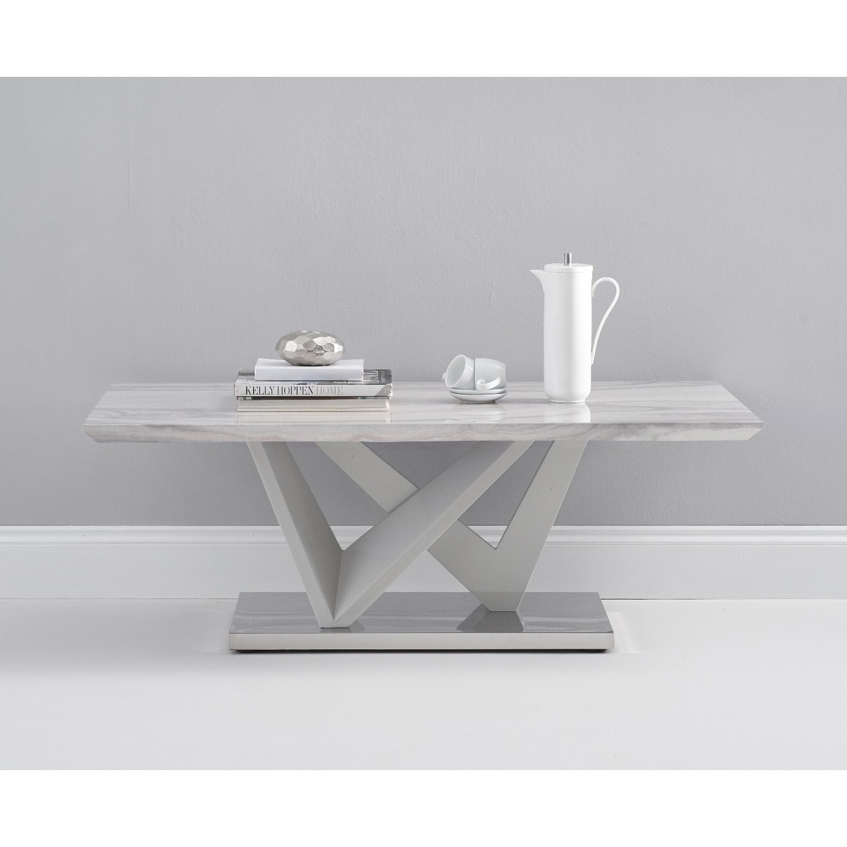 Modern, sophisticated and statement, the stunning Reims Coffee Table boasts a gorgeous light grey-veined marvbel effect Carrera table top with a super slick and sleek high gloss layer, and modern angled edges to finish. Supported by a unique cross-effect pedestal stand and a thick, shining silver metal plate base. The perfect mix of minimal, contemporary design, lasting function, and lust-worthy luxury. Strong Carrera marble makes for stunning style that lasts. A high gloss finish to the marble adds a sleek, luxe finish. A statement cross-effect stand and metal plate base adds unique style, and stability A minimal white and grey colour combo is forever chic. Designed to match the full Reims collection. Also available: Reims 150cm Grey Marble Effect Dining Table, Reims Grey Marble Effcet Side Table, Reims Grey Marble Effect Console Table