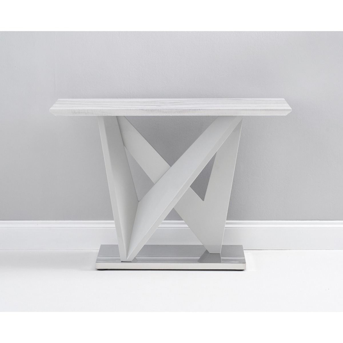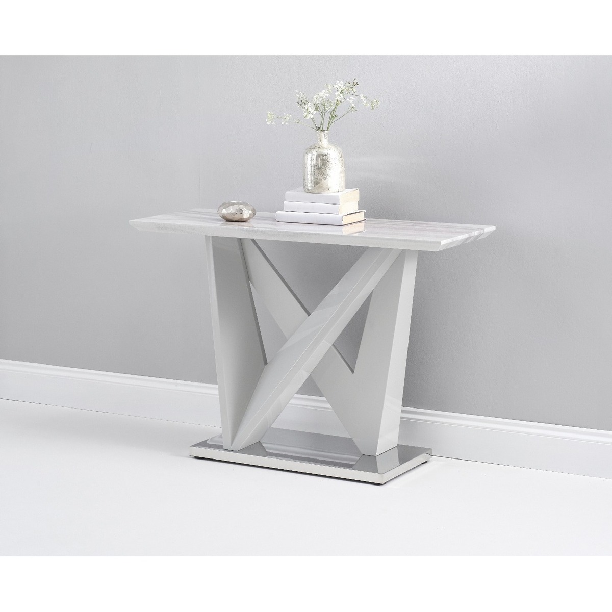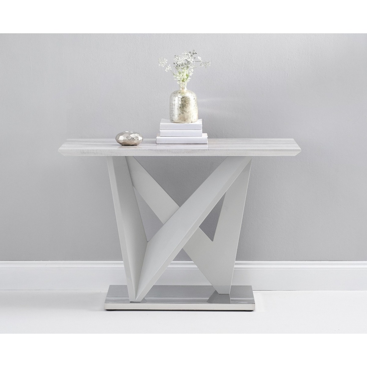 Modern and minimal, the chic but statement Reims Console Table boasts a gorgeous light grey-veined Carrera Marble table top with a slick and stylish high gloss layer, and tapered angled edges to finish. Sat on a unique angle-legged pedestal and a thick, shining silver metal plate base. Solid and durable Carrera marble effect finish makes for stunning style that lasts. High gloss to the marble adds a sleek finish. A statement stand and shining metal plate base adds unique, stable style. A minimal white and grey colour combo is versatile, minimal and timeless. Designed to match the full Reims collection. Also available: Reims 150cm Grey Marble Effect Dining Table, Reims Grey Marble Effect Coffee Table, Reims Grey Marble Effect Console Table