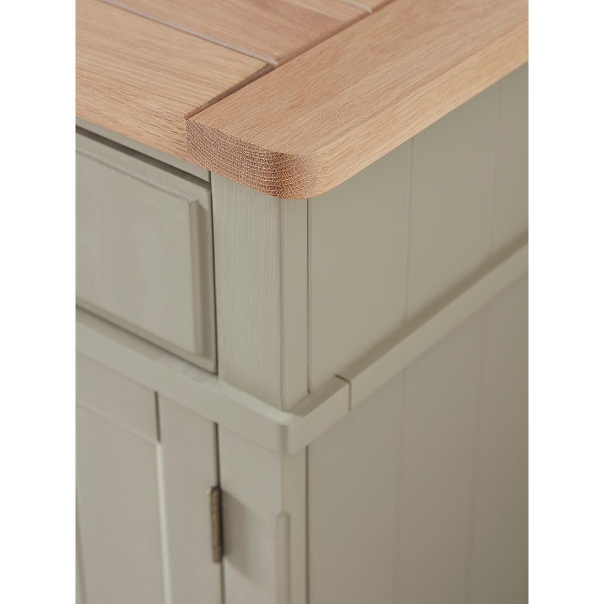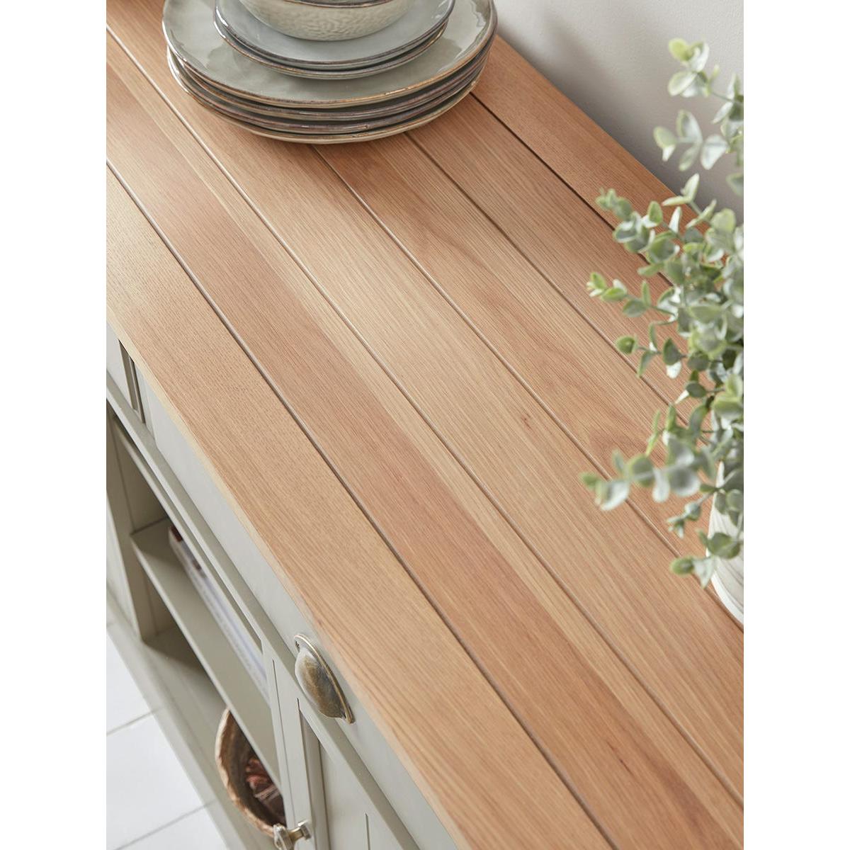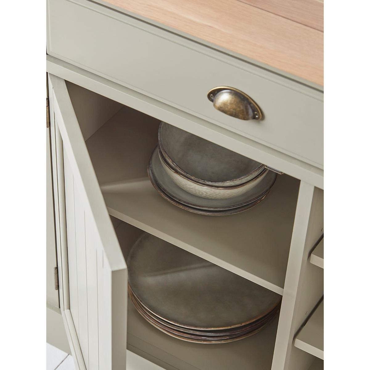 Our Reims Sideboard is a sturdy farmhouse style cabinet with a charming rustic feel. With a base painted in a warm and adaptable matte sage grey and a top of grooved oak, the cabinet offers adaptable storage space for a variety of uses. Two wide drawers sit above two cupboards which flank a central area of shelving. A matching kitchen unit is also available.