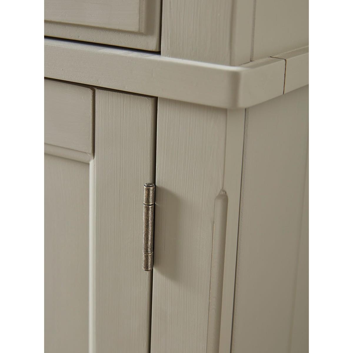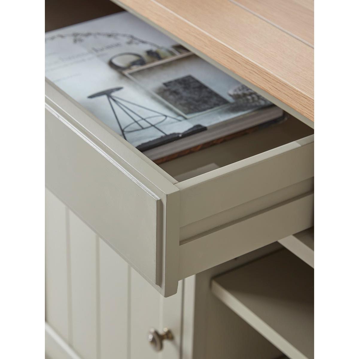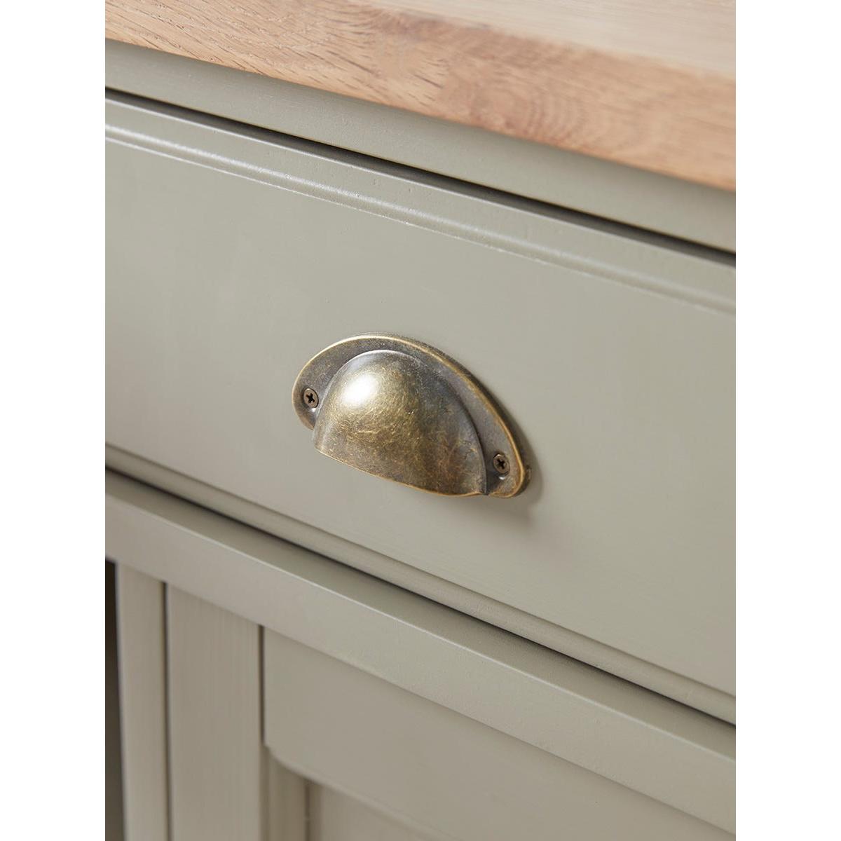 Our Reims Sideboard is a sturdy farmhouse style cabinet with a charming rustic feel. With a base painted in a warm and adaptable matte sage grey and a top of grooved oak, the cabinet offers adaptable storage space for a variety of uses. Two wide drawers sit above two cupboards which flank a central area of shelving. A matching kitchen unit is also available.